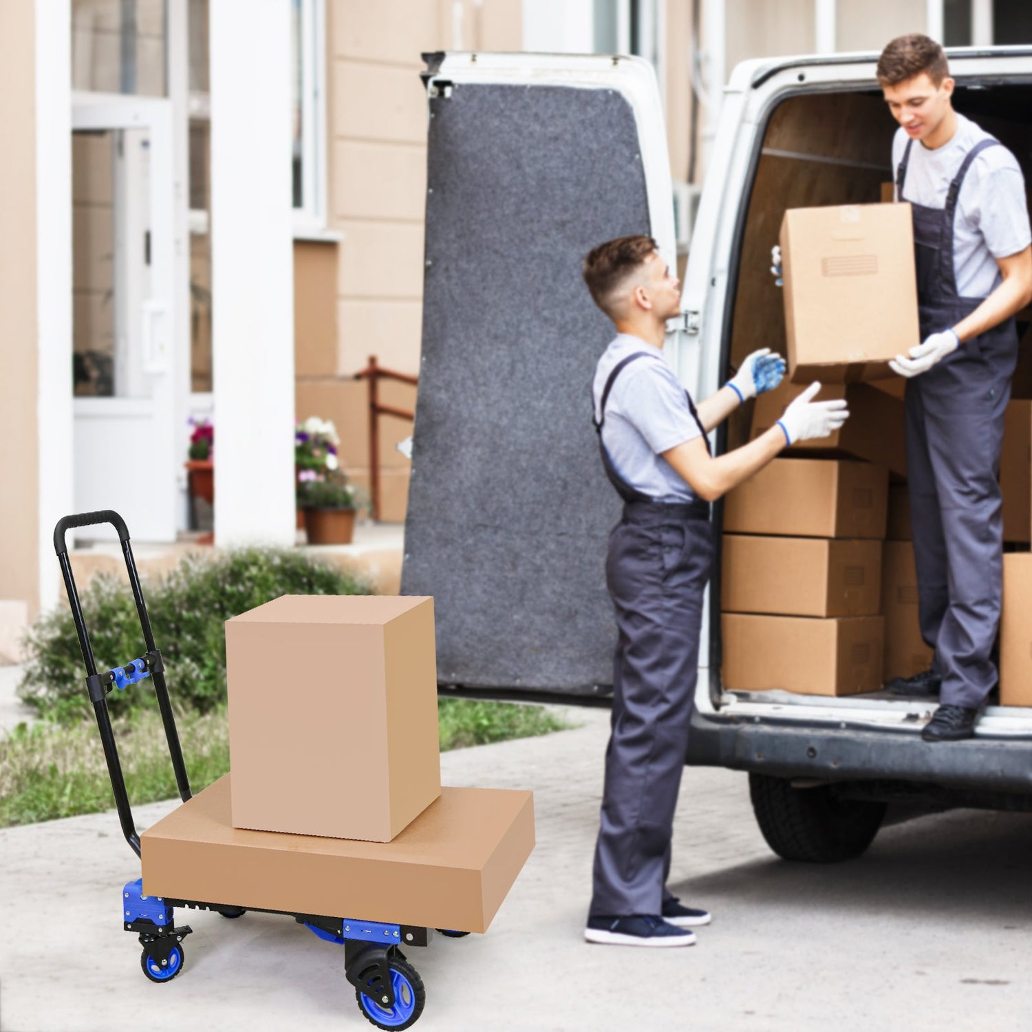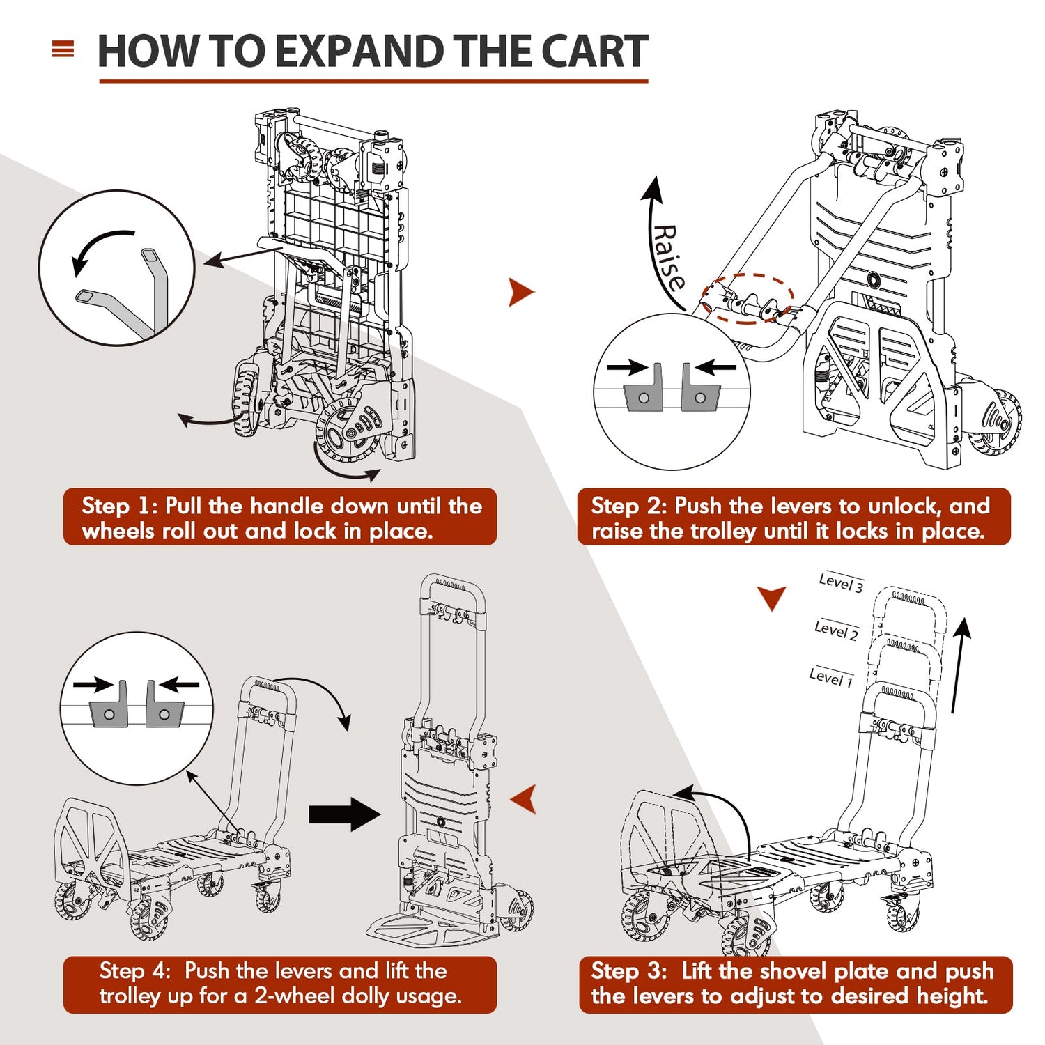 - Heavy Duty Dolly: The hand truck is made of a durable steel and polypropylene material frame structure. 4-wheel cart weight capacity is 330lbs and 2-wheel hand truck weight capacity is 165lbs.