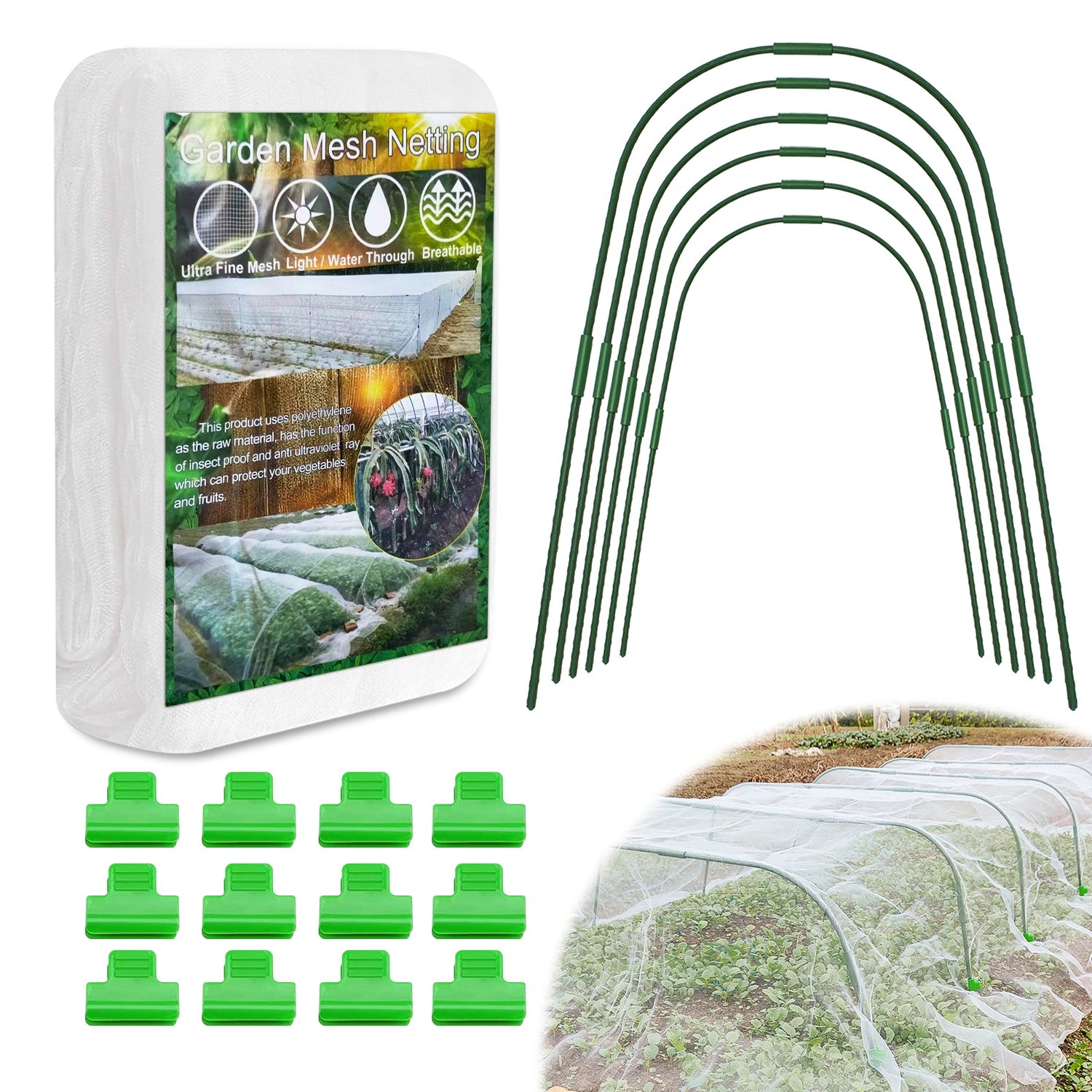 Garden Netting Kit with 8 x 20 ft Mesh Plant Cover, 6 Packs of Garden Hoops, and 12 Clips