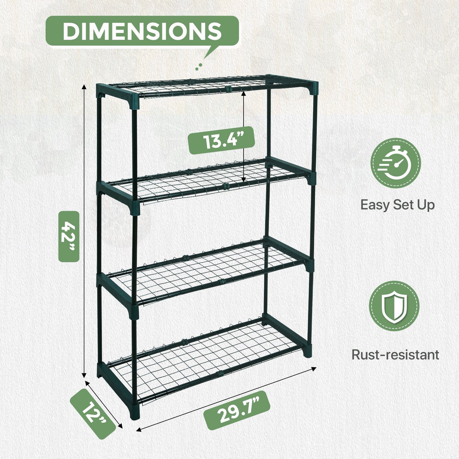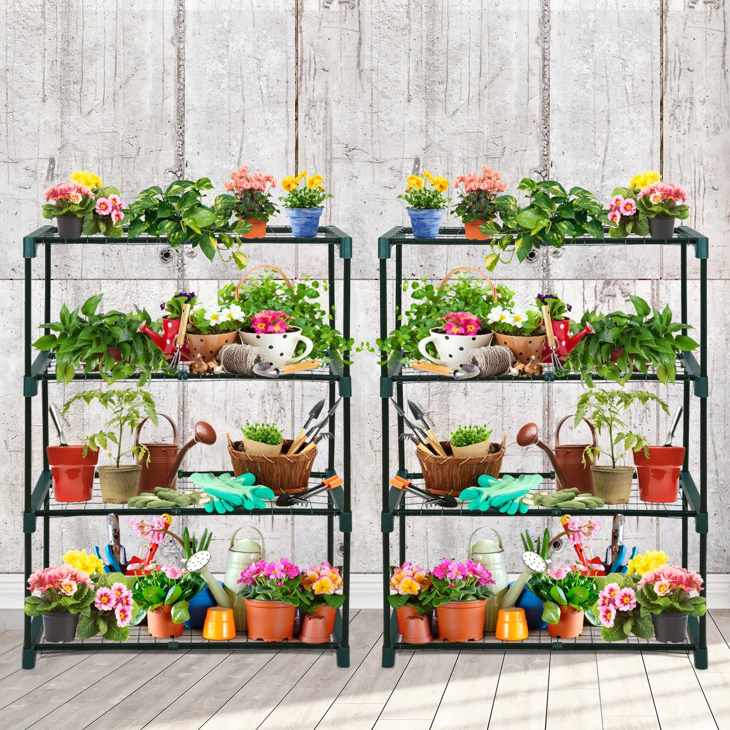 VERSATILE USE: This 4-shelf staging unit is not only used as greenhouse staging, also can be used a bookshelf, display stand, kitchen shelf, or garage storage. It is perfect for outdoor and indoor use, also a nice gift for your gardener friends.