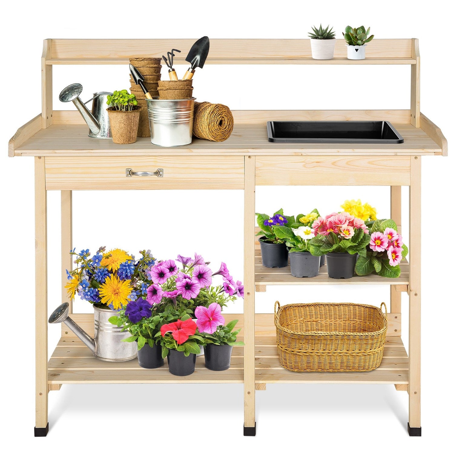 - LARGE STORAGE SPACE: The potting bench is crafted with a sliding drawer for sharp tools to avoid accidental injury. The two open bottom shelves are great for organizing fertilizer, gardening tools and other potting accessories. Included is a bonus set of three side hooks for handing bags, tubes, towels, and you can place it anywhere you would like!
