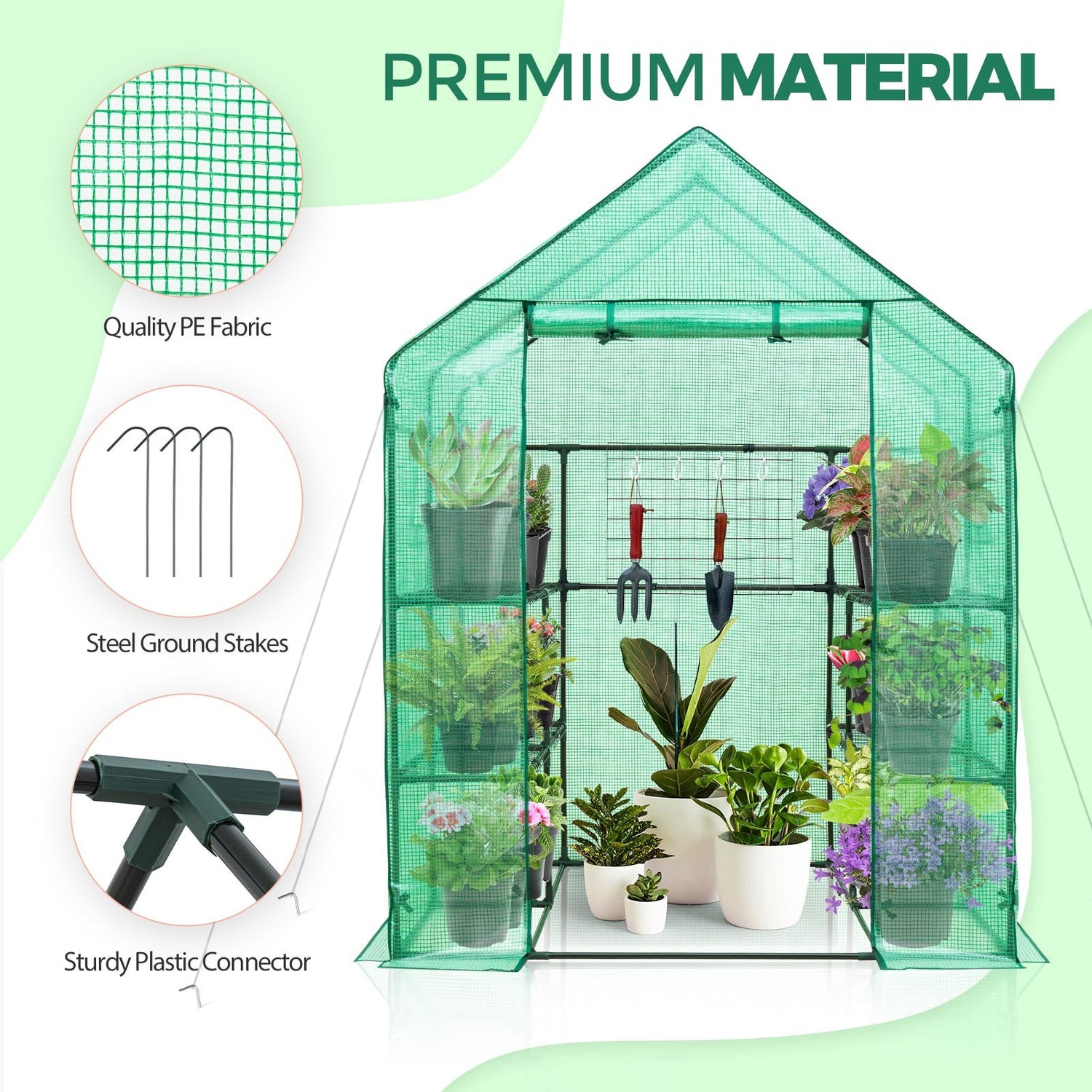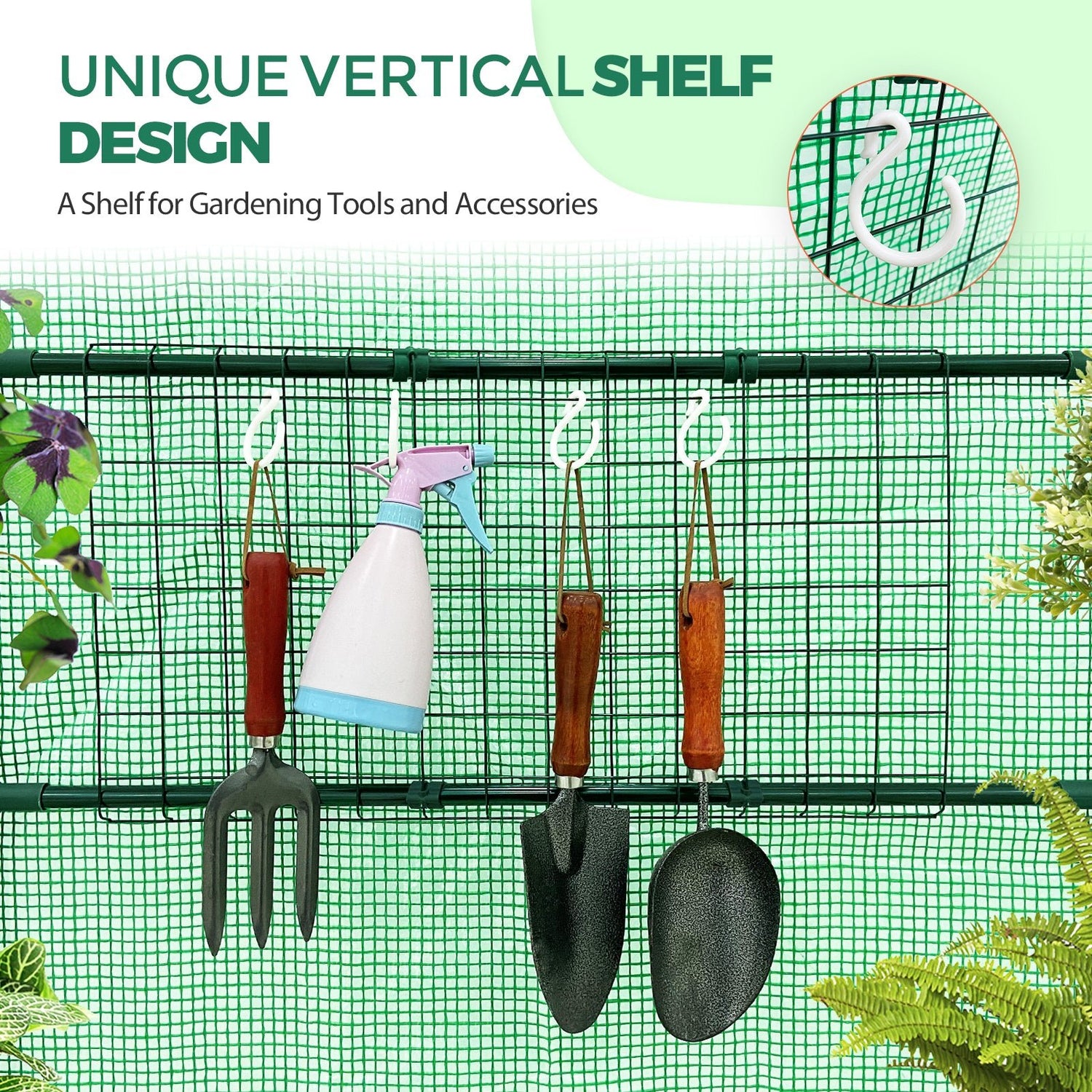 Functional Vertical Shelf: Comes with one vertical shelf on the back of the greenhouse and 10 hooks for hanging your garden tools, like gloves, bags, and other small accessories.