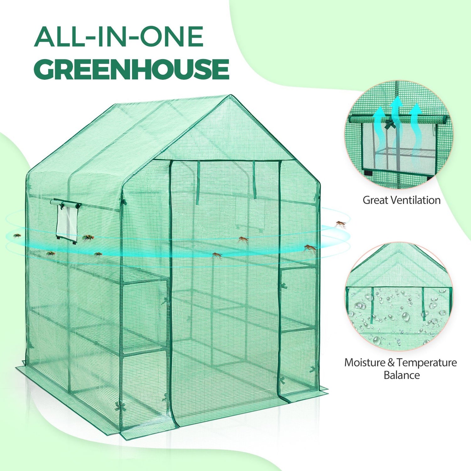 Space To Work: This greenhouse measures 56'' x 56'' x 76'', features 8 wire shelves, 4 on each side. The walk-in design features plenty of room for your plants to grow and for you to move around and work.