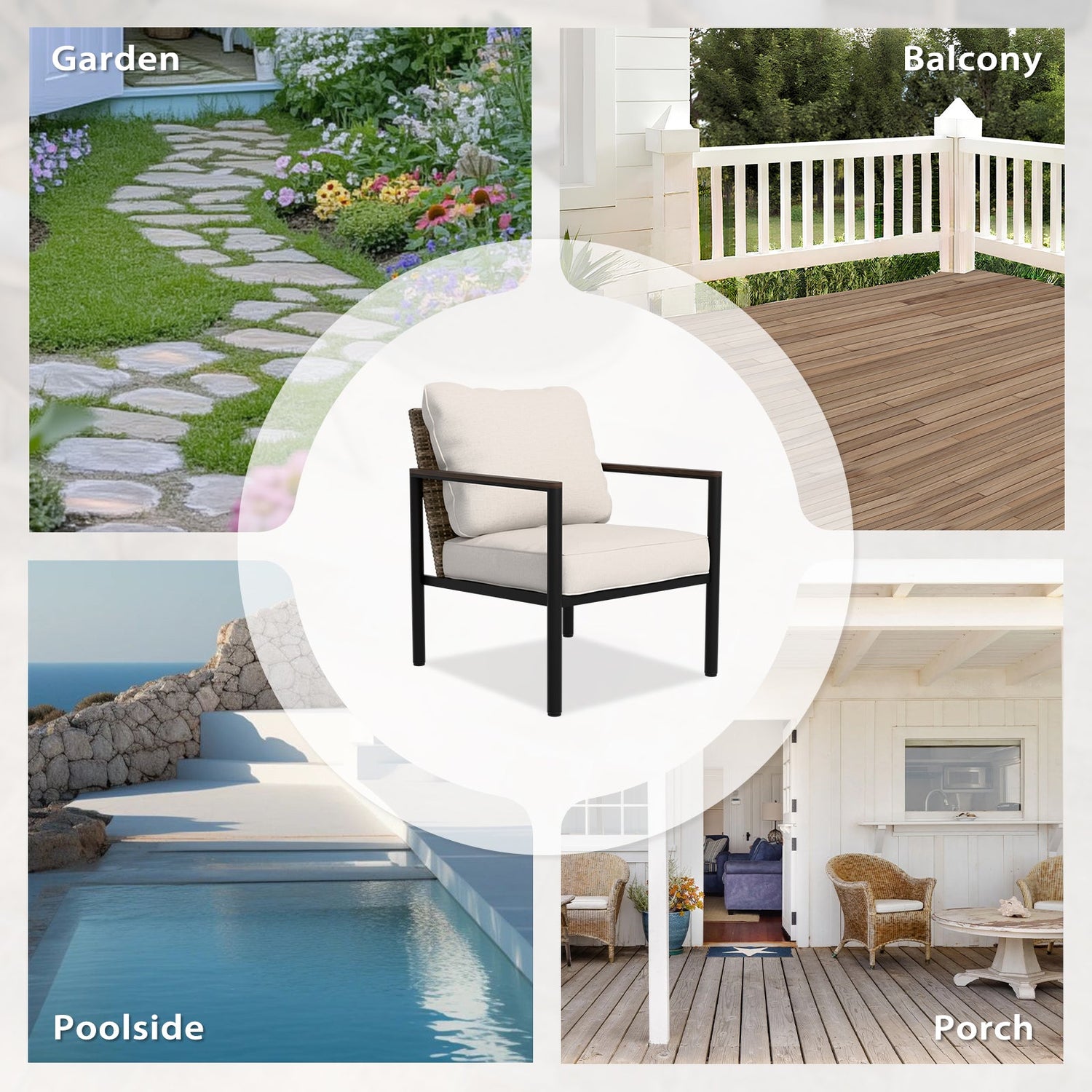 MODERN OUTDOOR LIVING: Sink into plush padded 4 inch thick cushions while the timeless wicker design and soft neutral tones add a chic, inviting touch to your indoor or outdoor space; perfect for relaxing with a book or enjoying a coffee outdoors.