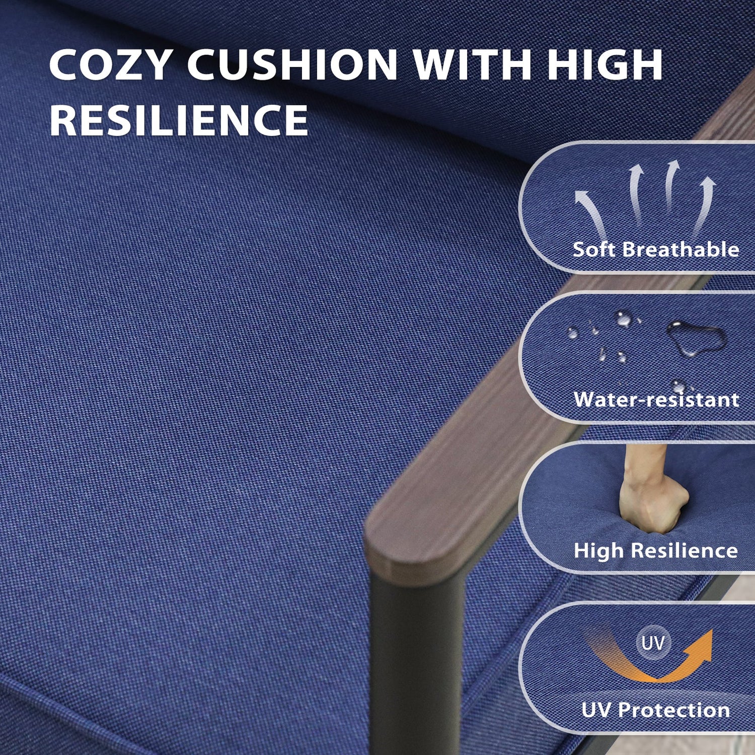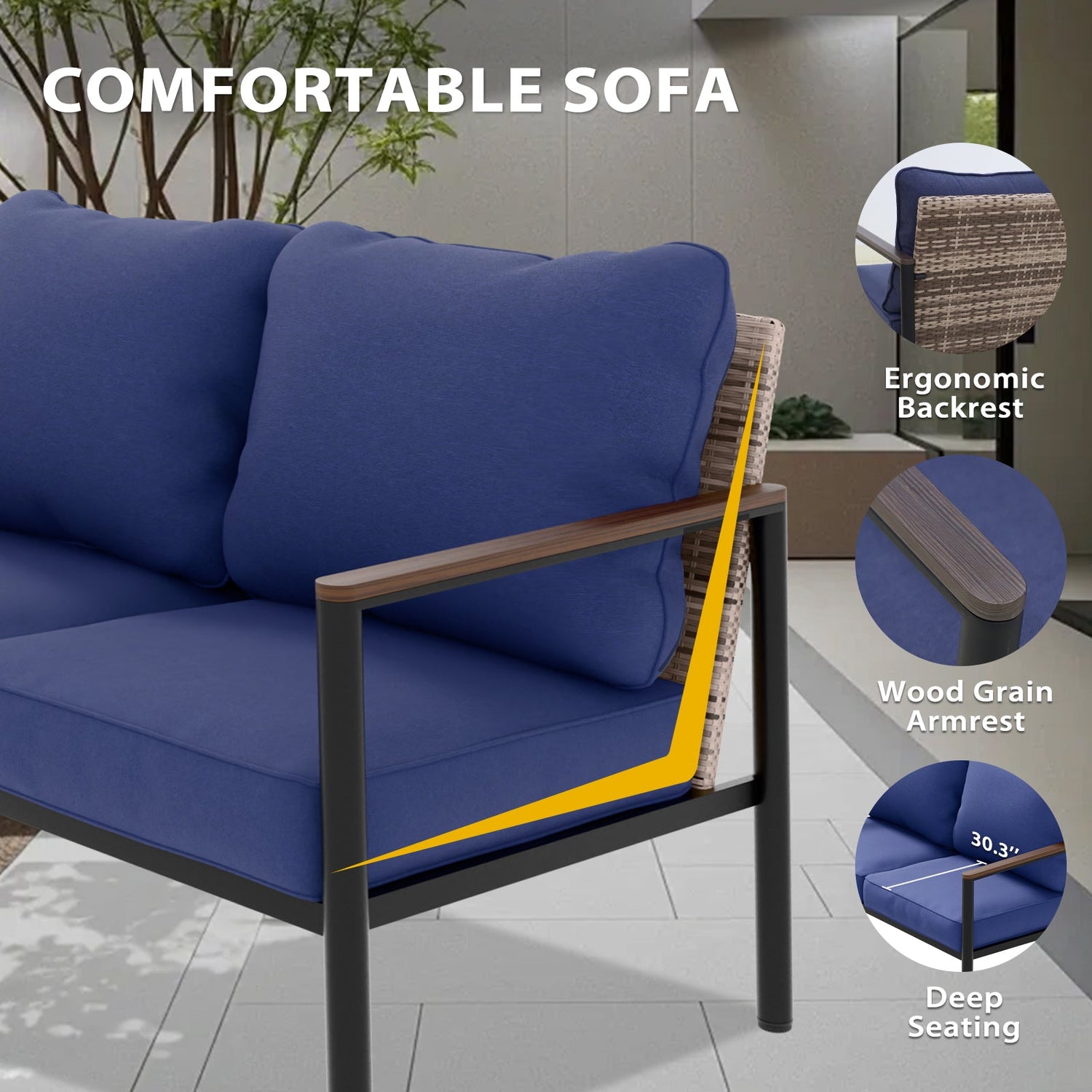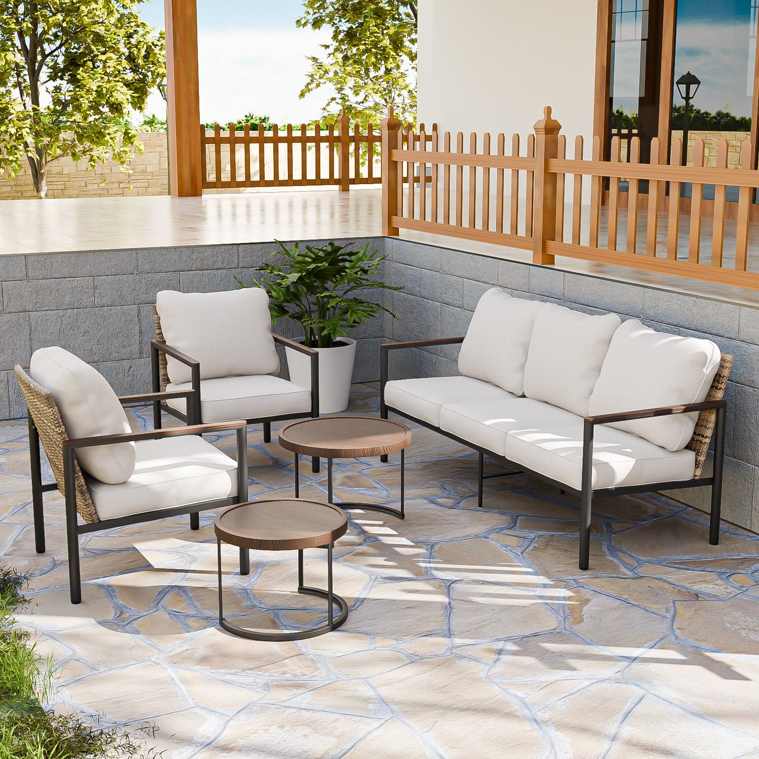 MODERN OUTDOOR LIVING: Elevate your outdoor space with this sleek, 5-piece wicker patio lounge set featuring 2 chairs, 1 couch, and 2 tables; this set combines chic wood grain accents and deep 4 inch thick cushions for added comfort, making it perfect for both relaxing and entertaining.