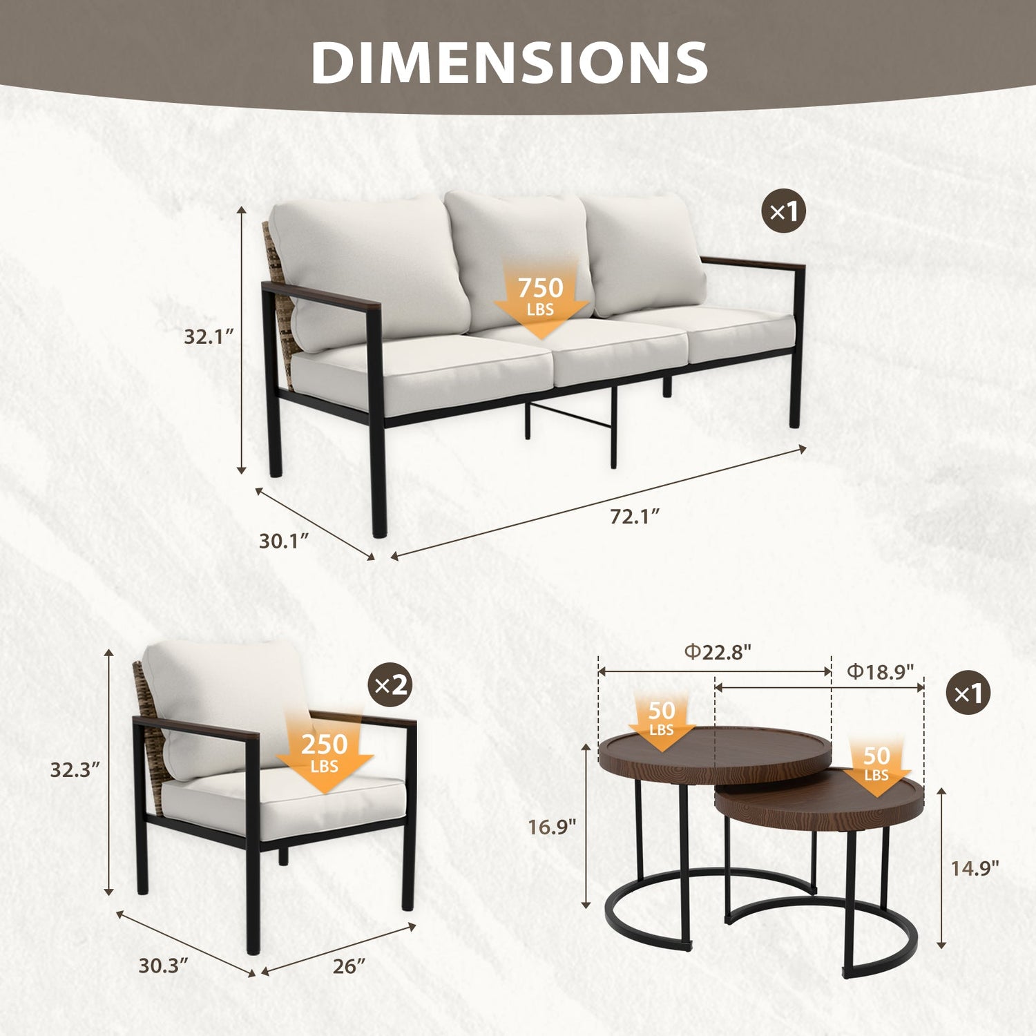 SPACIOUS & COMPACT DESIGN: Chairs measures 25.9" W x 30.3" D x 32.3" H and supports 250 lbs; couch measures 71.1" W x 29.9" D x 32.9" H and supports up to 750 lbs; tables measure 16.9" tall with a diameter of 22.8".