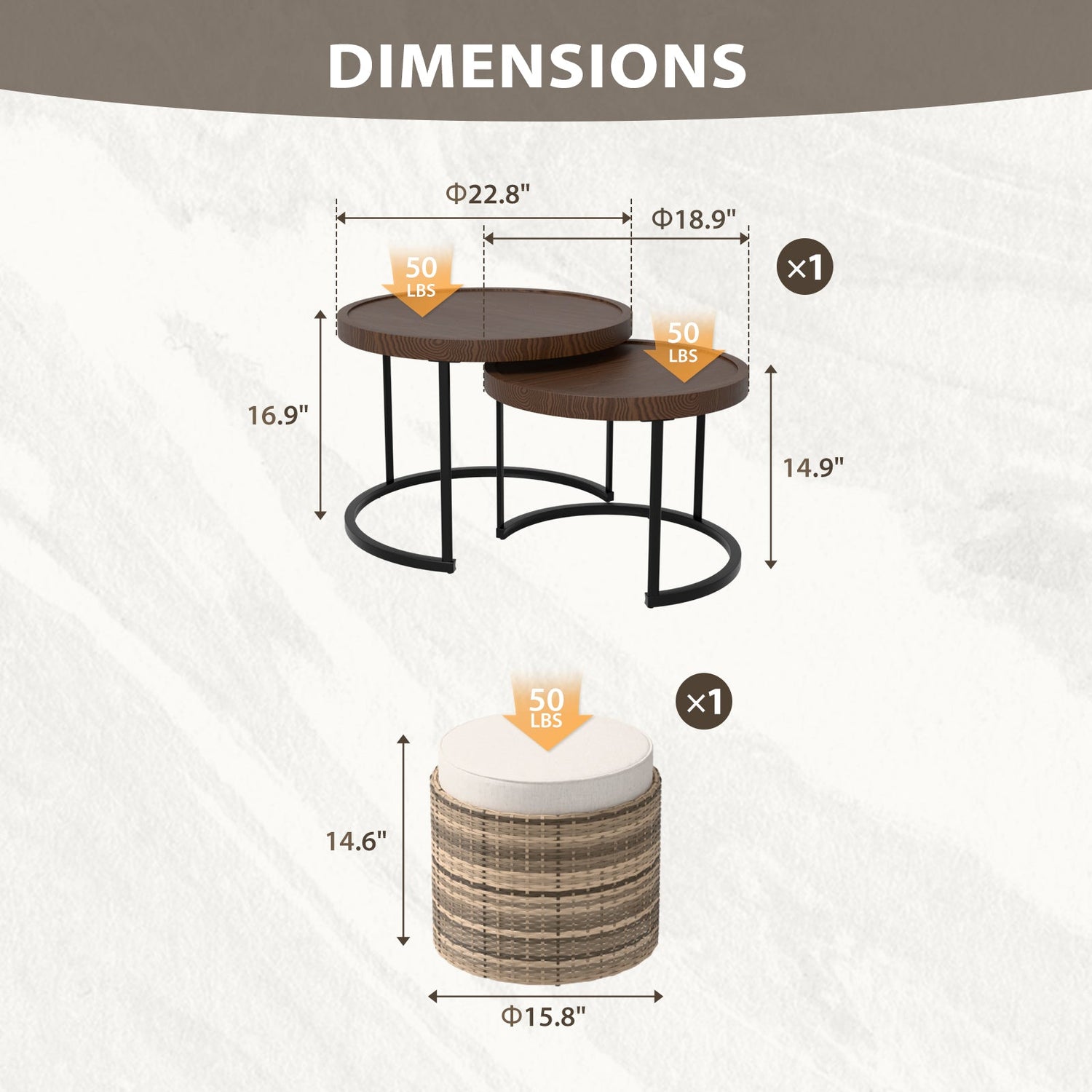 PERFECTLY SIZED: The nesting tables stand at a comfortable height of 16.9" with a diameter of 22.8", making them a great fit for any space; while the matching ottoman complements the set and fits under the smallest table without overwhelming your style.
