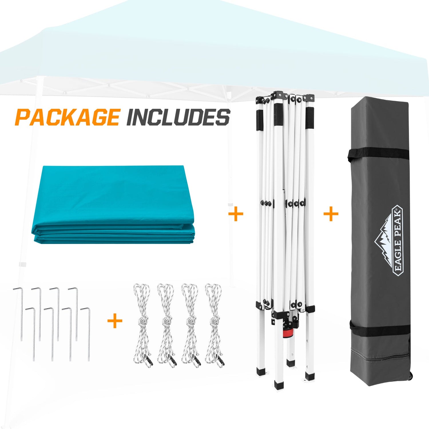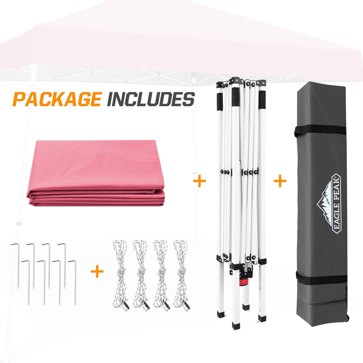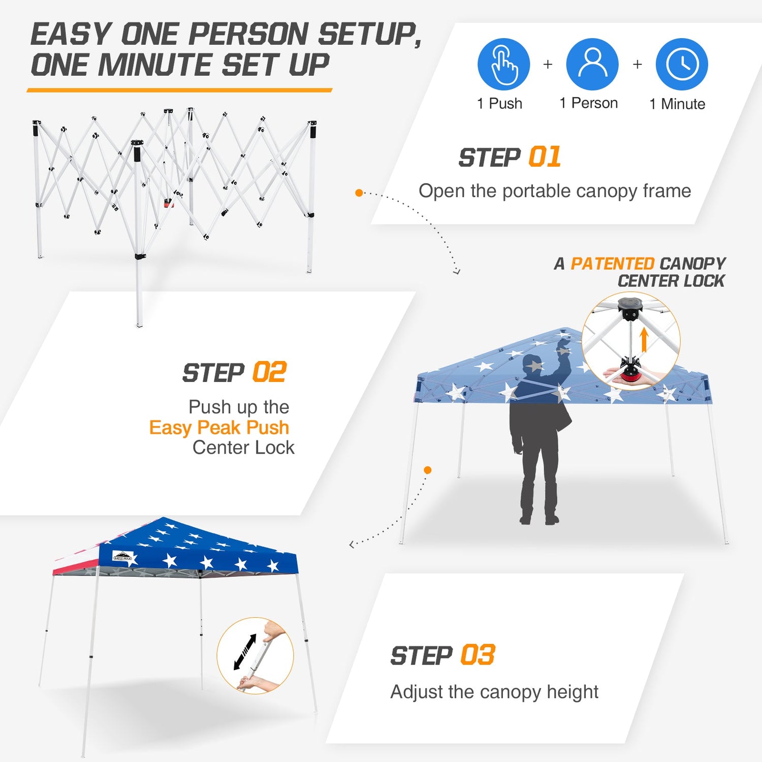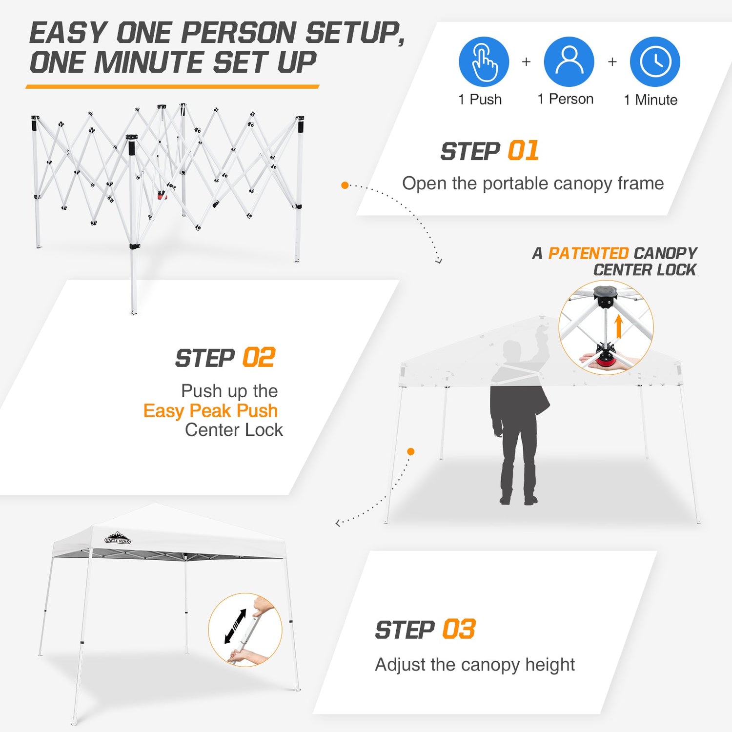 EASY SETUP: This easy setup pop up canopy tent features the Peak Push system, a patented canopy center lock. The portable canopy requires no tools and easily opens and closes from the center in seconds. Its unique canopy tent center lock enables a quick, one person setup, letting you maximize outdoor time with minimal effort.