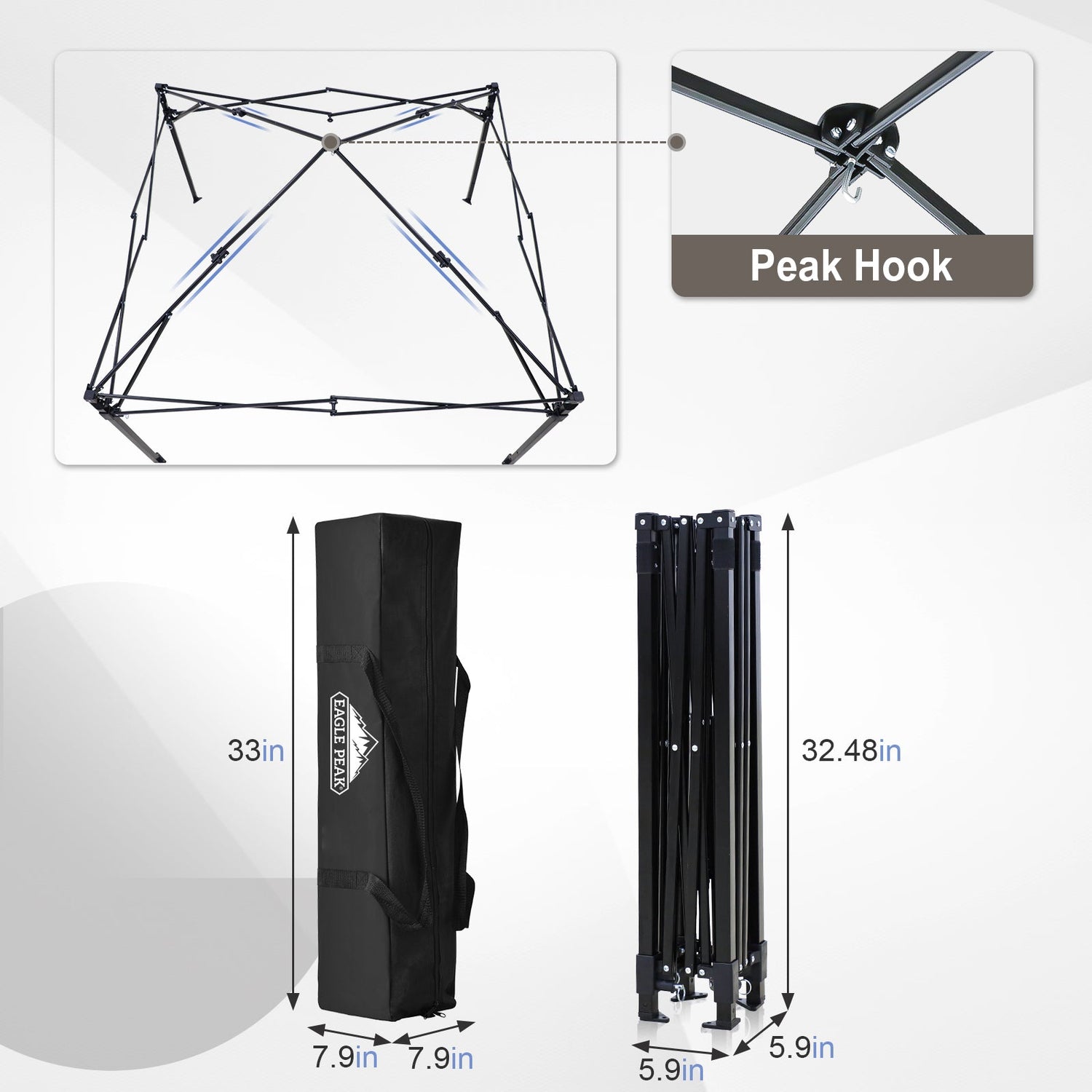 EASY TO SETUP AND PUT AWAY: The EAGLE PEAK fiberglass FLEX ceiling system is more flexible and makes setup easy. The frame glides when opening and closing, enabling one person to easily open and close the canopy.
