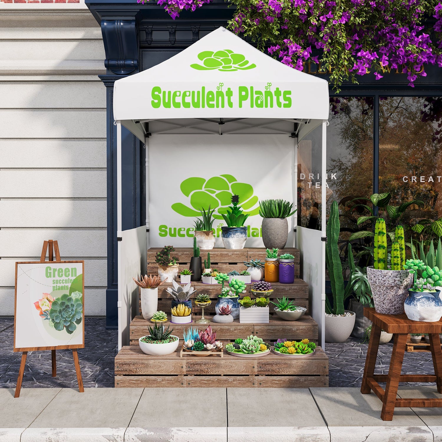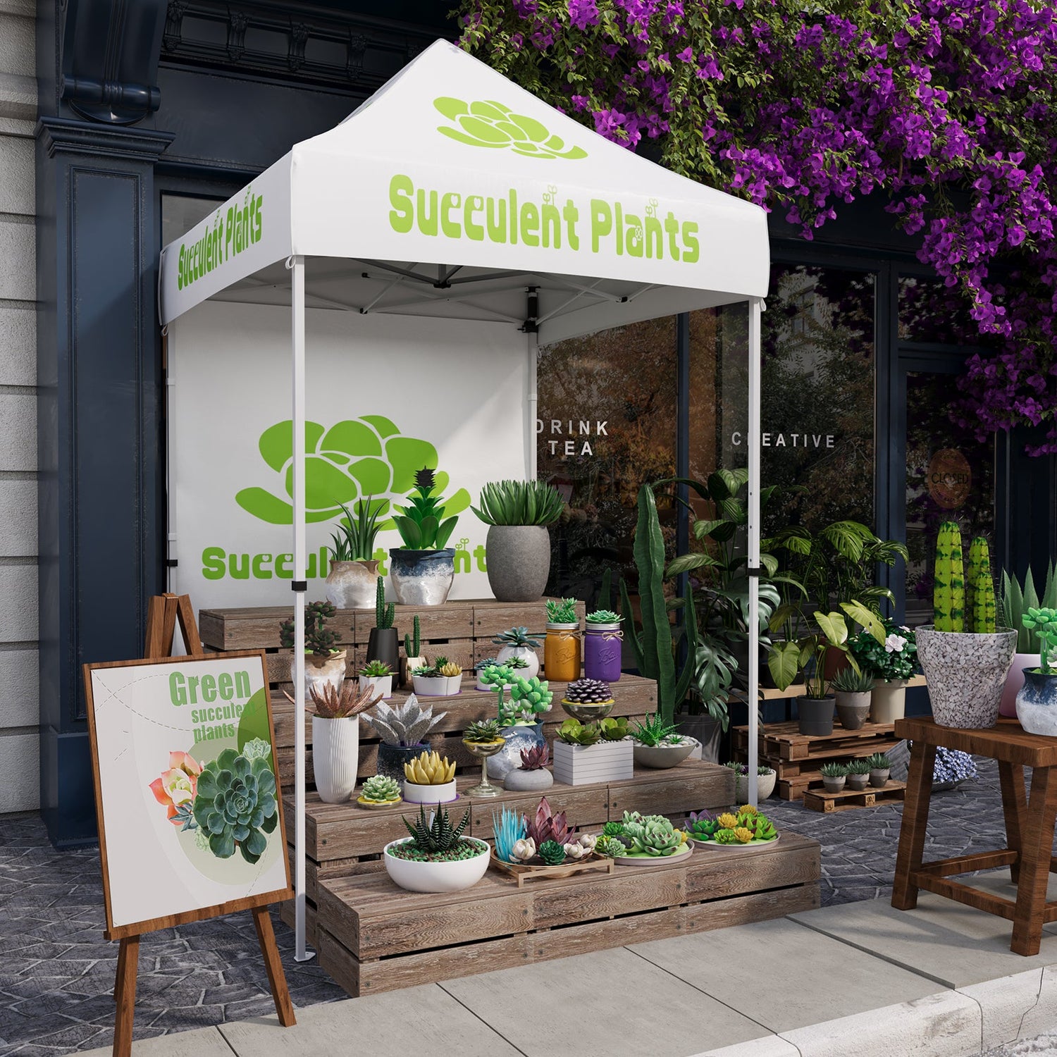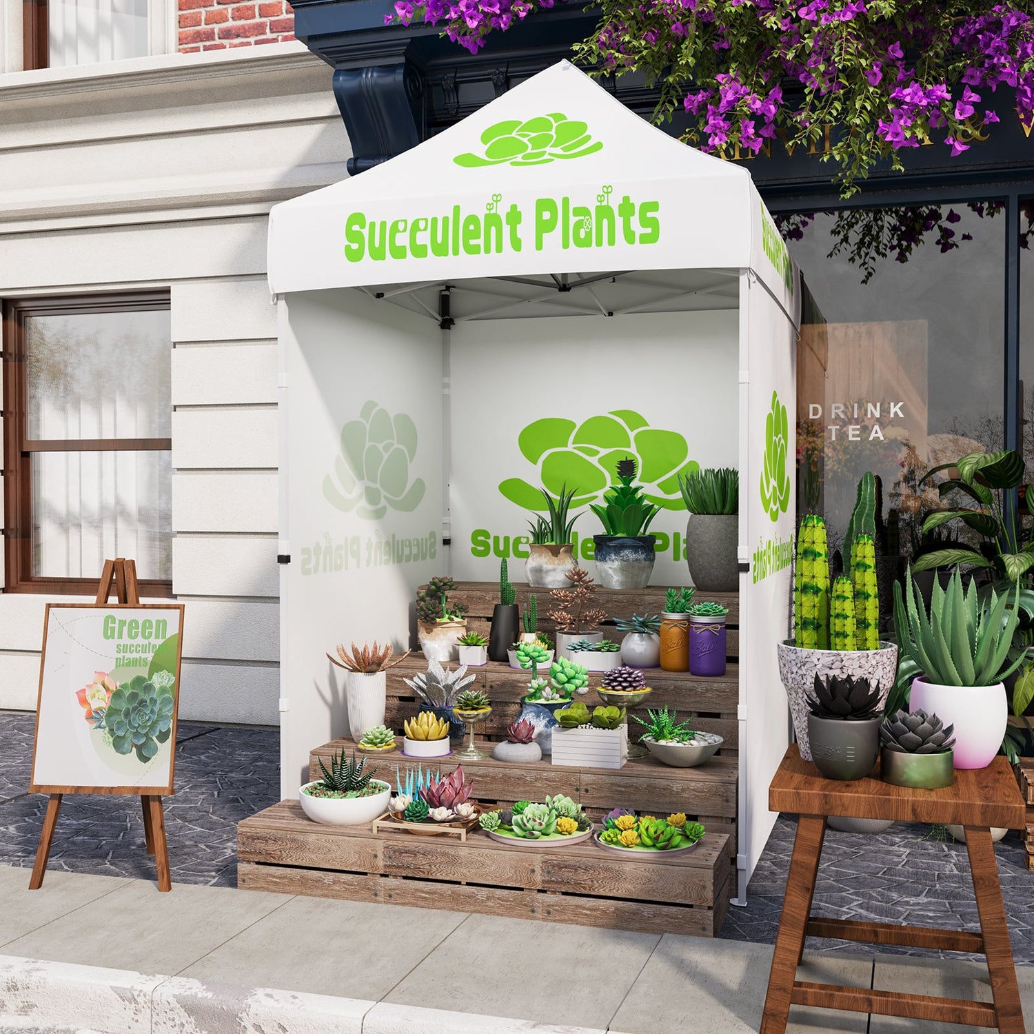 CUSTOM PRINTING: Your logo and design can be printed with 100% coverage on all outer surfaces of the canopy top. Complimentary products such as table covers, flags, and other accessories can also be ordered separately to promote your company and brand.