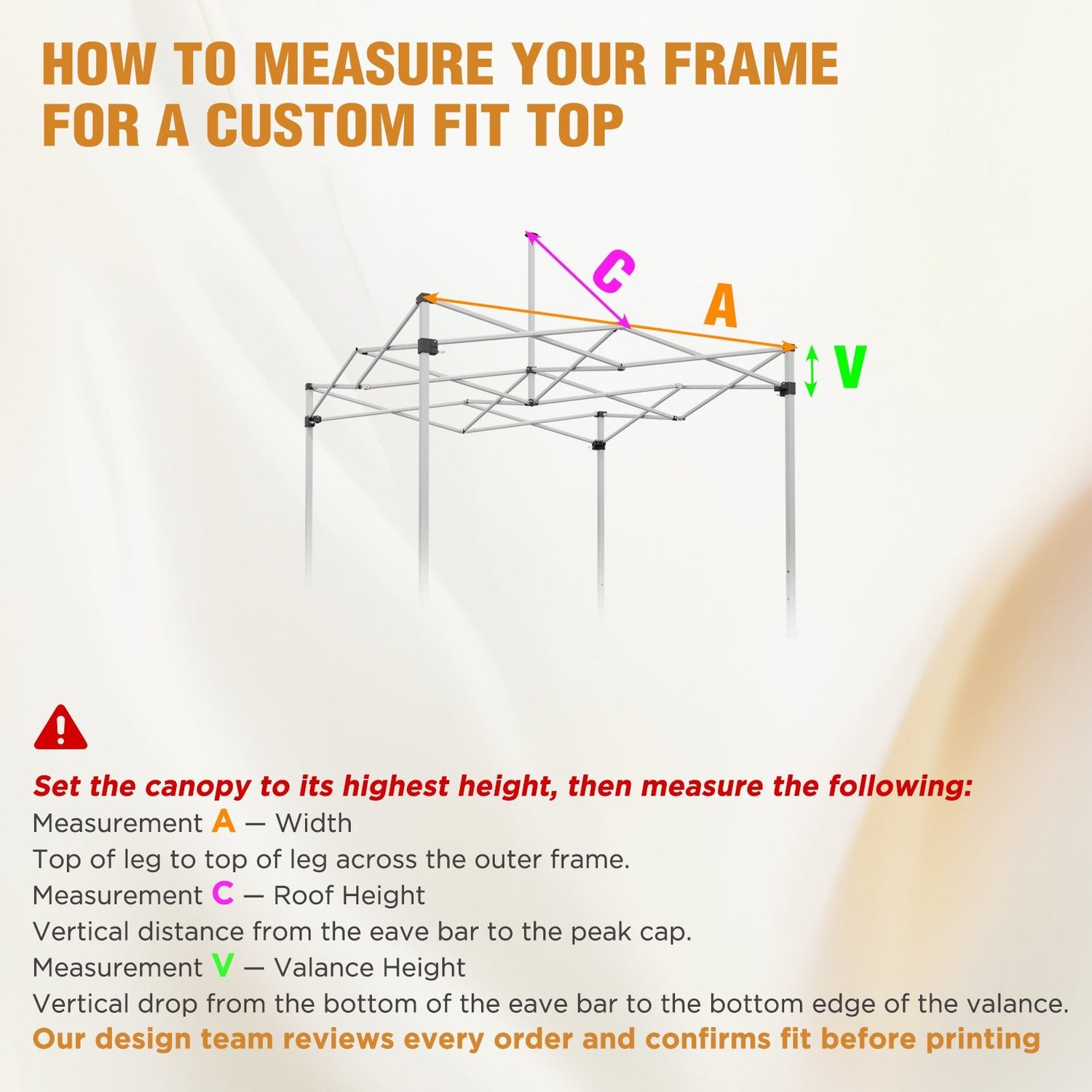 CUSTOM FIT & FULL-COVER PRINTING: Designed to be made-to-order for your 5x5 commercial canopy frame, this canopy tent top is tailored to your exact measurements for a perfect fit. Add your logo or custom design with 100% coverage on all outer surfaces for maximum brand visibility.