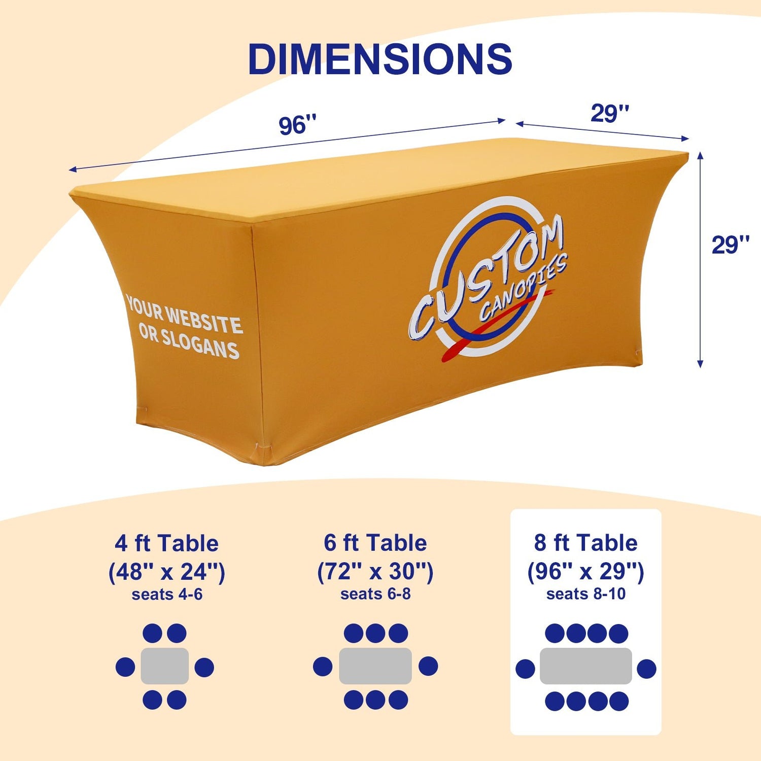 - CUSTOMIZABLE VIBRANT GRAPHICS: Our stretch tablecloth features high-resolution, full-color digital dye sublimation prints. You can personalize them with your business logo, text and design. Choose from standard 4ft, 6ft, and 8ft size to fit most standard folding table sizes.