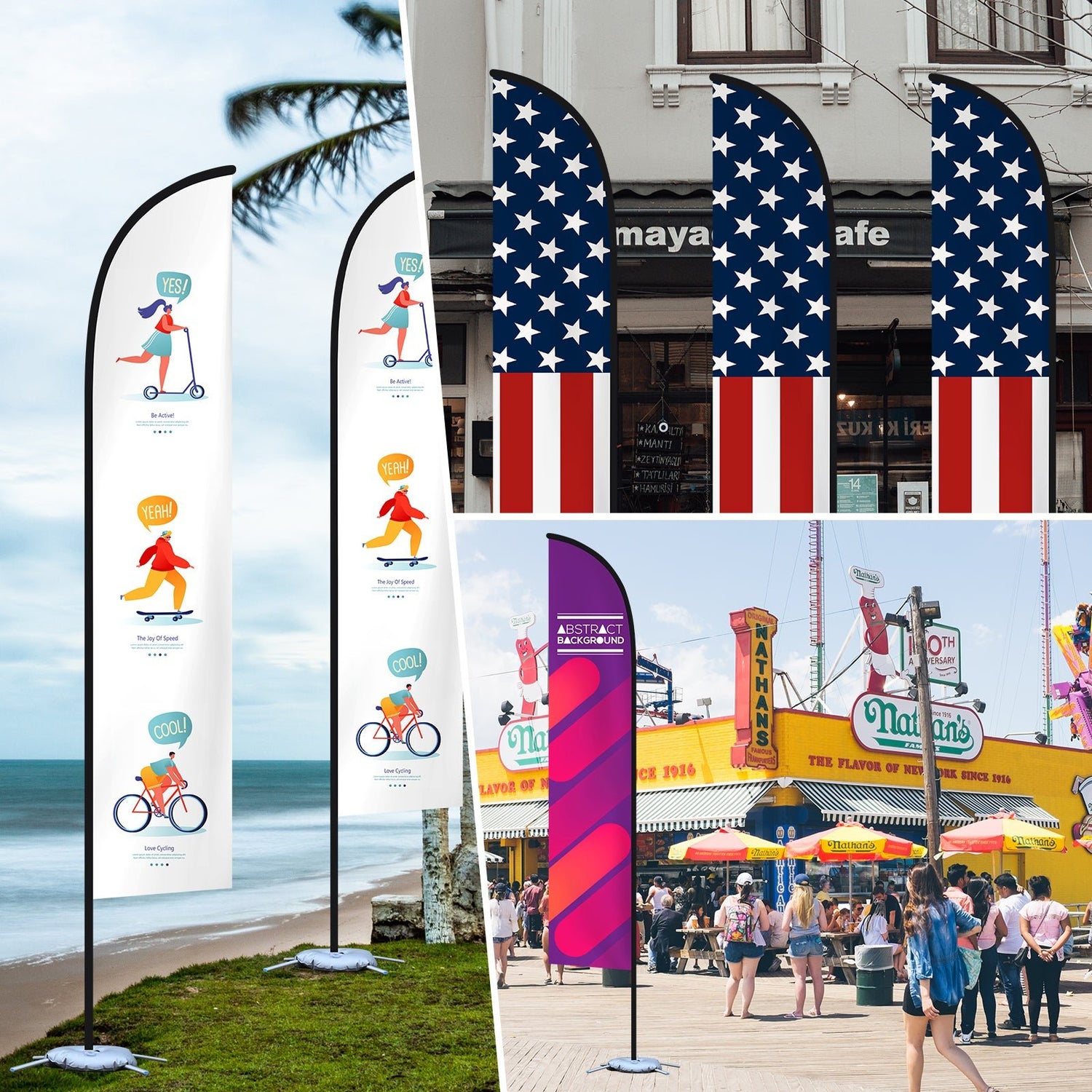 - MARKETING DISPLAY: The custom promotion advertising flags can be used for various purposes such as trade shows, brand advertising, street markets, parties, picnics, sports events, BBQ, beach outings, or other indoor or outdoor marketing events.