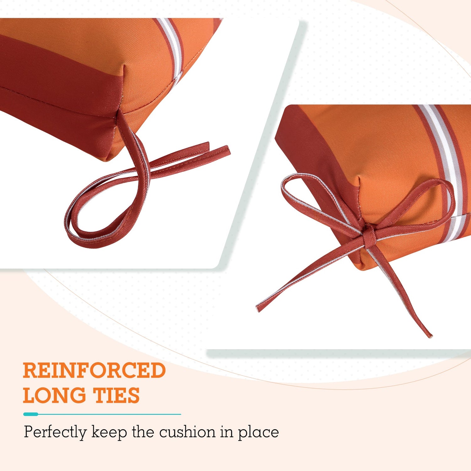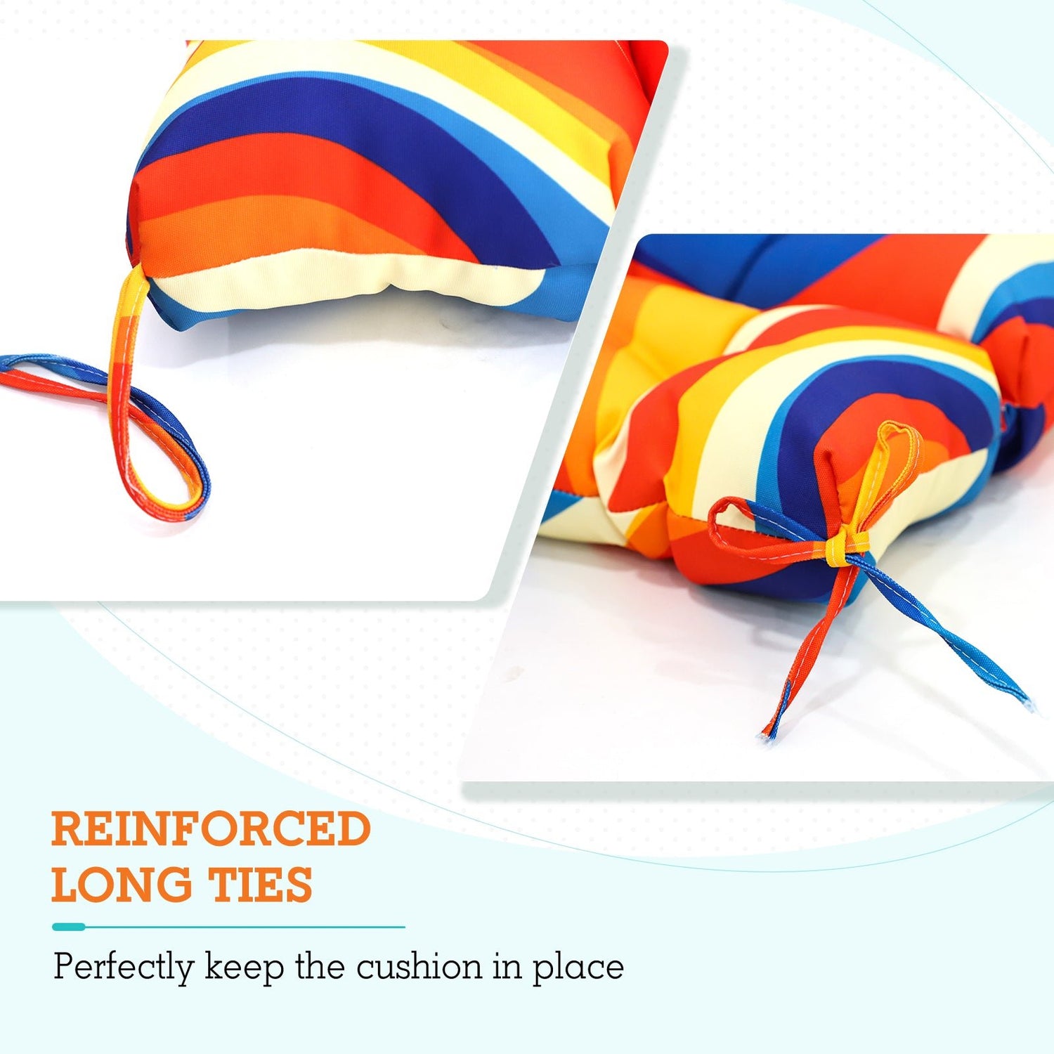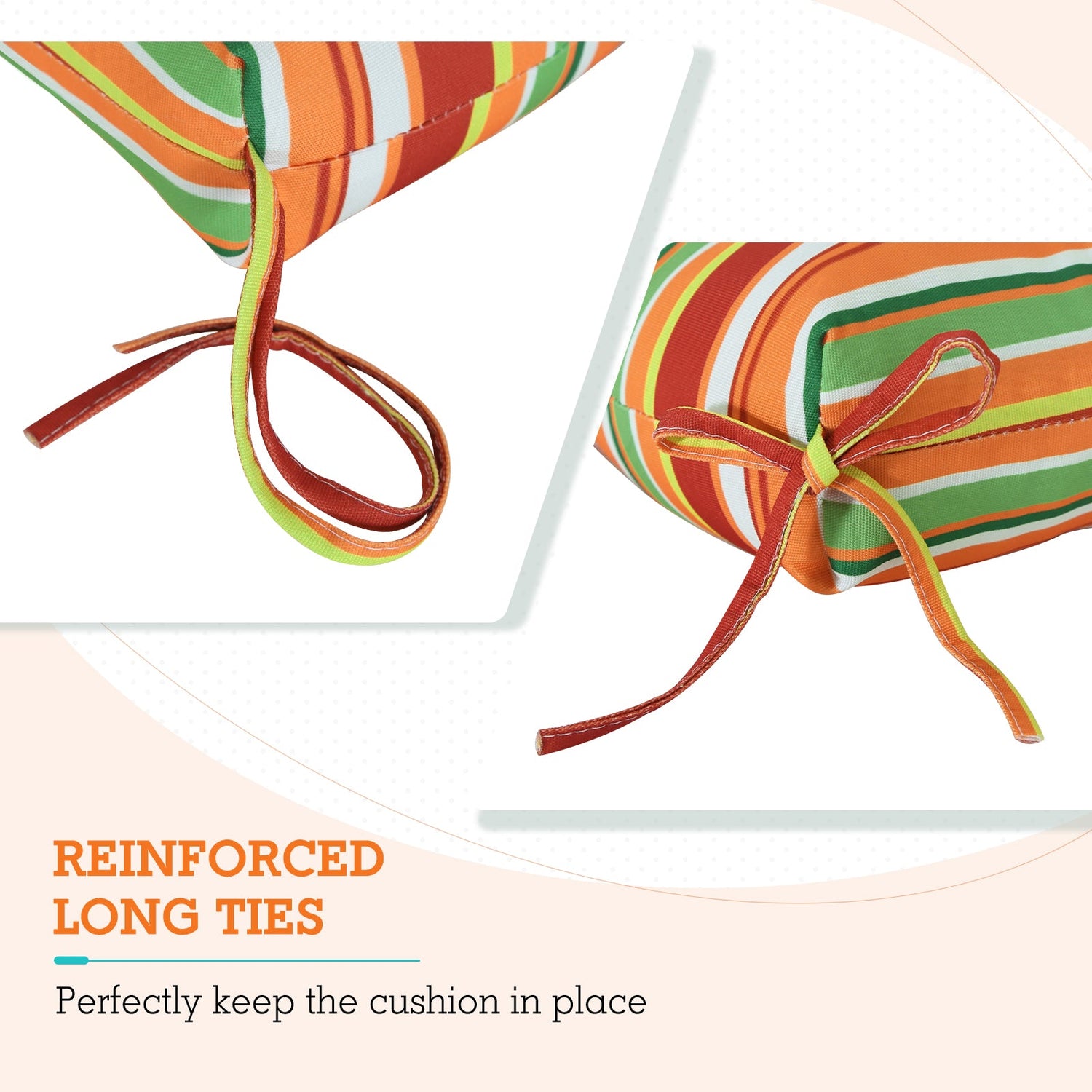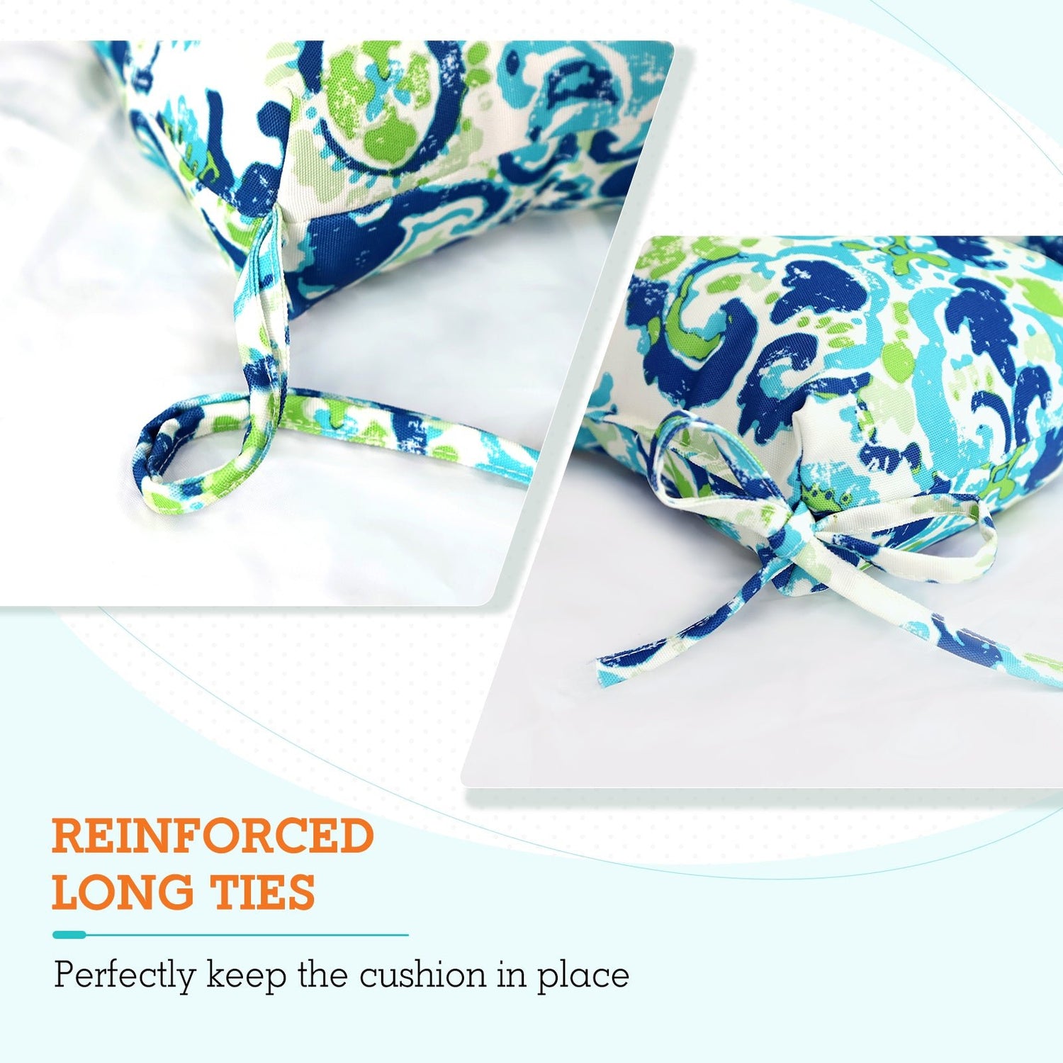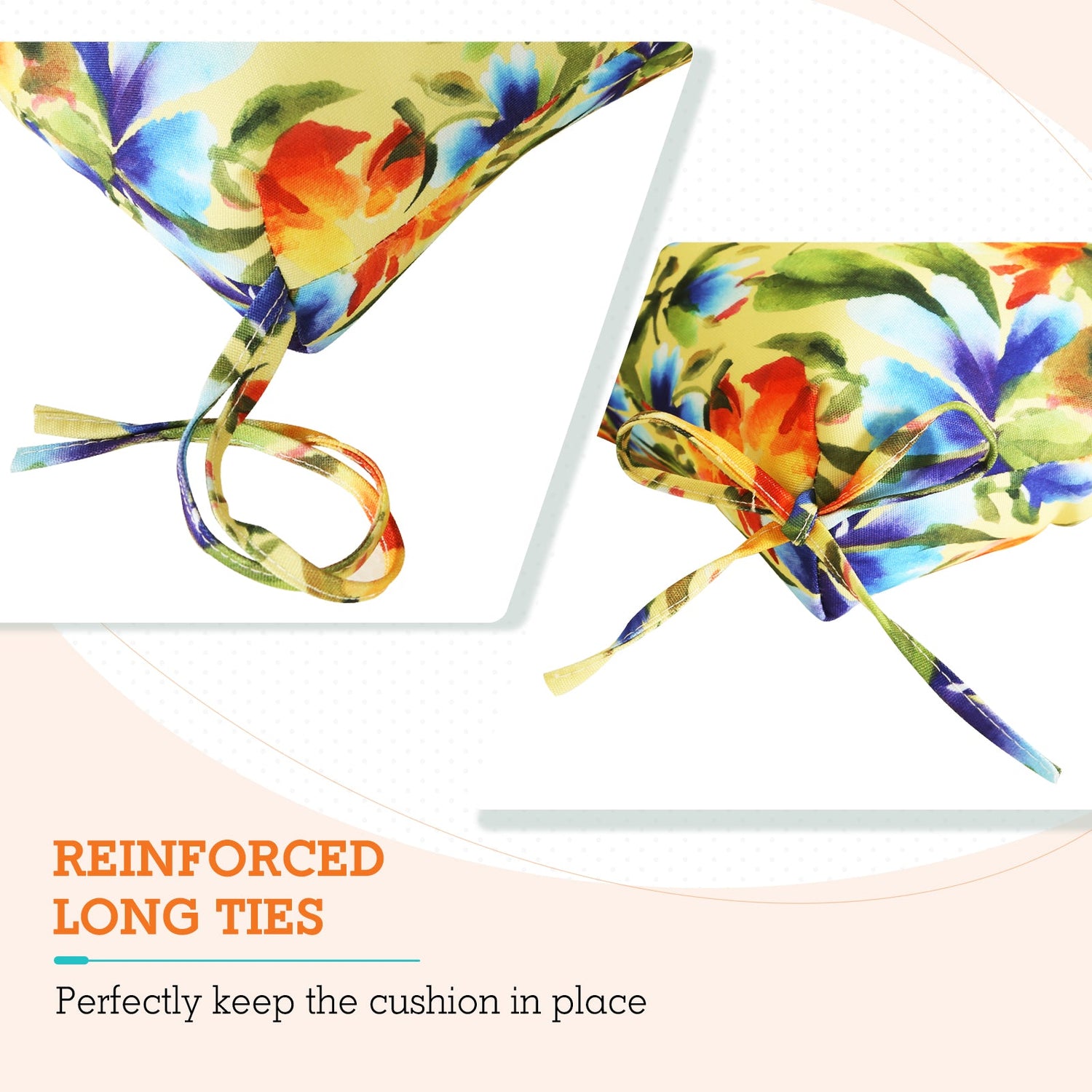 REINFORCED TIES: Features four long ties that help keep the cushion safely attached to furniture and keep the cushion in place. It is recommended to store or cover it when not in use to maintain the product.