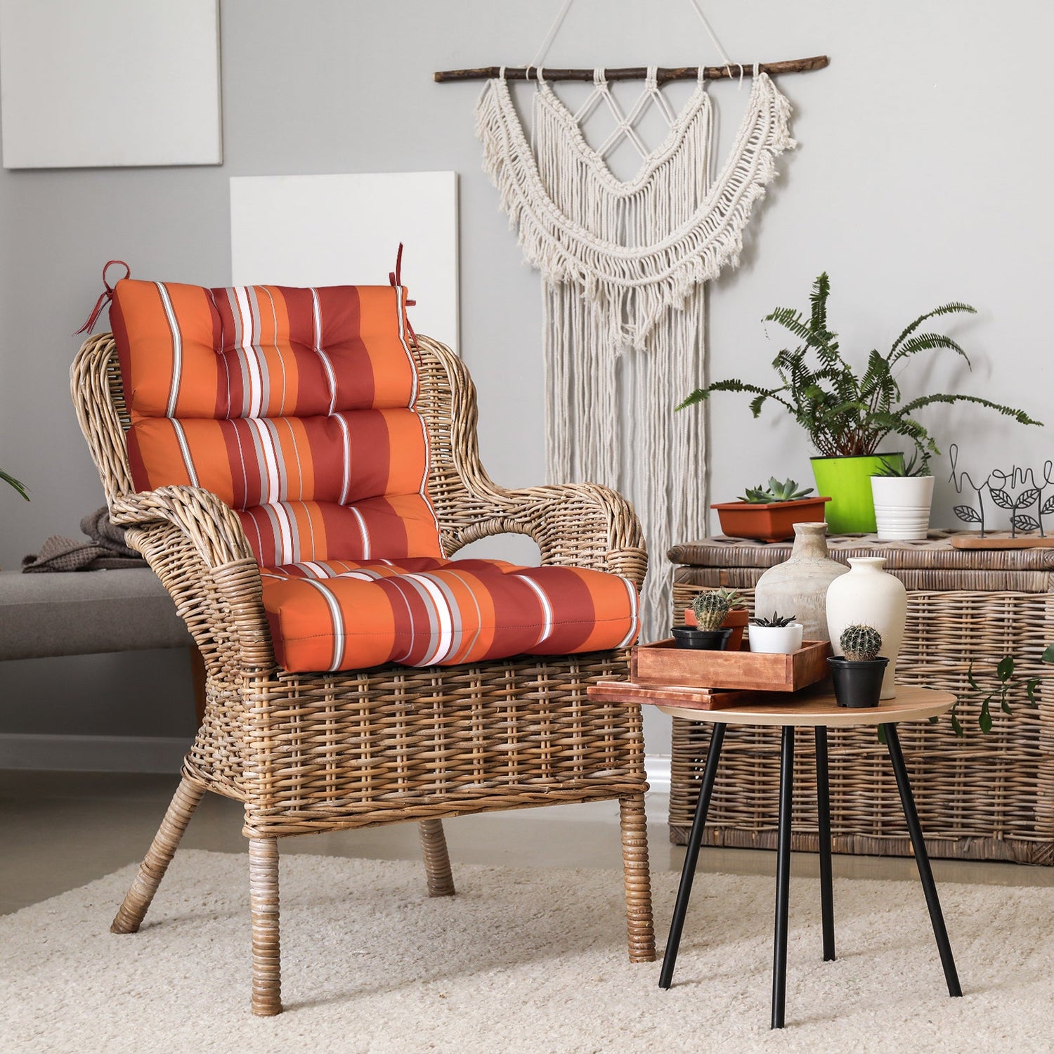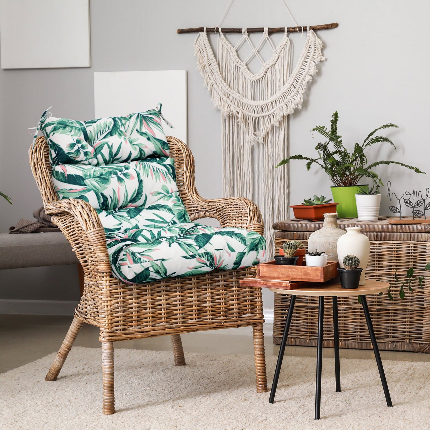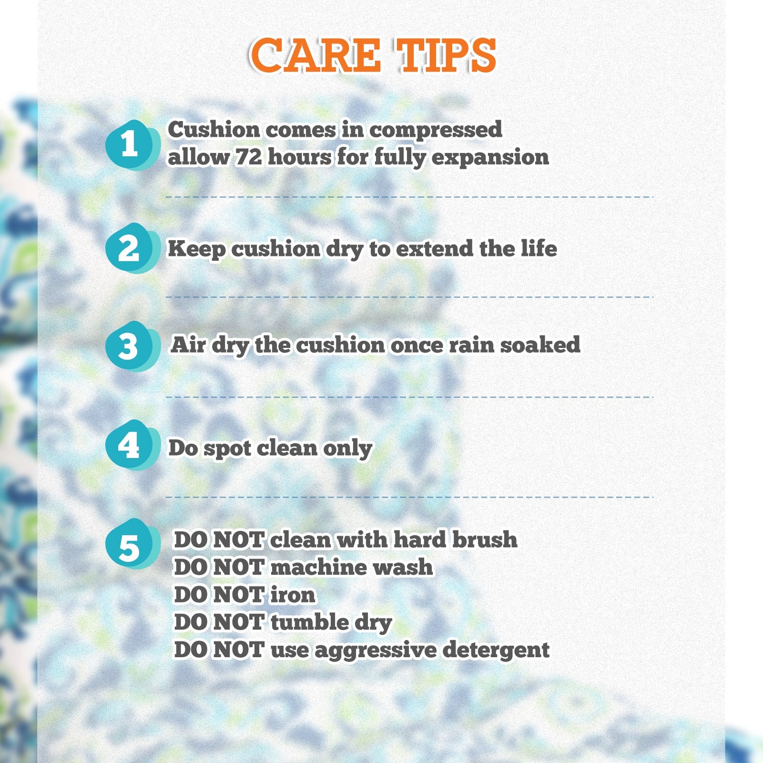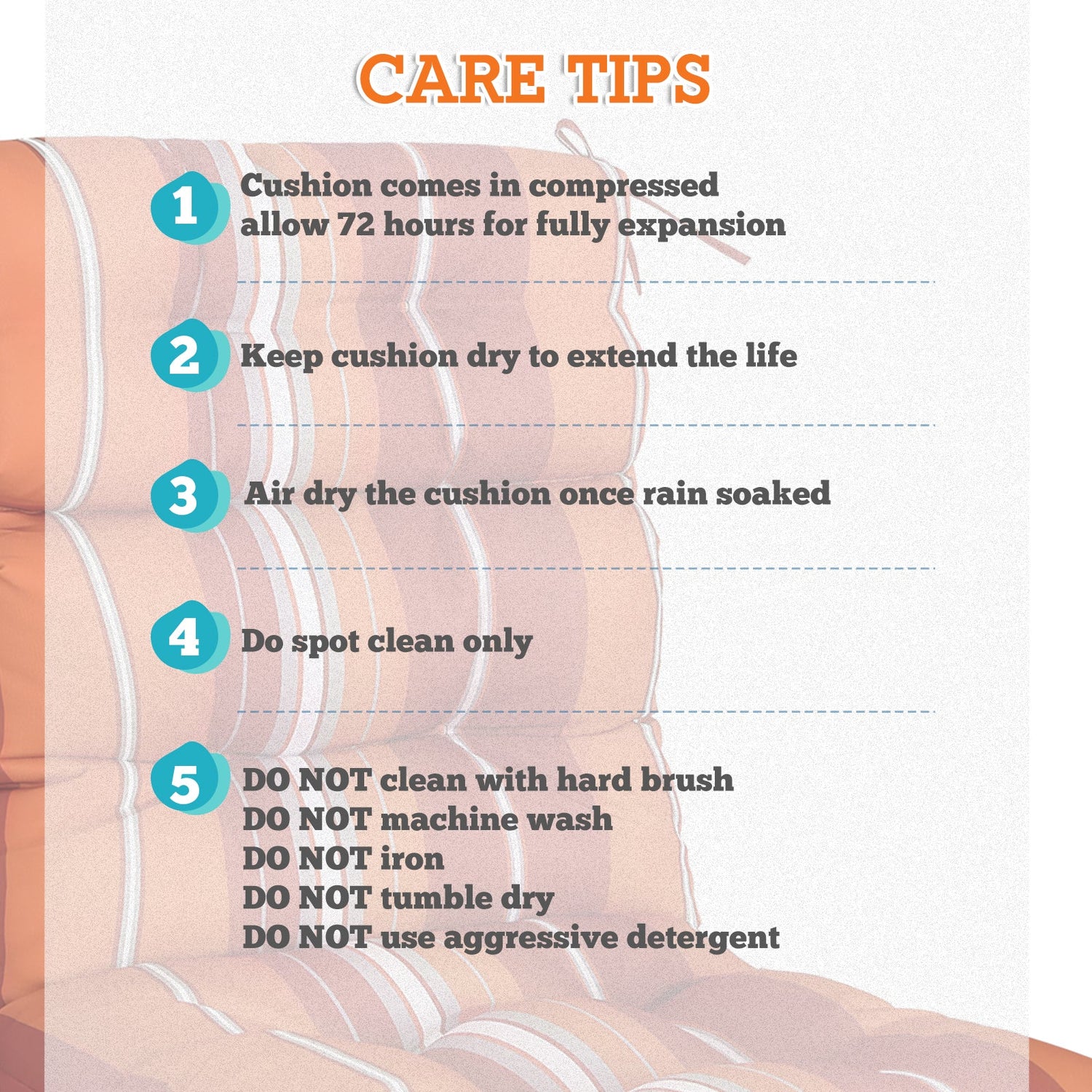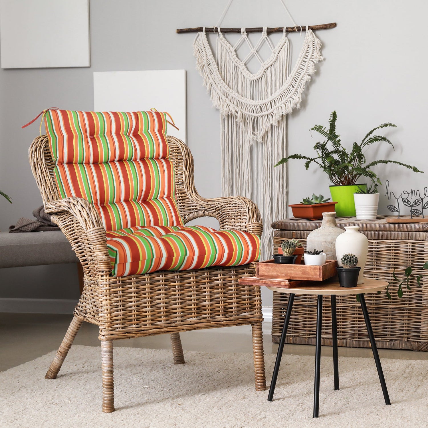 REINFORCED TIES: Features four long ties that help keep the cushion safely attached to furniture and keep the cushion in place. It is recommended to store or cover it when not in use to maintain the product.