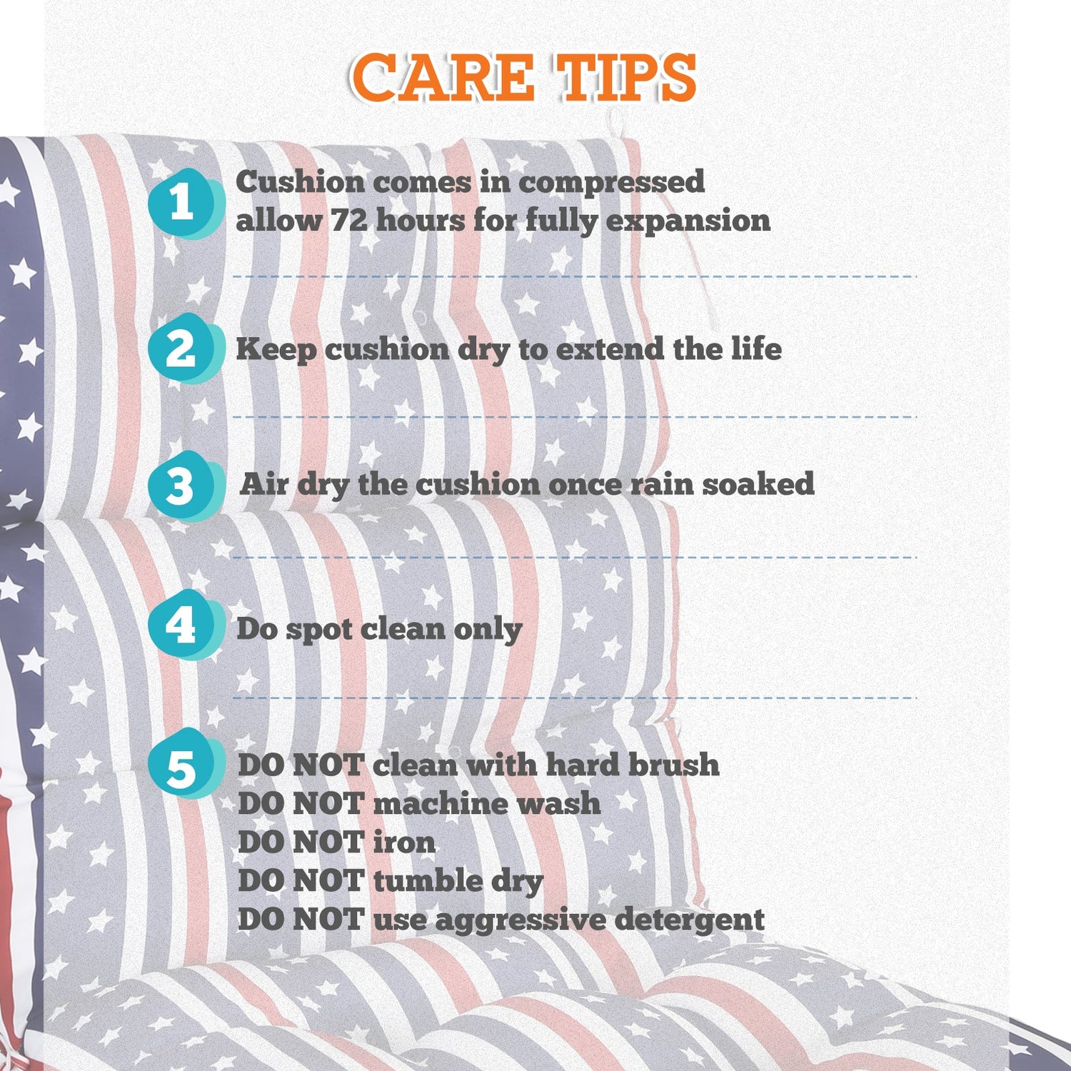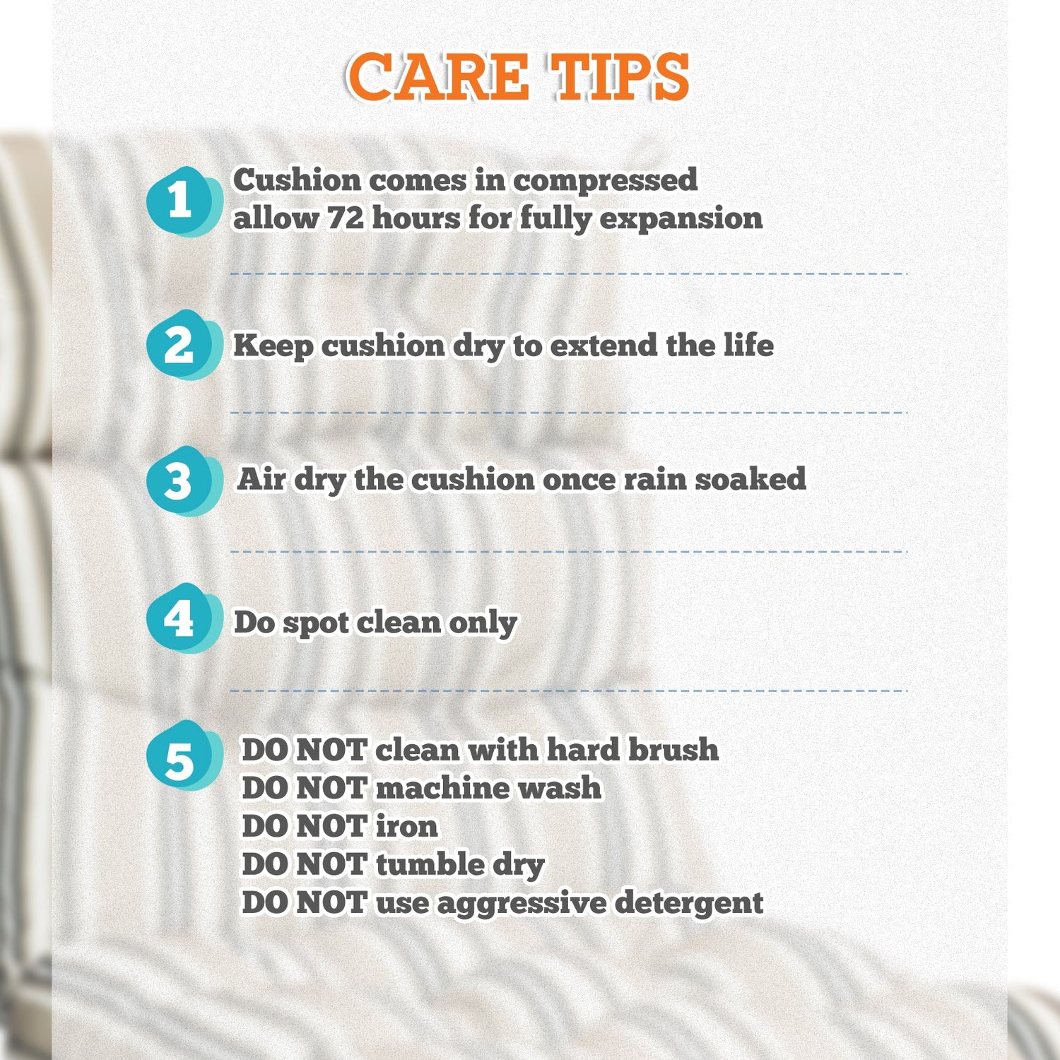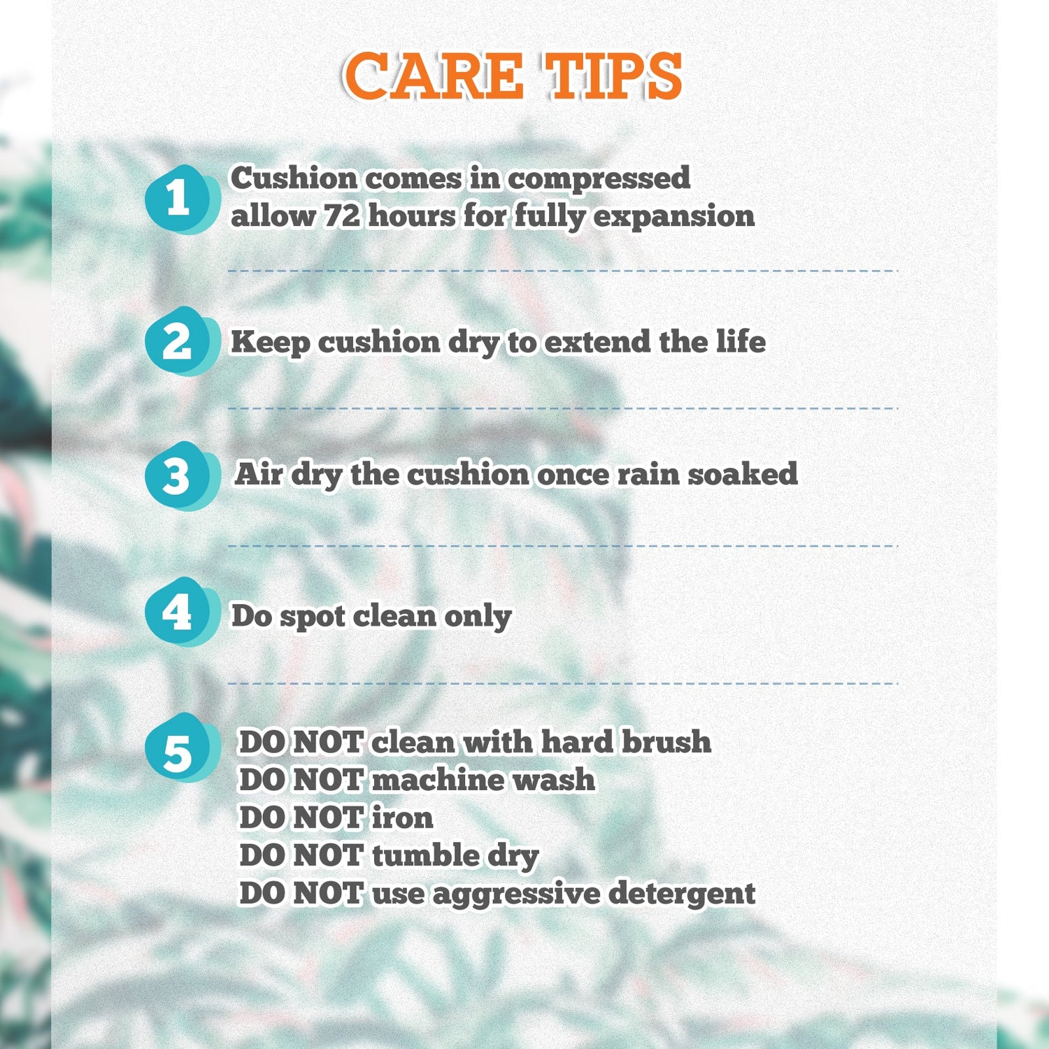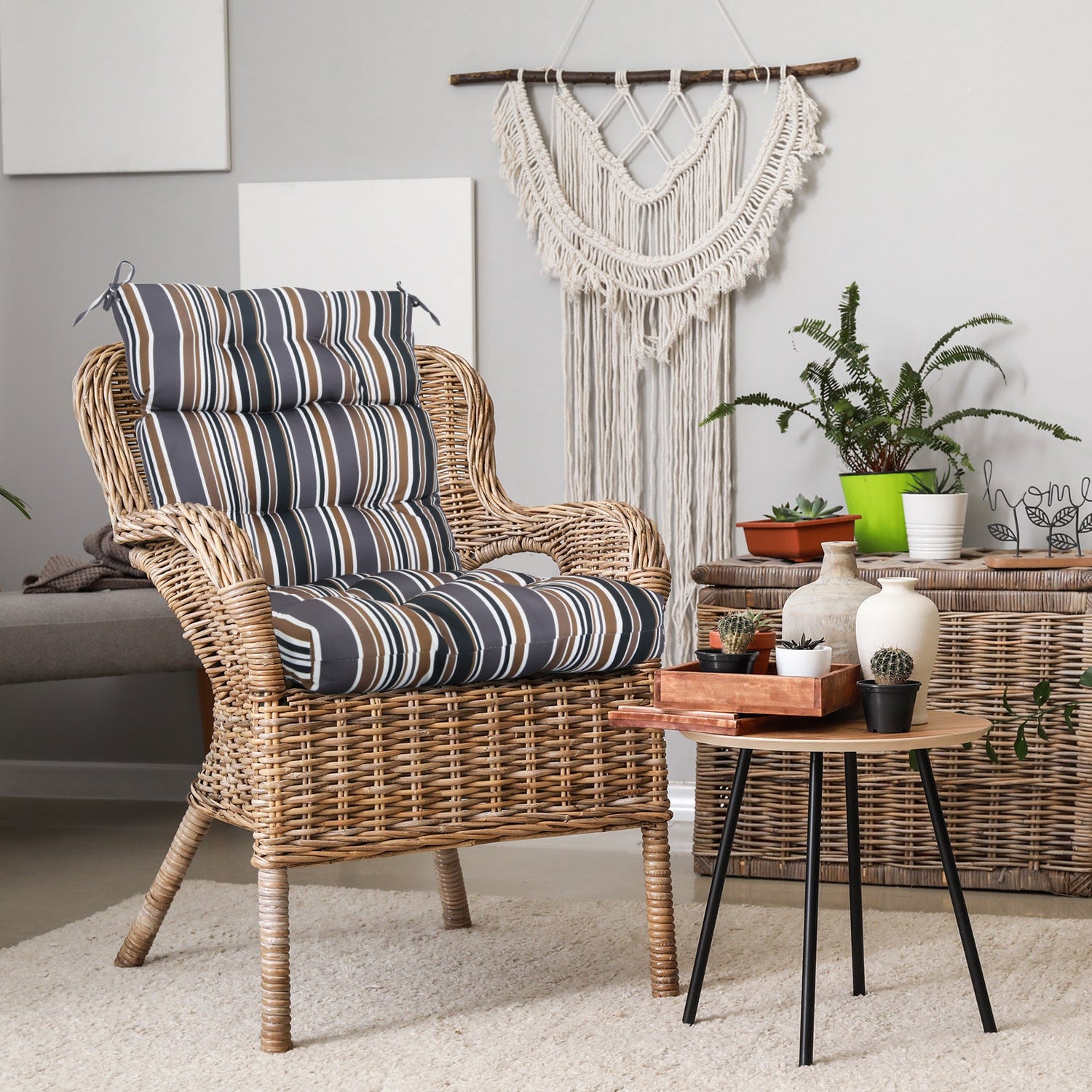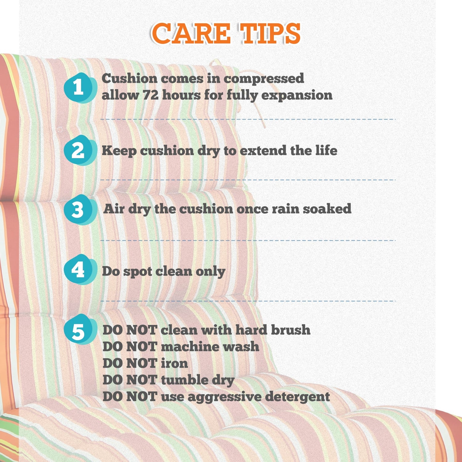 REINFORCED TIES: Features four long ties that help keep the cushion safely attached to furniture and keep the cushion in place. It is recommended to store or cover it when not in use to maintain the product.