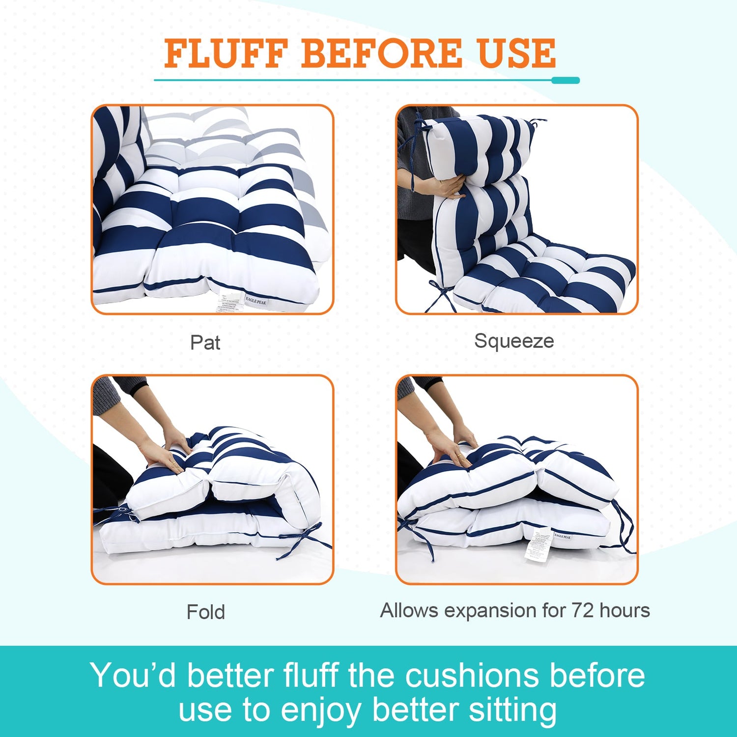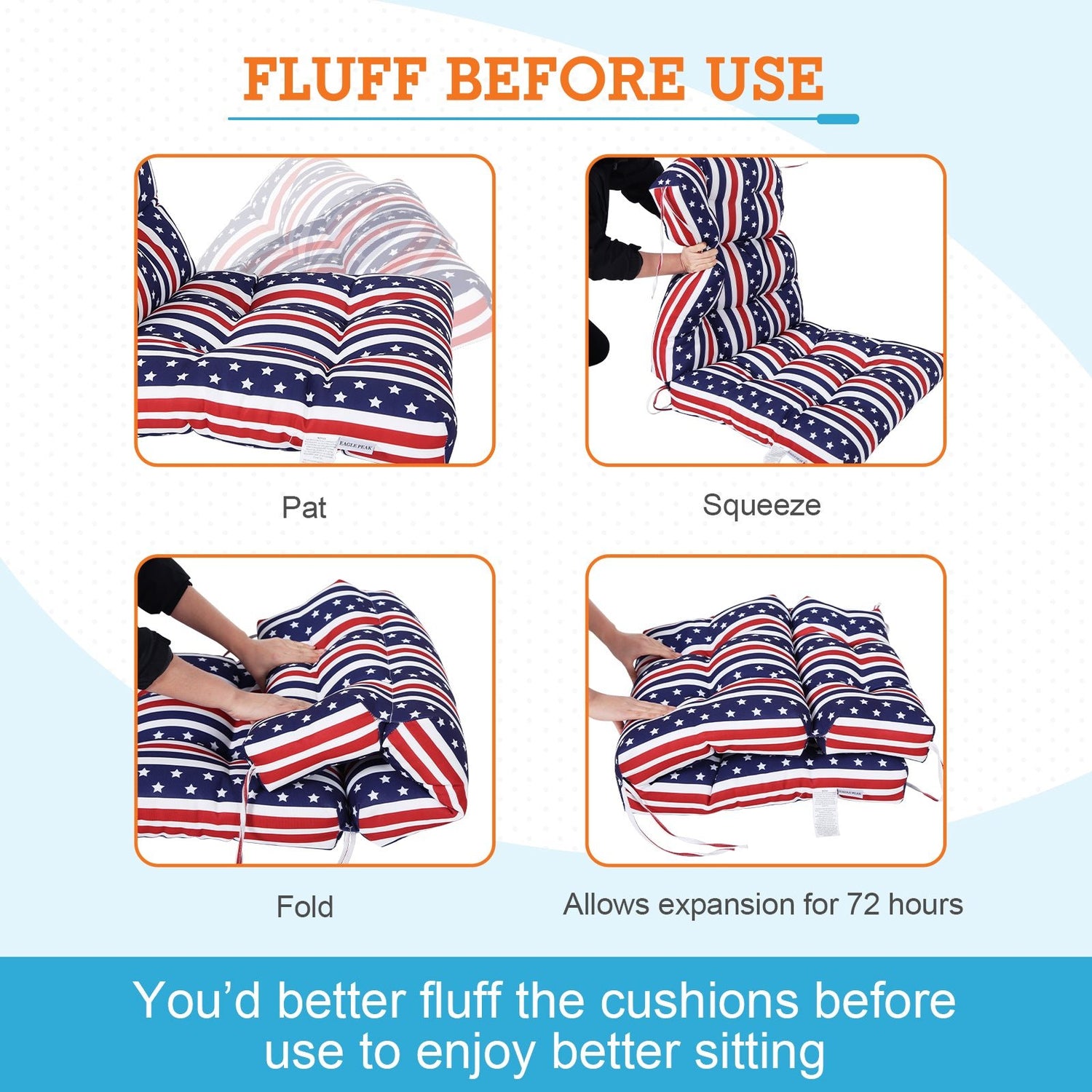 QUALITY FABRIC: The EAGLE PEAK outdoor tufted high back patio chair cushions (set of 2) are made of superior water-repellent polyester fabric, perfect for your wicker seat, dining chairs, bench, porch swing or porch rockers. This is an ideal cushion for both indoor and outdoor use.