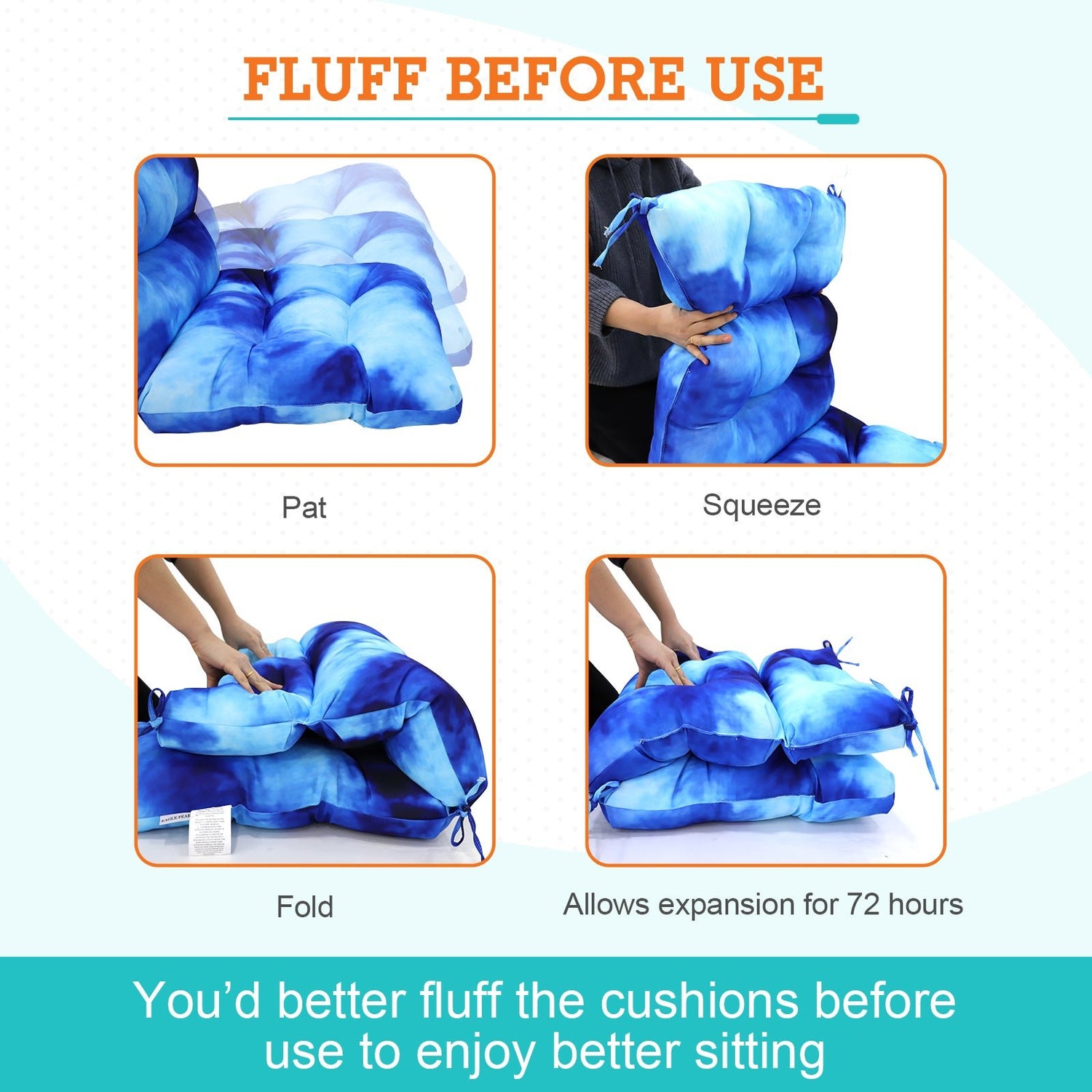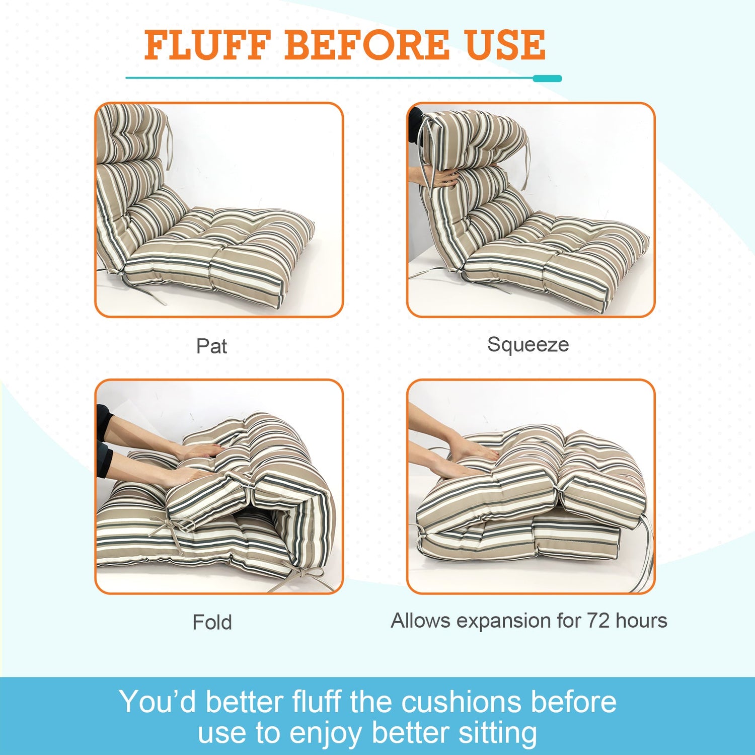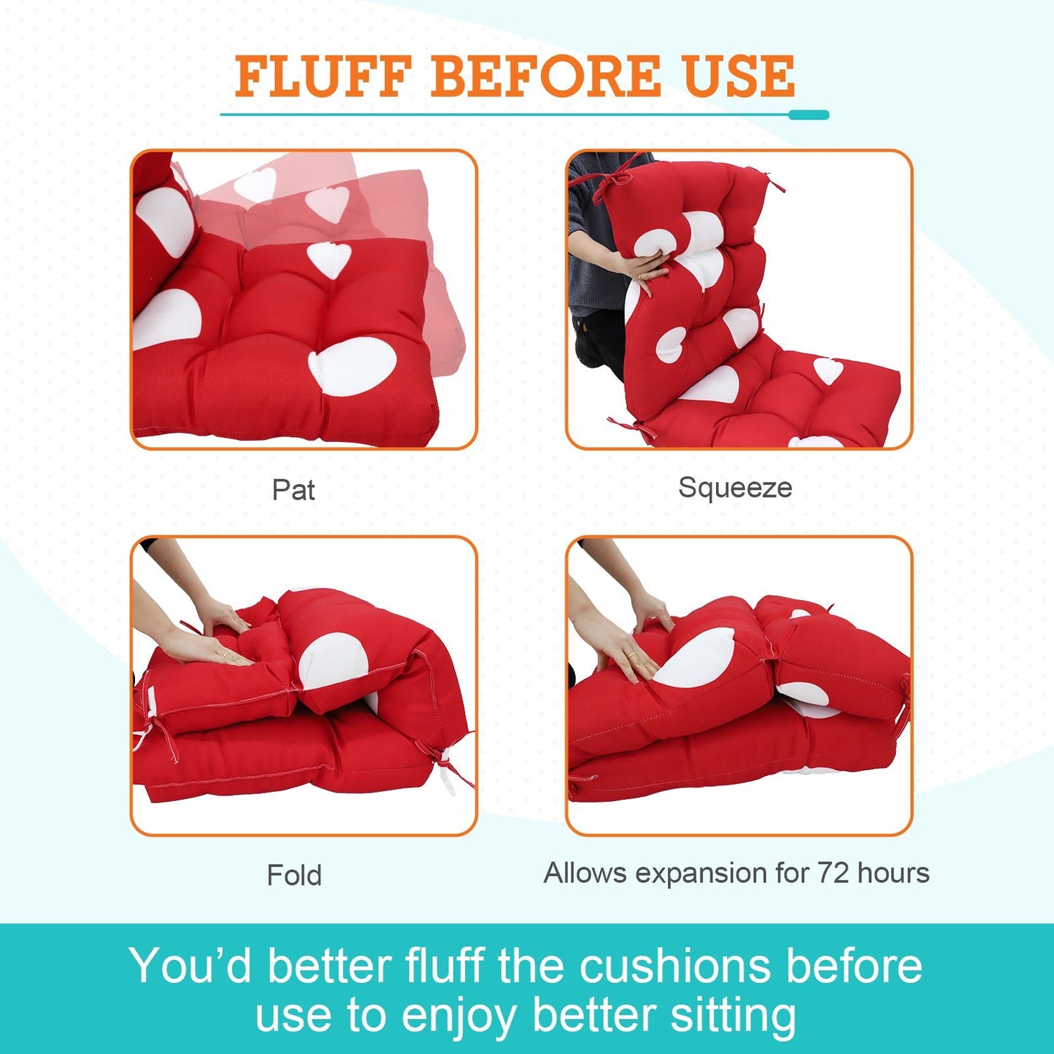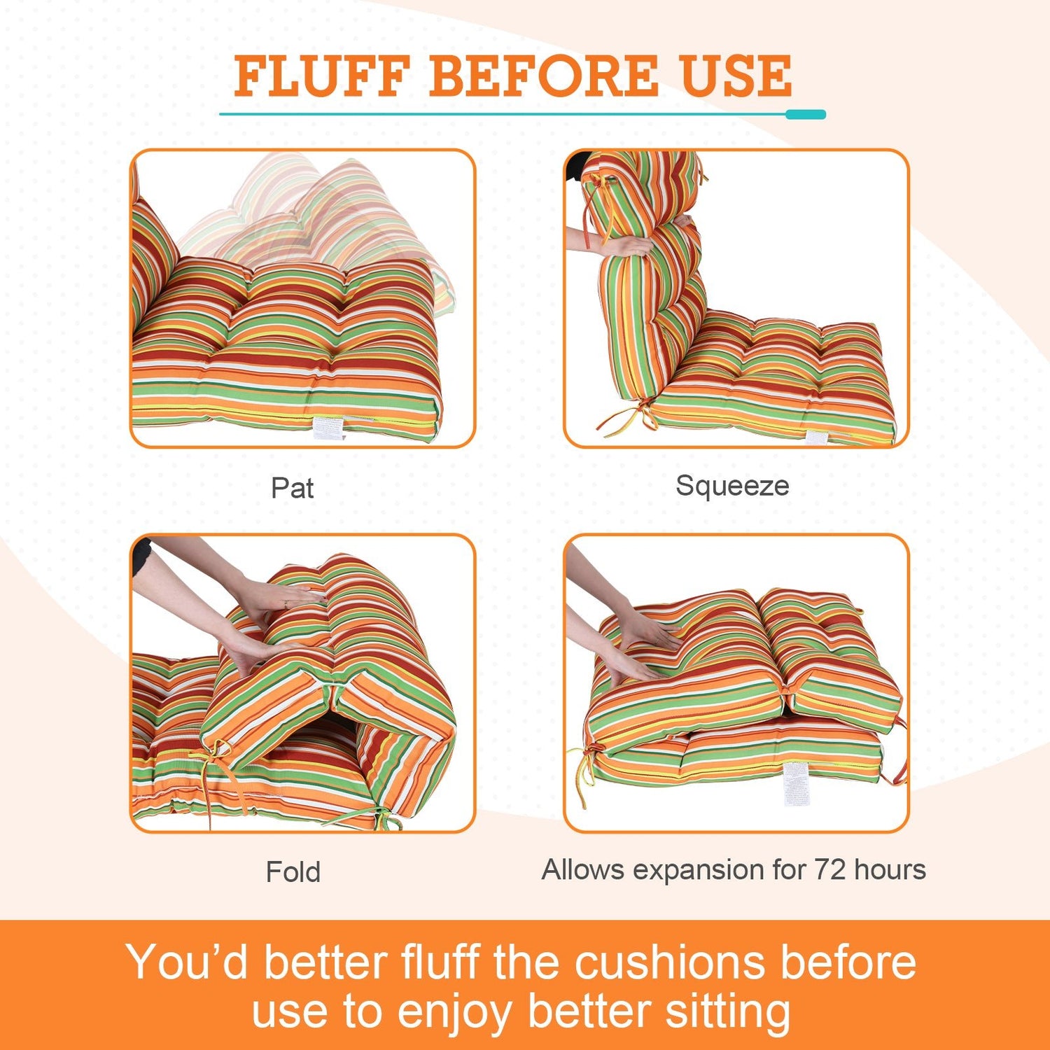 MEASUREMENTS: Please check the size if match your chair first. The seat part measures L 22" x W 22" x thick 4", back part measures L 24" x W 22" x thick 4". Allow up to 72 hours for fully expansion. The cushions are reversible and easy to clean. Lightly dab the fabric with mild soap and warm water, then air dry.