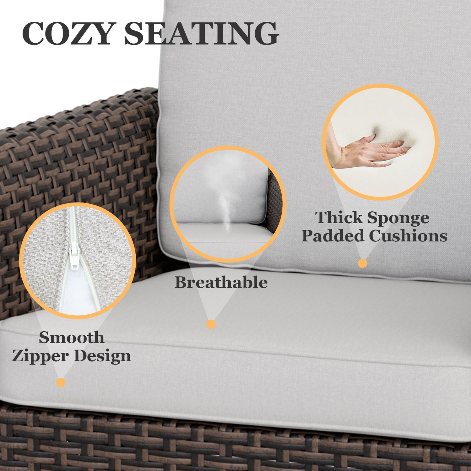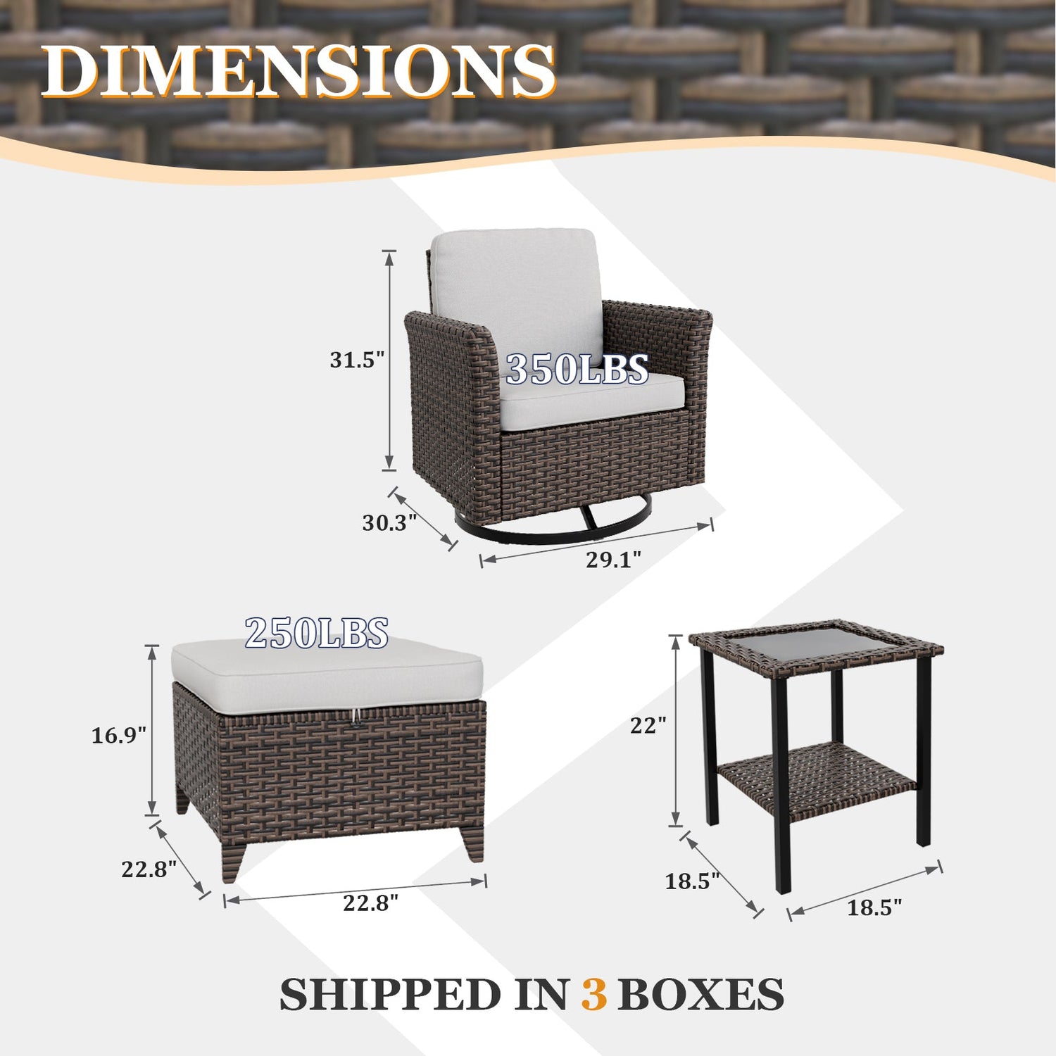 CLASSIC DESIGN: Transform your outdoor space with this timeless 5 piece wicker patio set, featuring 2 swivel rocking chairs with a smooth 360 degree gentle gliding motion, 2 ottomans, and side table. The combination of woven rattan and deep, soft cushions adds both comfort and style; perfect for patios, decks, porches or backyard lounging.