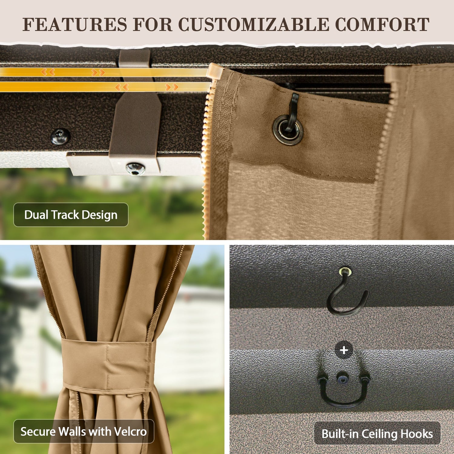 NETTING & CURTAINS INCLUDED: This gazebo includes a fully enclosed double-layer sidewall with zippered netting and UV-blocking curtains, providing both privacy and protection. Equipped with a double-track system, the sidewalls allow easy adjustments between airflow, shade, or full enclosure. Enjoy a comfortable retreat, shielded from critters and harmful UV rays.