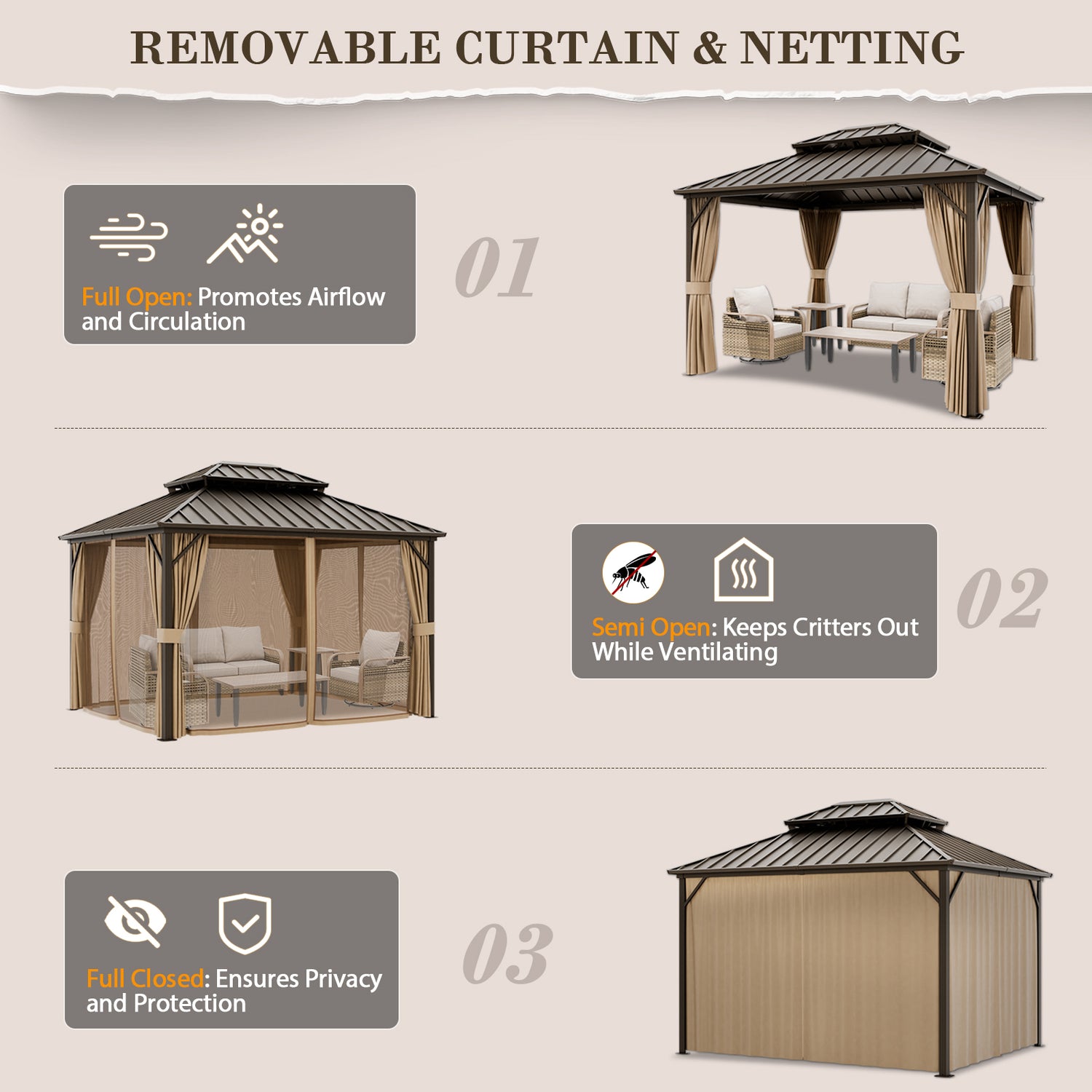 EAGLE PEAK 12x10 Hardtop Gazebo, Galvanized Steel Double Roof with Aluminum Frame, Outdoor Pavilion with Netting and Curtains for Patio, Deck, Lawn and Garden