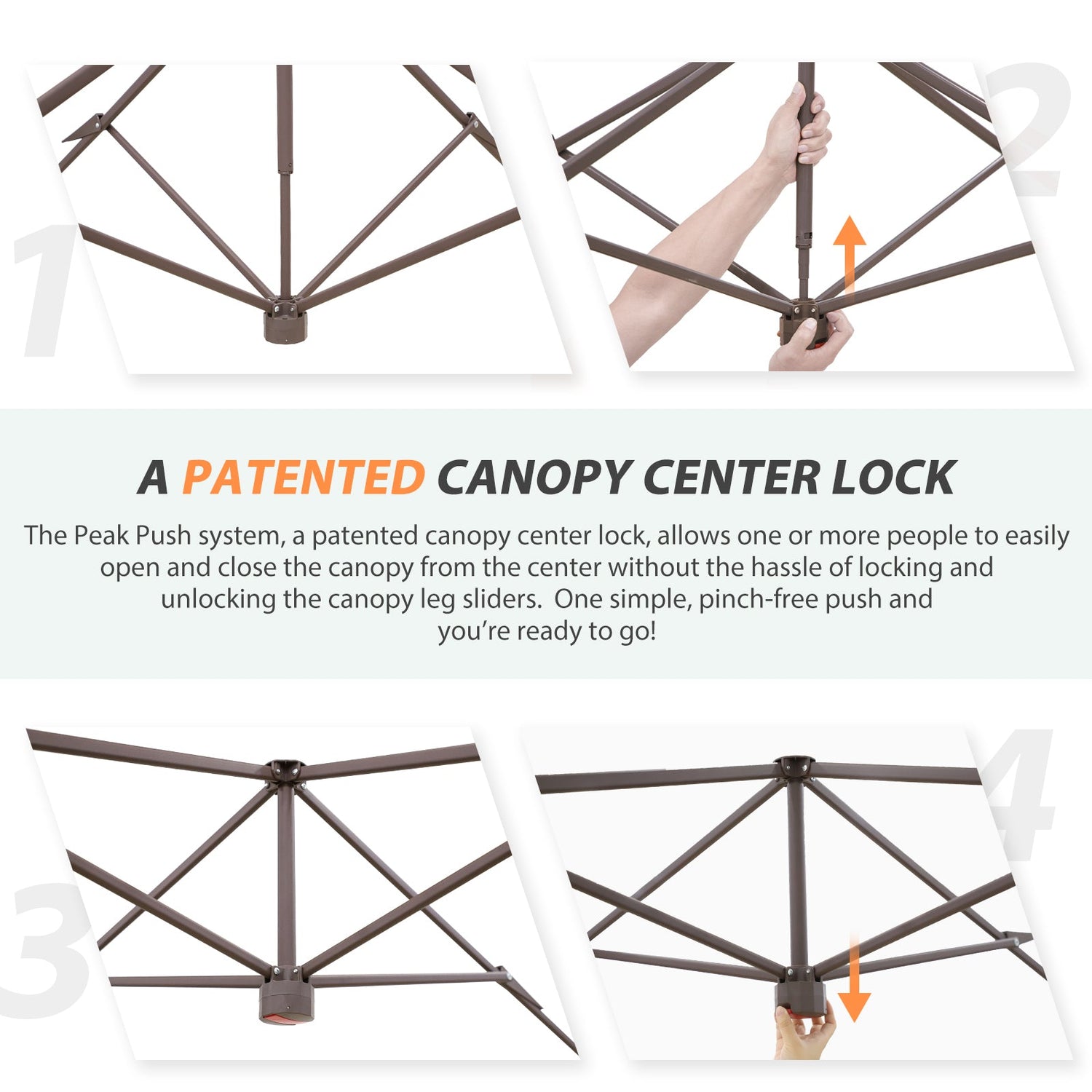 EASY SETUP: This easy setup pop up gazebo tent features the Peak Push system, a patented gazebo center lock. The portable gazebo requires no tools and easily opens and closes from the center in seconds. Its unique gazebo tent center lock enables a quick, one person setup, letting you maximize outdoor time with minimal effort.