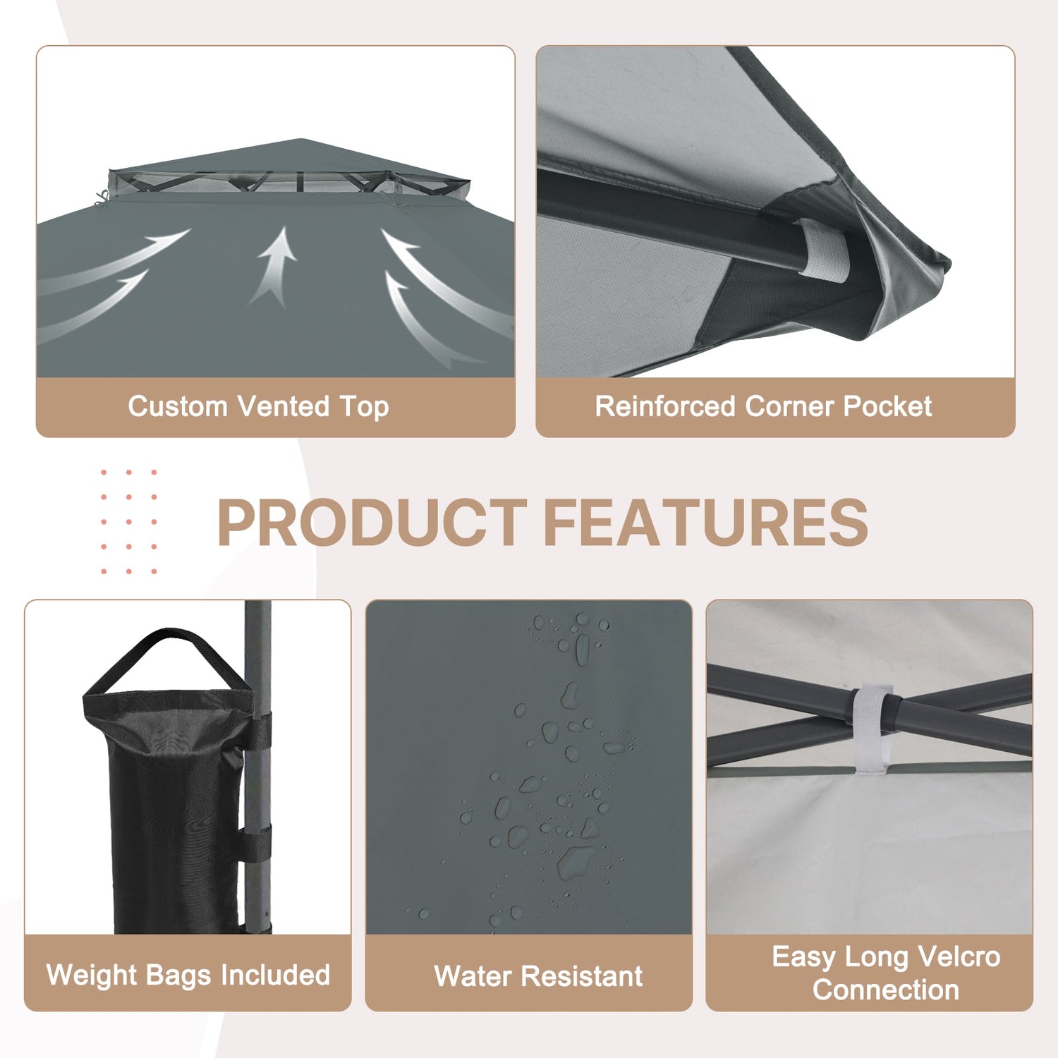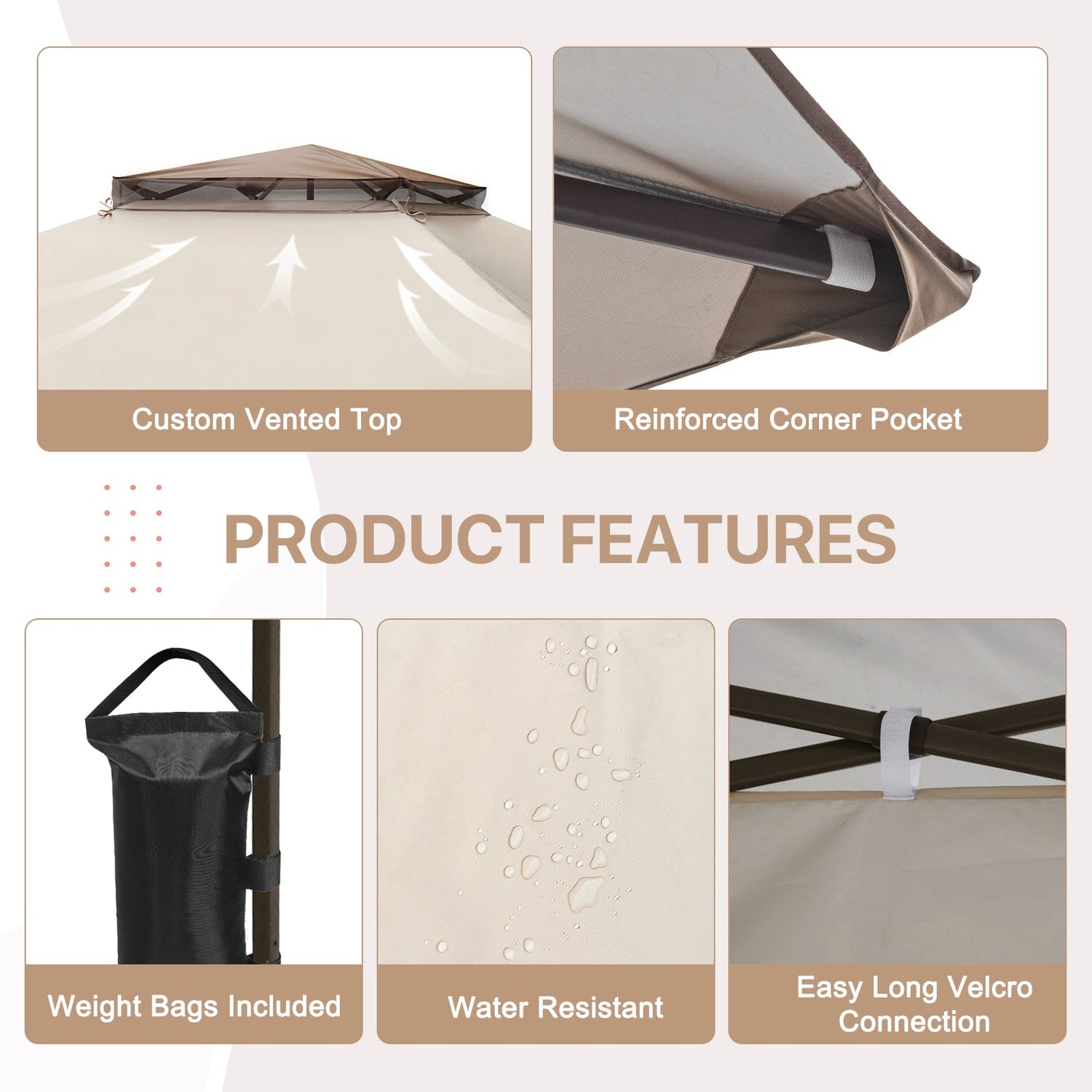 VENTED TOP: The 150D oxford gazebo top meets the CPAI-84 flame resistance standard and has UPF 50+ UV sun protection. The vented top design helps improve air flow while the water-resistant fabric helps to keep you dry from passing showers.