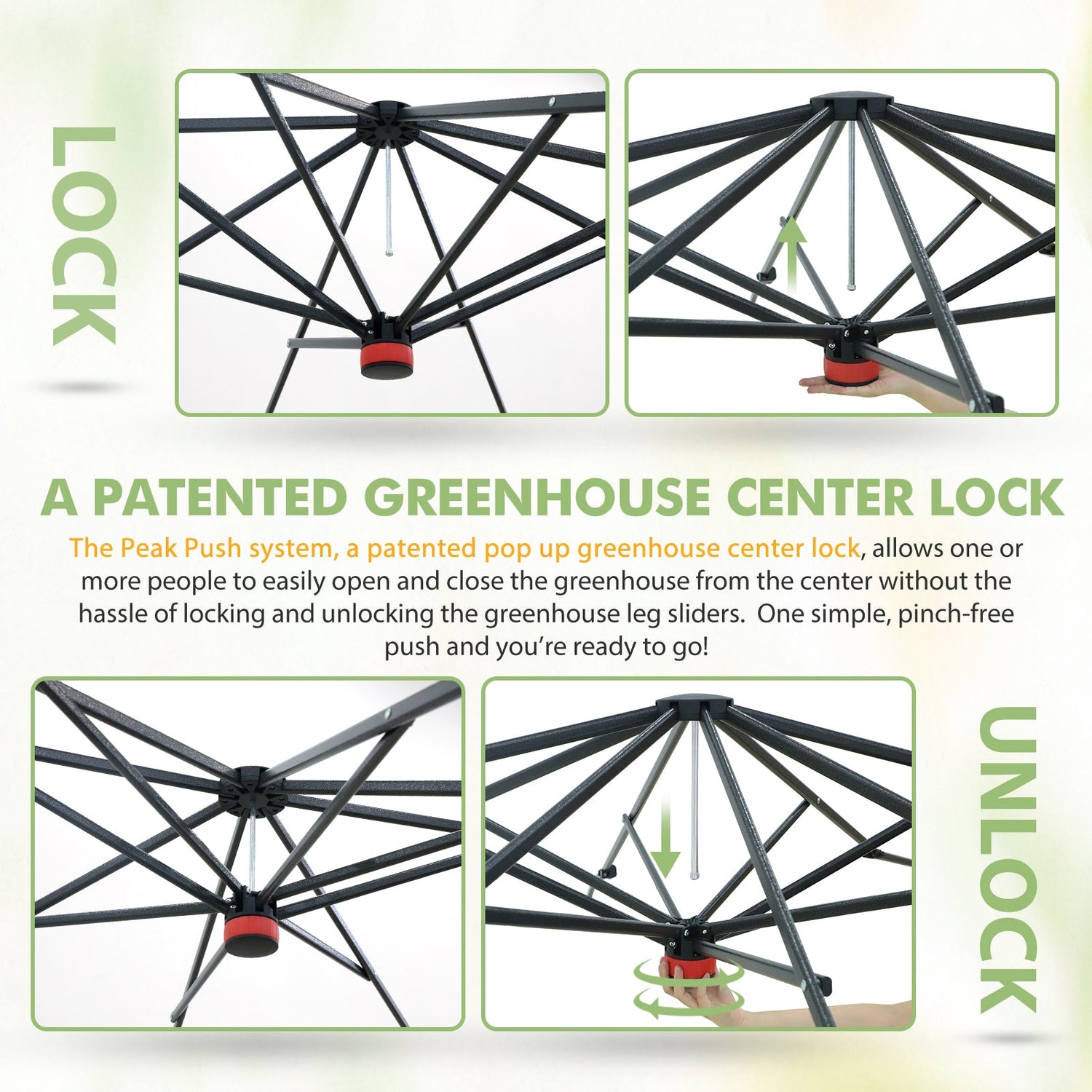 EASY SETUP FOR ONE PERSON: How do you set up a portable greenhouse alone? With EAGLE PEAK’s patented Peak Push Center Lock system, one person can easily set up this pop up greenhouse in seconds. No tools are needed. The portable design opens from the center for quick assembly, making gardening faster, easier, and hassle-free.