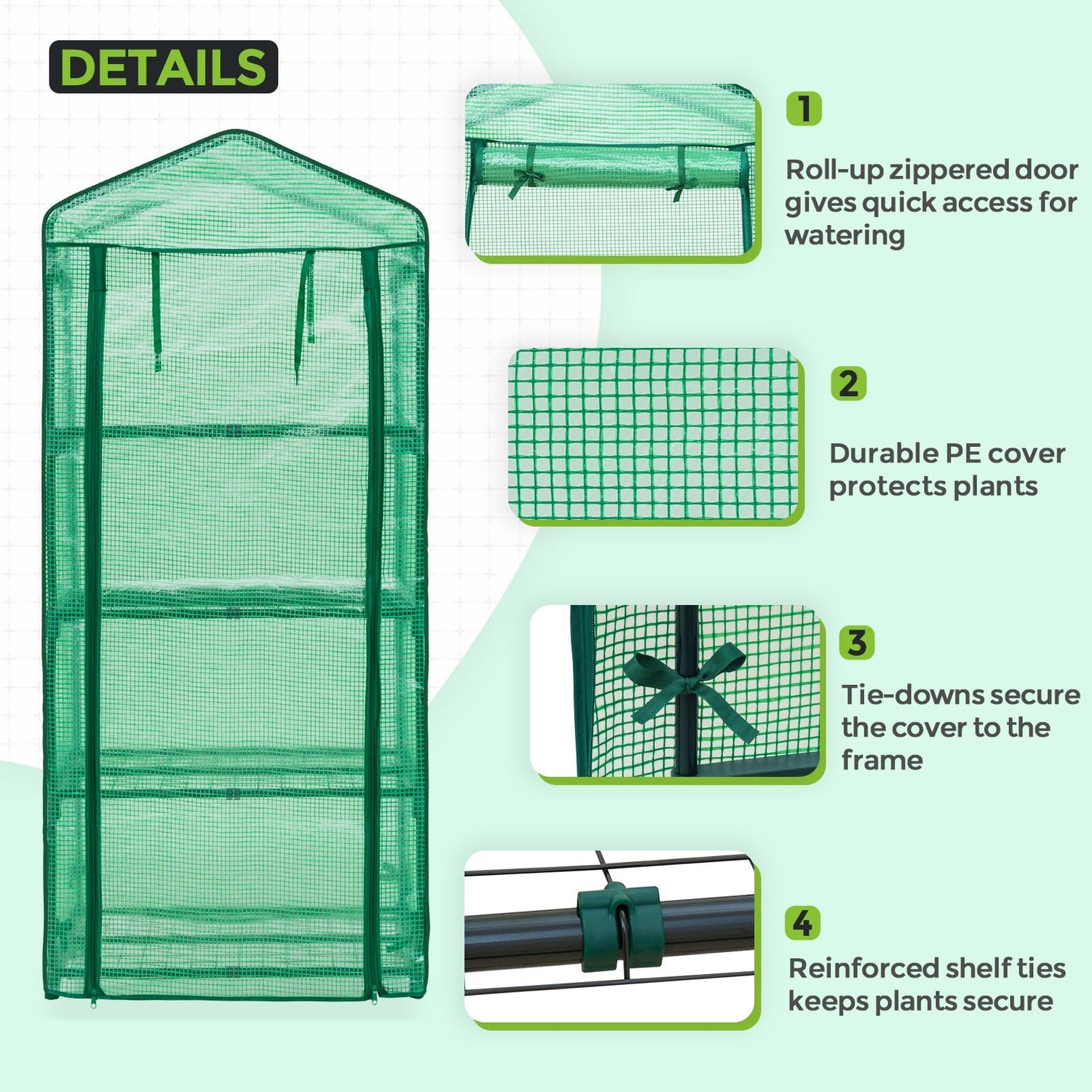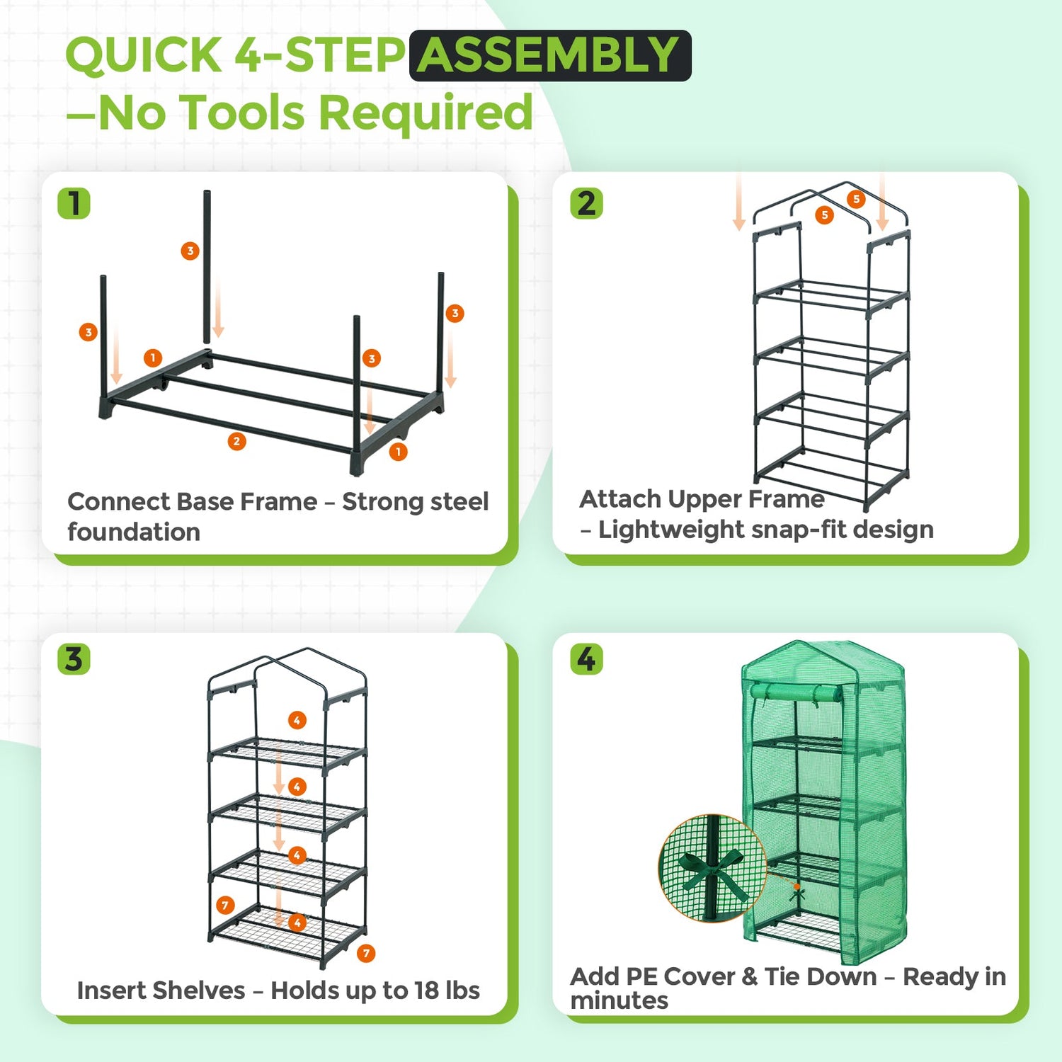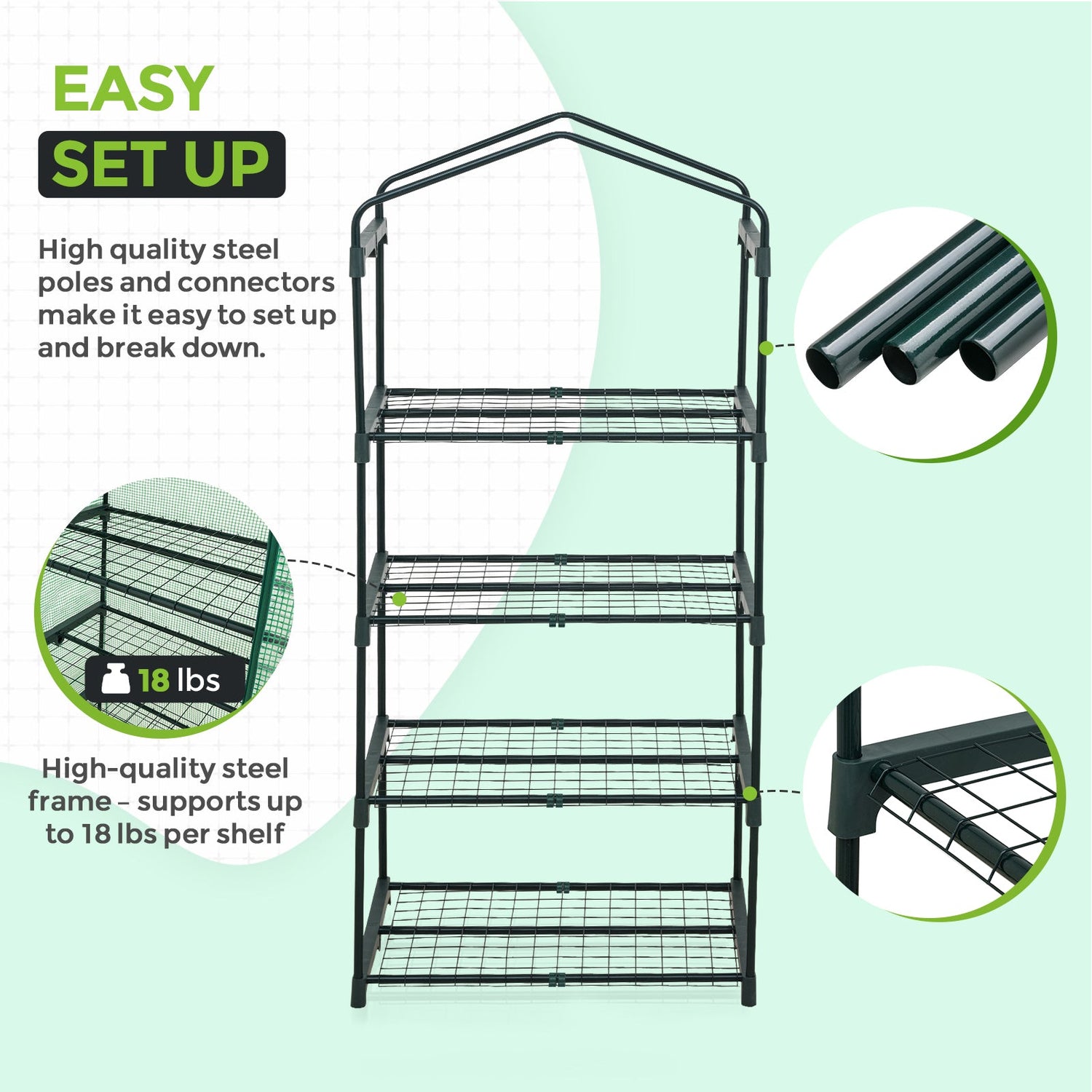 AMPLE SPACE: This small and sturdy greenhouse features 4 wire mesh shelves to hold your house plants, seed trays, seedlings and more. Each shelf holds up to 18lbs.