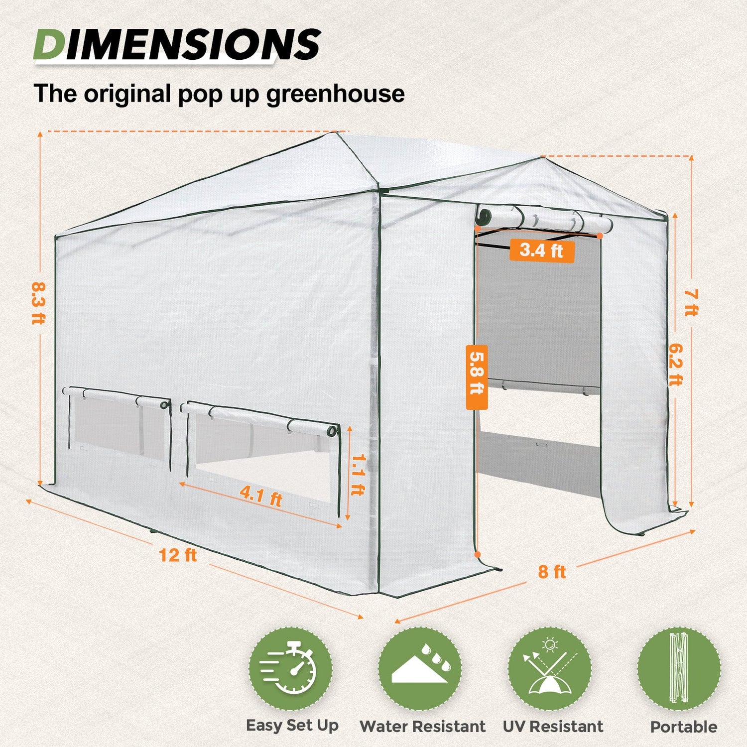 8x6/12x8 Portable Walk-in Greenhouse, Woven PE Top, White
