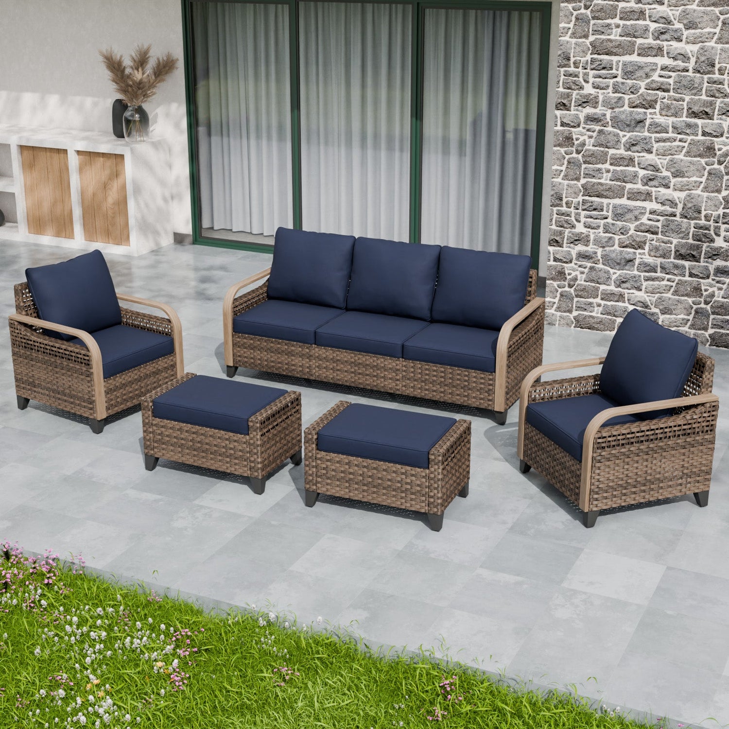 Modern Wicker Outdoor Patio Furniture Set,2 Patio Chairs, 3-Seat Loveseat and 2 Ottomans, 5 Pieces, Brown/Gray - Beige is backordered and will ship as soon as it is back in stock.