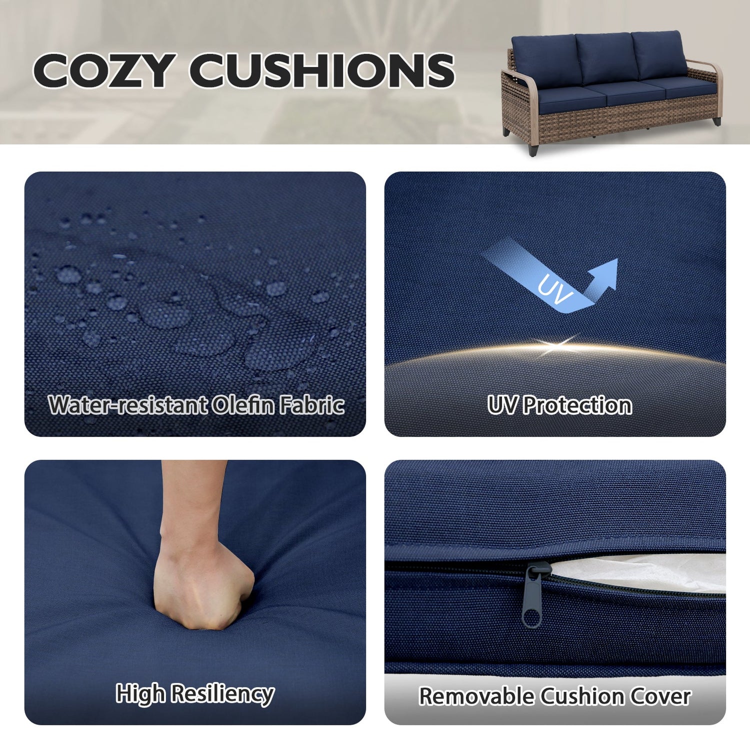 HAND-WOVEN RATTAN: Our patio furniture set is constructed with durable resin wicker, handcrafted over a powder-coated steel frame. Unlike natural wicker, which can dry out and crack, resin wicker is flexible and resistant to fading, ensuring its lasting durability season after season.
