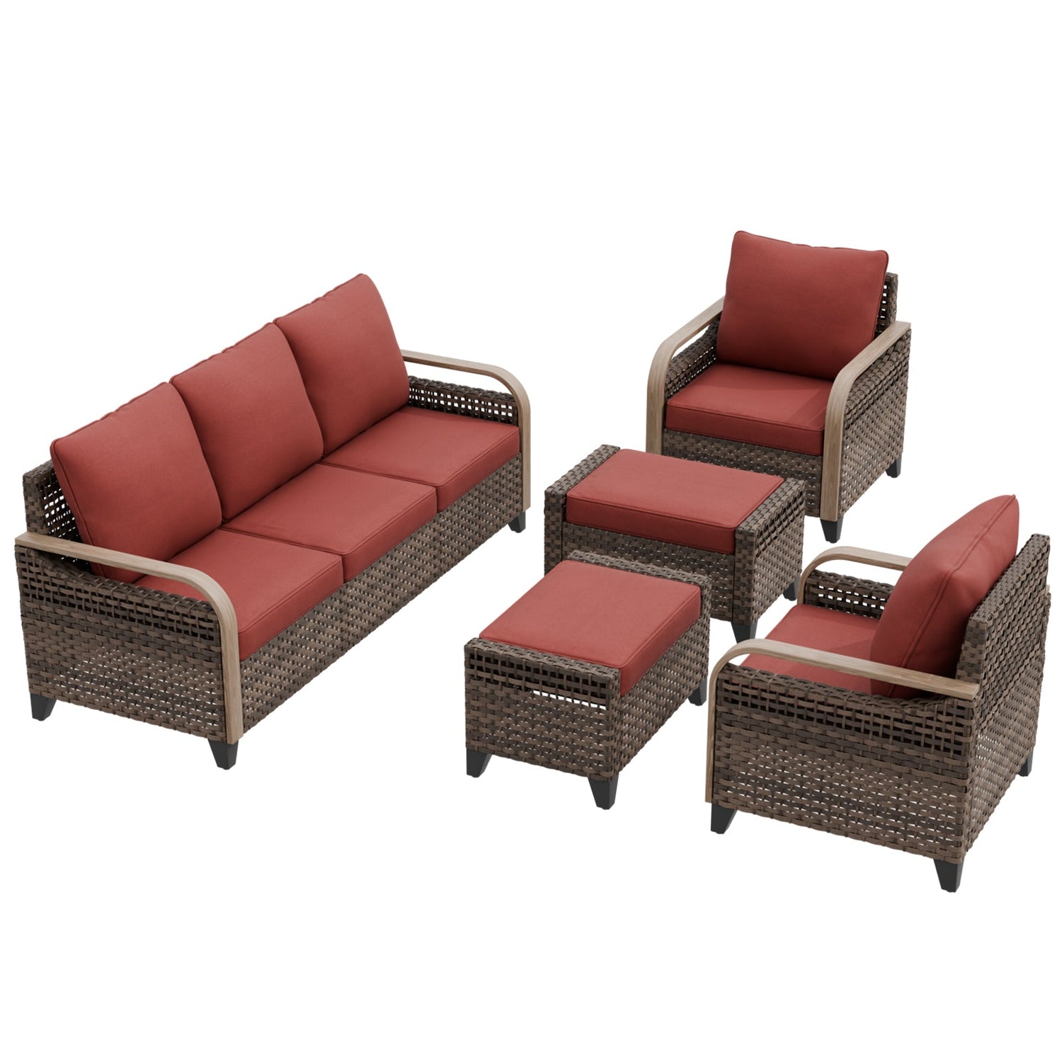 Modern Wicker Outdoor Patio Furniture Set,2 Patio Chairs, 3-Seat Loveseat and 2 Ottomans, 5 Pieces, Brown/Gray