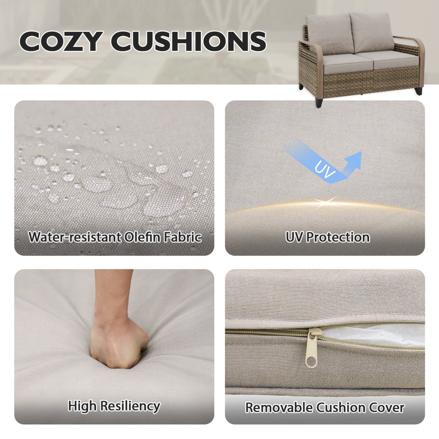 GATHER, RELAX, ENJOY: This wicker conversation set features generously widened seats and plush 5-inch back cushions for ultimate comfort. Designed for outdoor living, it's made with UV protection and weather resistance materials, making this conversation set the ideal choice for stylish, worry-free lounging.
