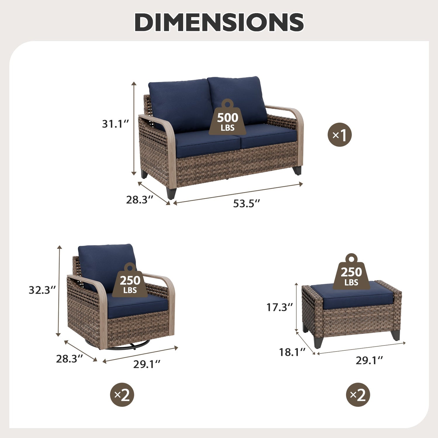STYLISH COMBINATIONS: This wicker outdoor furniture set gives you multiple combinations, including swivel rocking chairs, a 2-seat loveseat sofa, and ottomans. Perfect for any space such as your garden, balcony, deck, patio, porch, poolside, backyard, corridor, or sunroom; this set transforms your outdoor area into a stylish retreat.