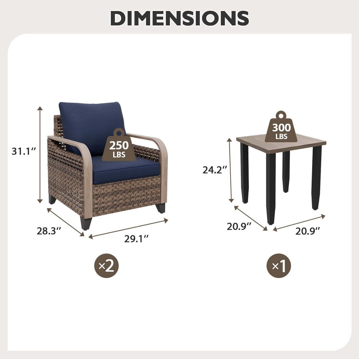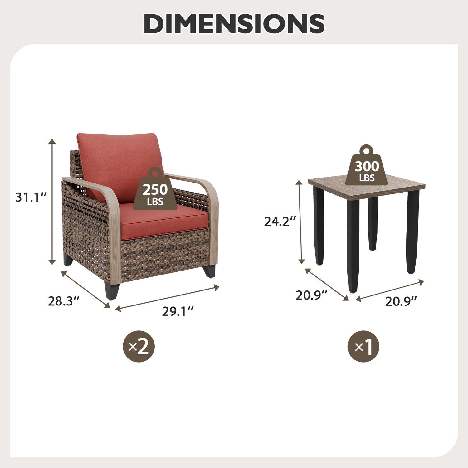 WOOD GRAIN SIDE TABLE: The 3 piece patio bistro set includes an outdoor side table with natural wood grain top over a steel frame for holding drinks, books, phones, and whatever else you may need.