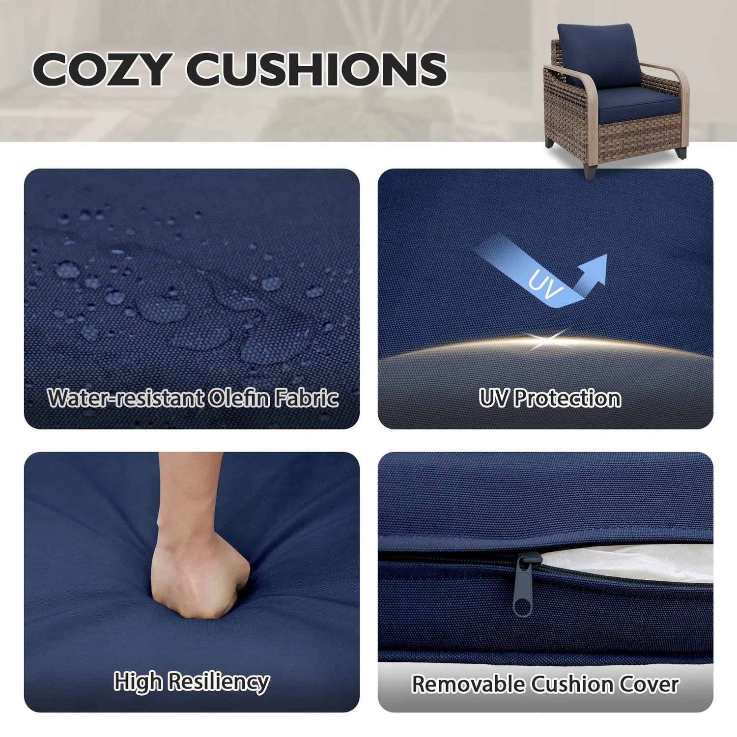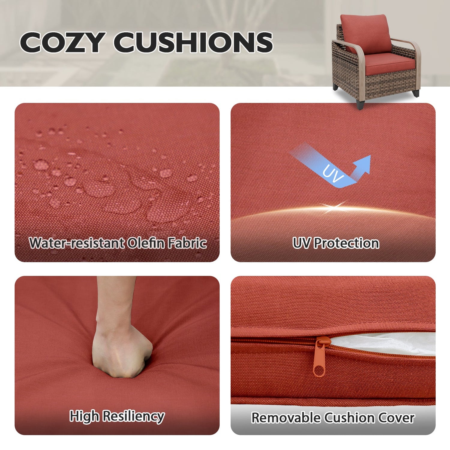 COZY SEAT & BACK CUSHION: The cushion is made with premium olefin fabric and 100% polyester filling. Sink into deep and wide seat with 4 inch thick sponge-padded cushions for the ultimate patio seating experience. The 5 inch back cushion adds to great comfort level.