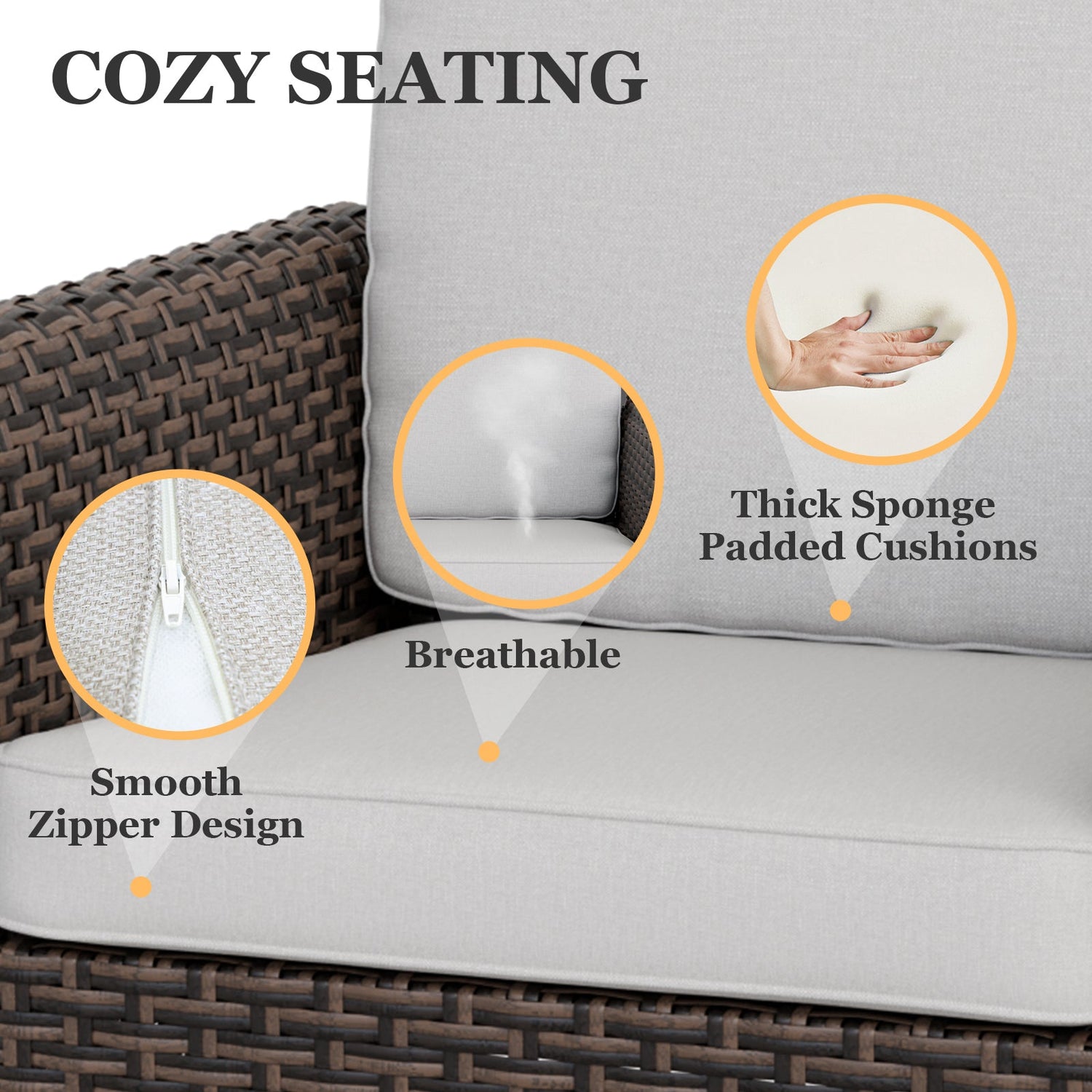 COZY SEATING: Experience the ultimate relaxation in the plush 4 inch thick cushions, crafted from soft, durable, UV resistant fabric. Filled with 100% polyester, these cushions support hours of seating, while the removable and machine washable covers make upkeep effortless.