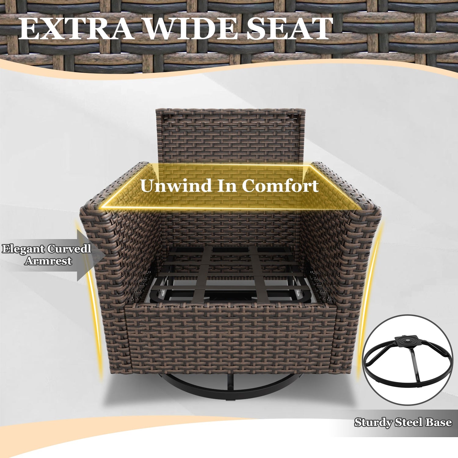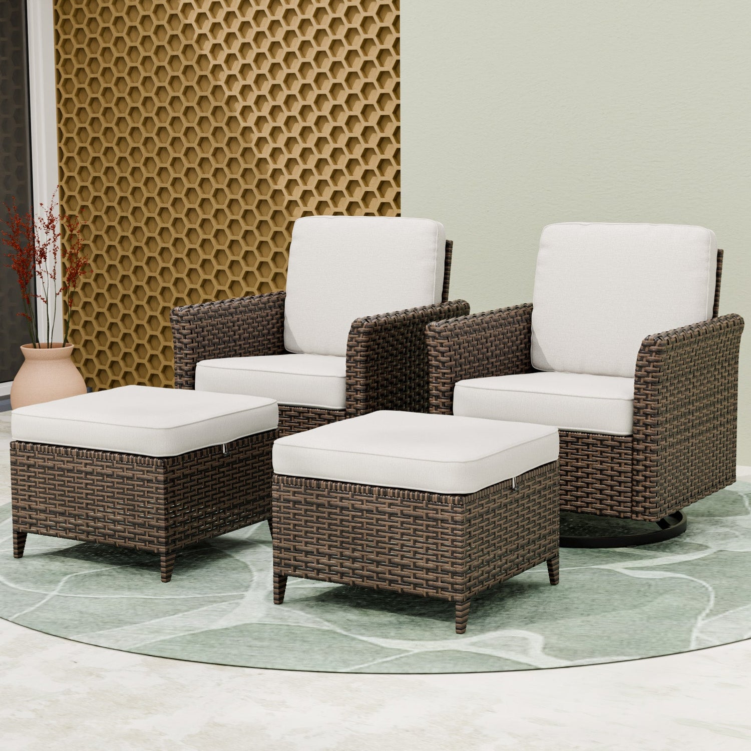 CLASSIC DESIGN: Transform your outdoor space with this timeless 4 piece wicker patio set, featuring 2 swivel rocking chairs with a smooth 360 degree gentle gliding motion, and 2 ottomans. The combination of woven rattan and deep, soft cushions adds both comfort and style; perfect for patios, decks, porches or backyard lounging.
