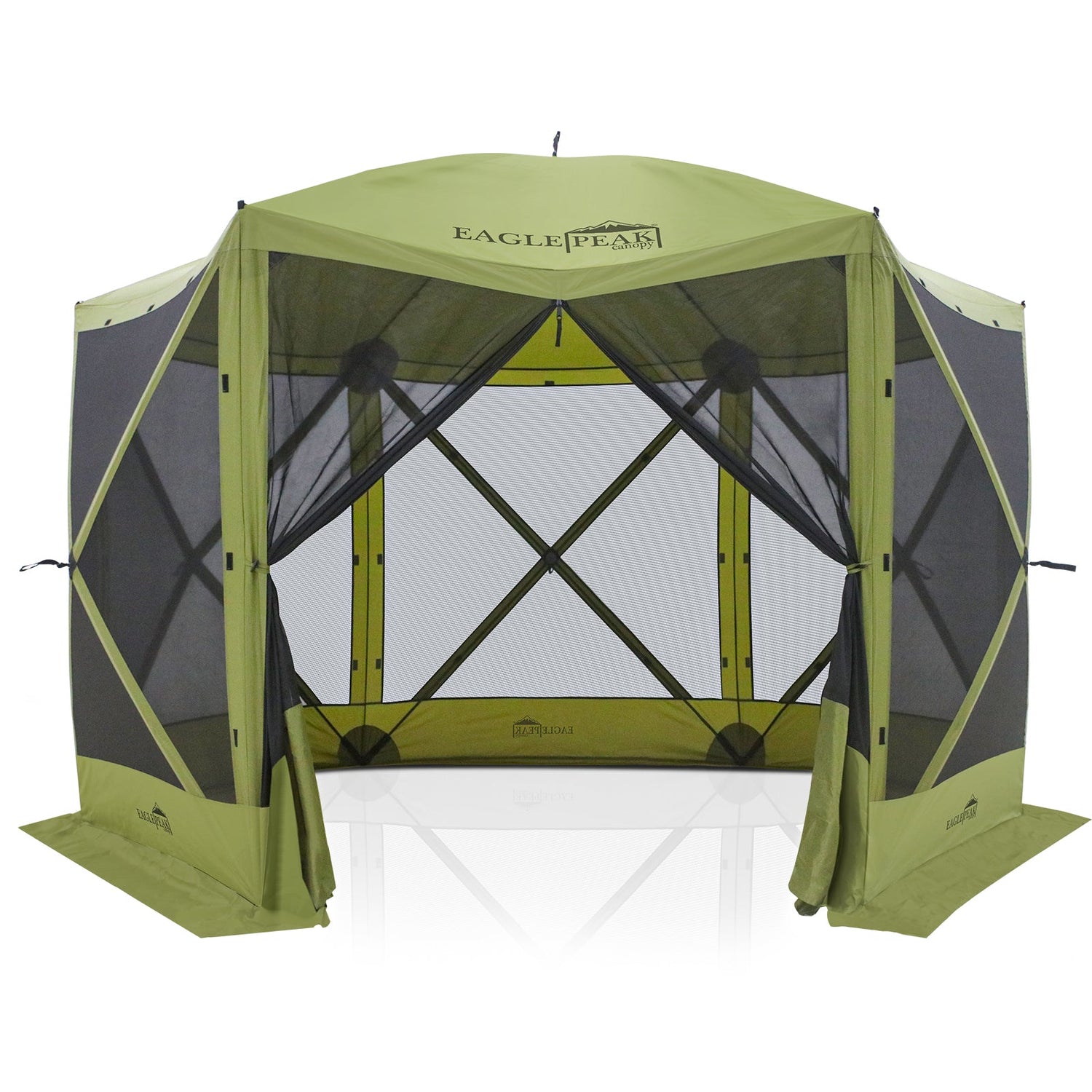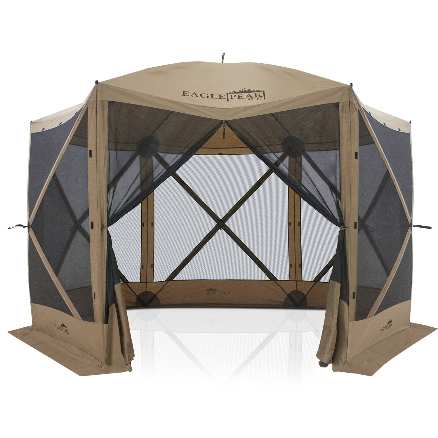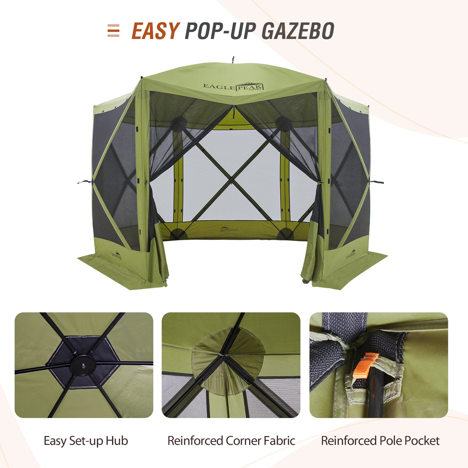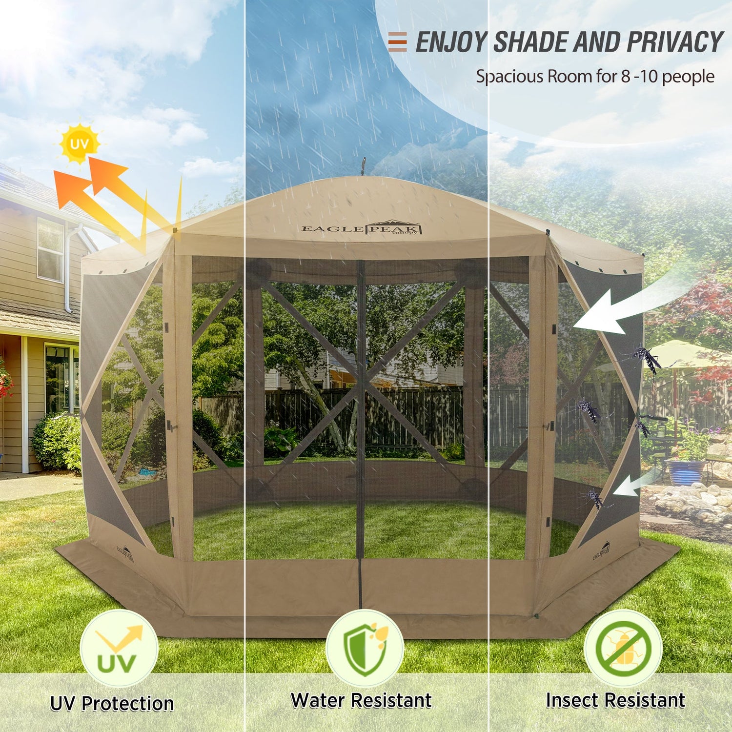 PREMIUM MATERIALS: The EAGLE PEAK 6-sided gazebo is made of sturdy fiberglass poles and is covered with a breathable 210D water-resistant Oxford polyester fabric. It protects against light rain and offers a UV Protection Rating of 50+.