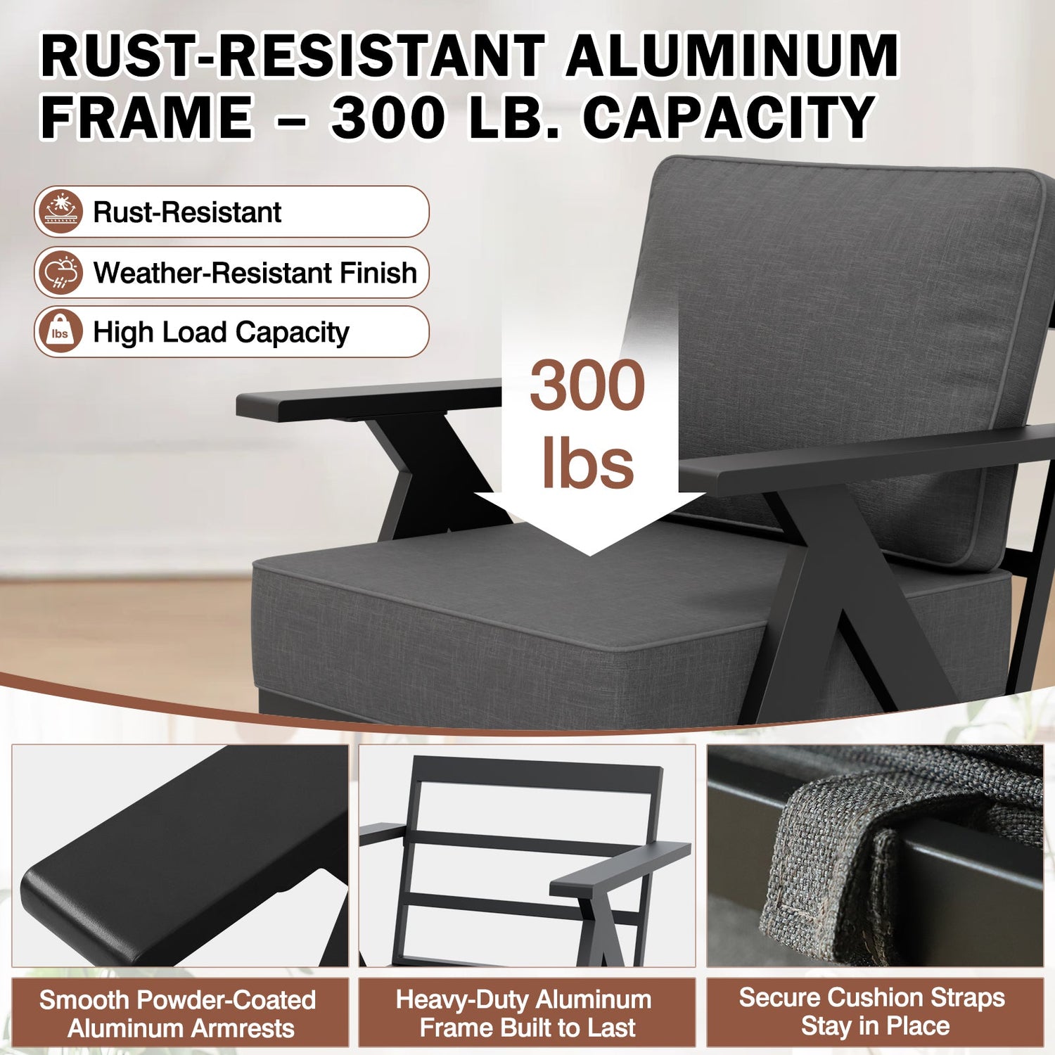DURABLE METAL CONSTRUCTION: Crafted with a heavy-duty, powder-coated steel frame, this outdoor furniture set is designed for long-lasting performance in any patio, garden, deck, or backyard setting. Its weather-resistant, rust-resistant finish ensures your outdoor lounge area stays stylish and protected season after season