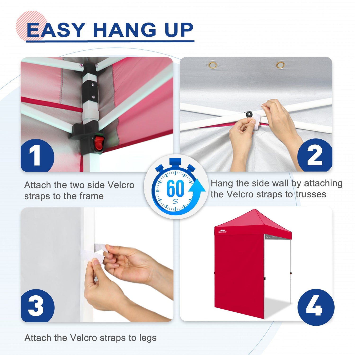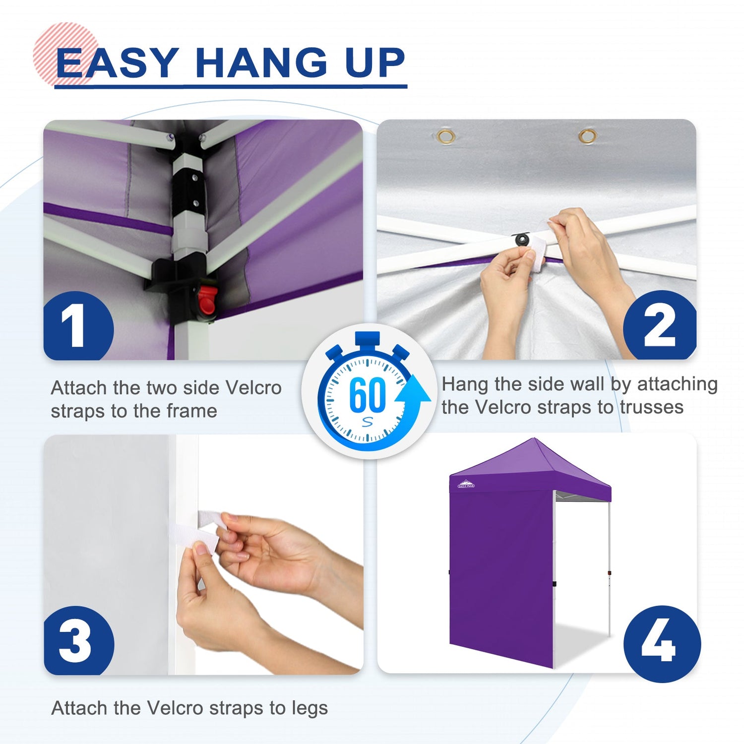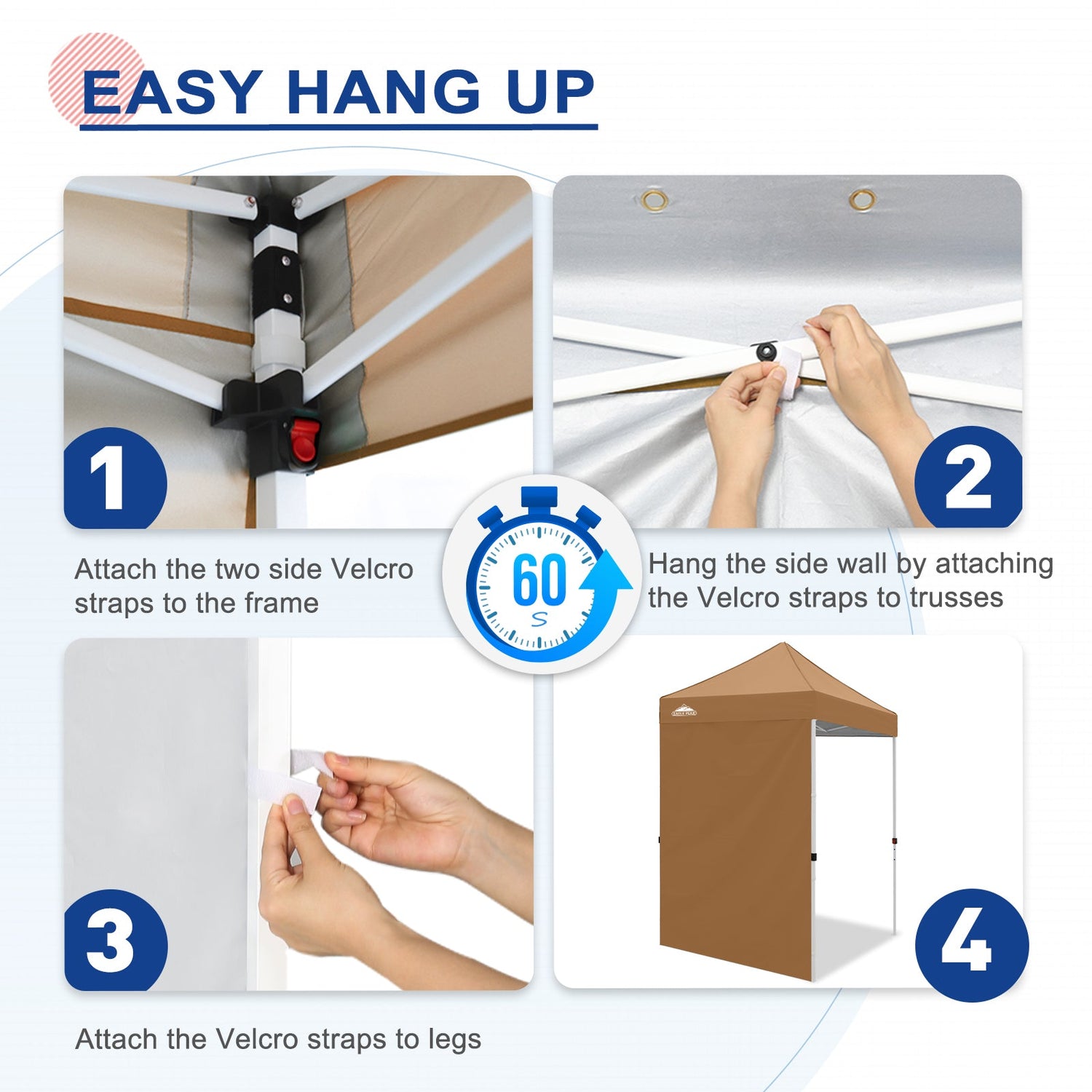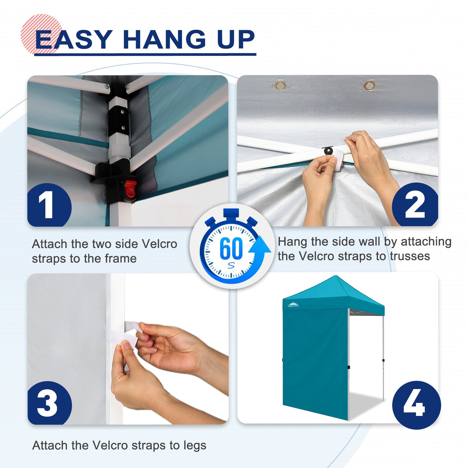 Easy Setup: Easily secure the sunwall to the canopy eaves trusses using the Velcro tab straps on the top edge of the wall, and 8 Velcro tab straps along its sides to secure around the legs of a canopy frame.