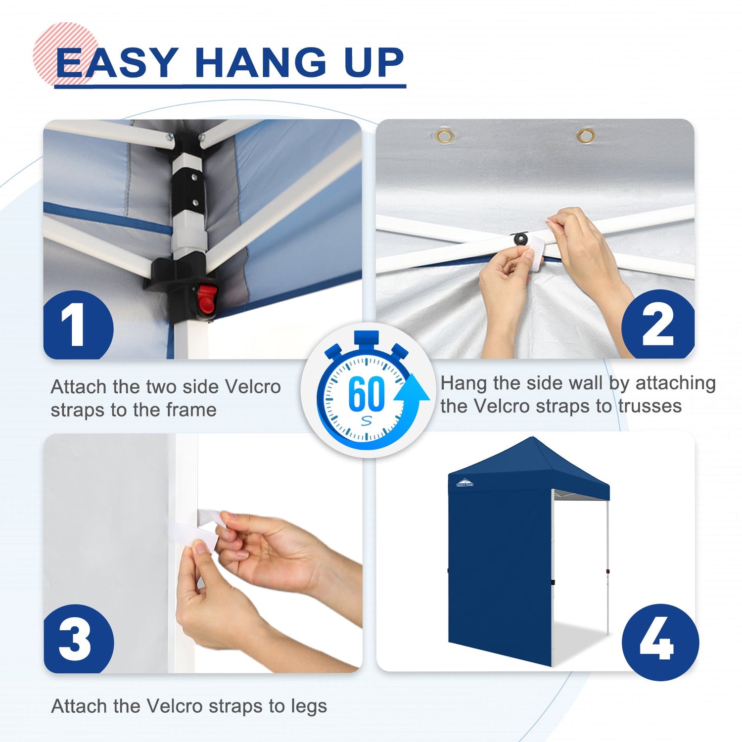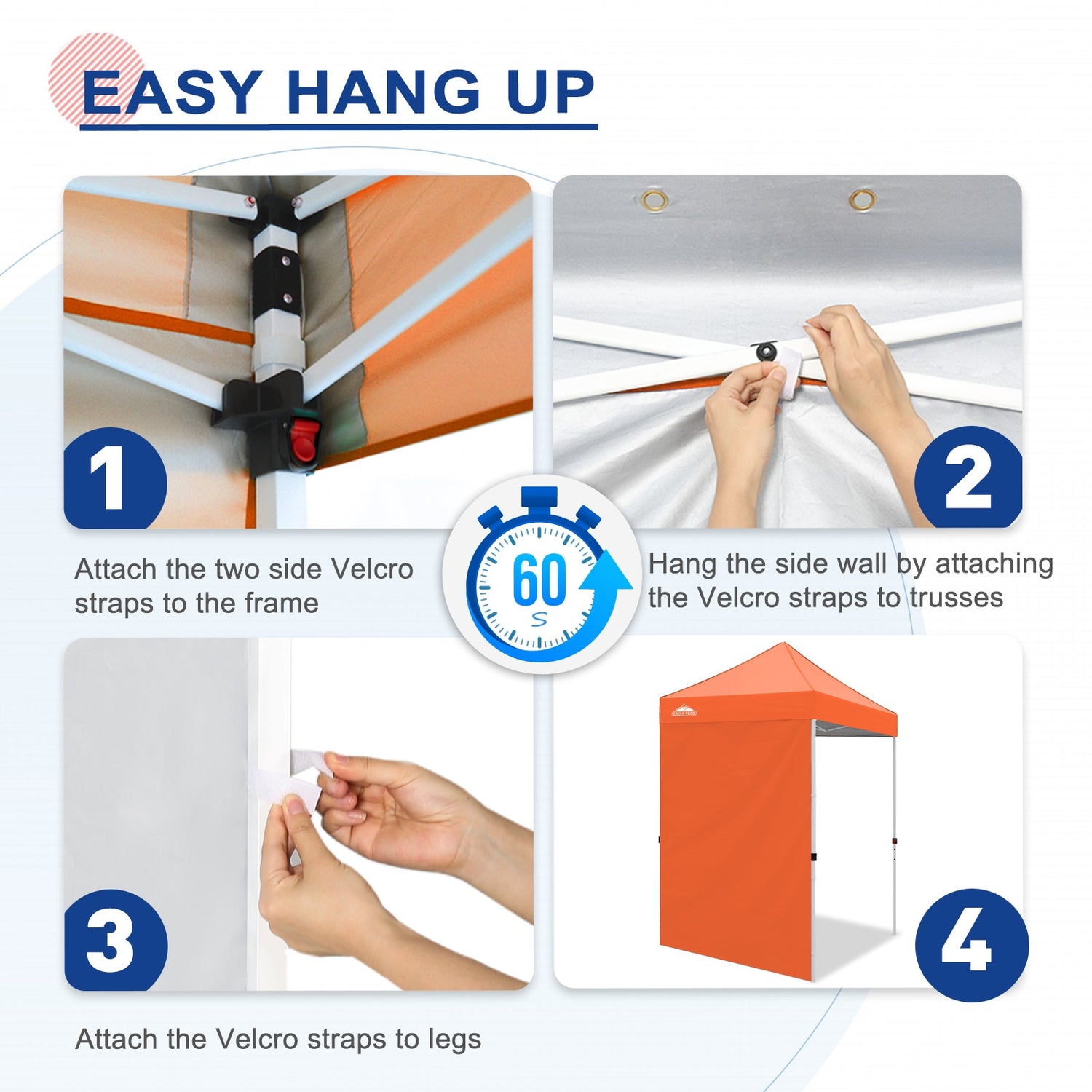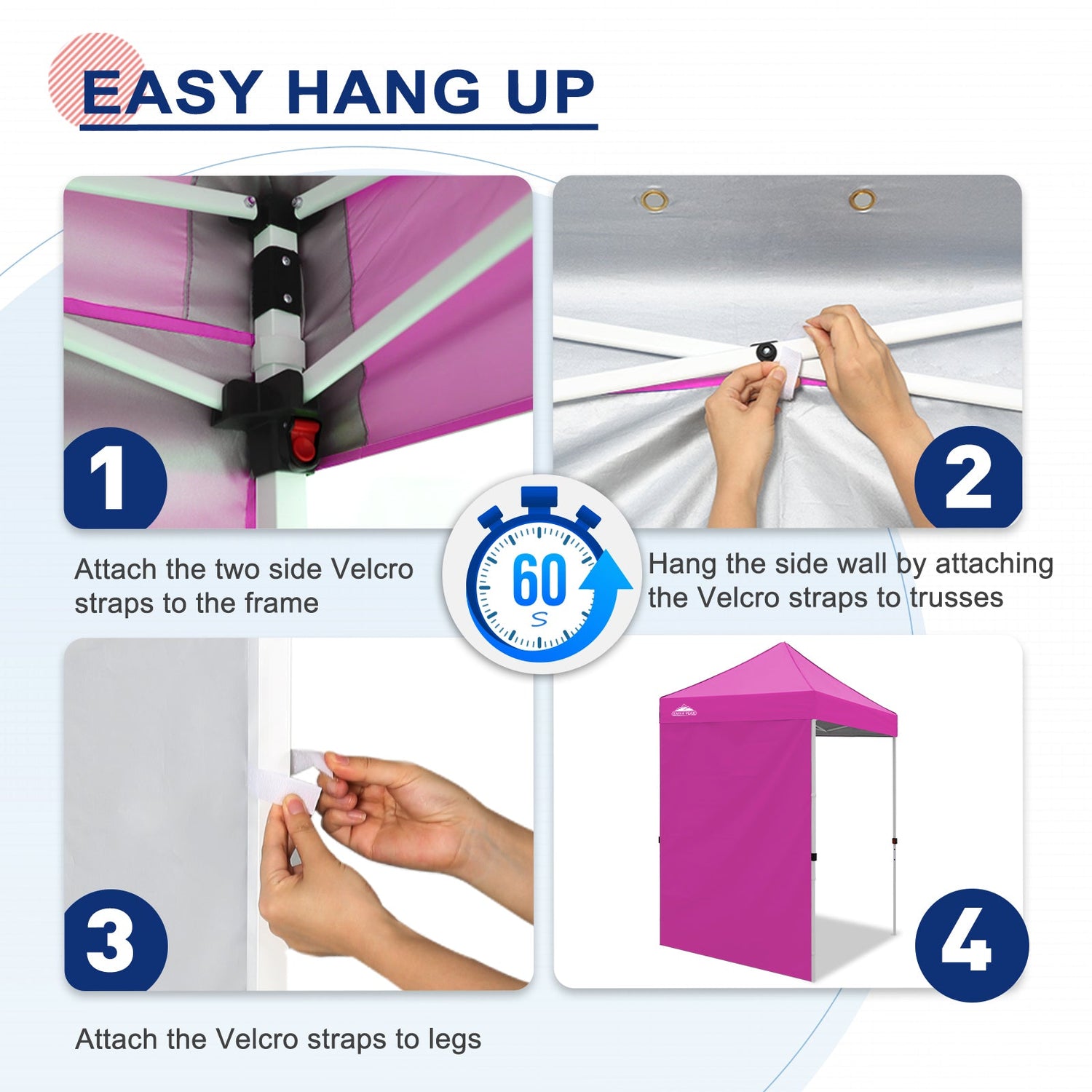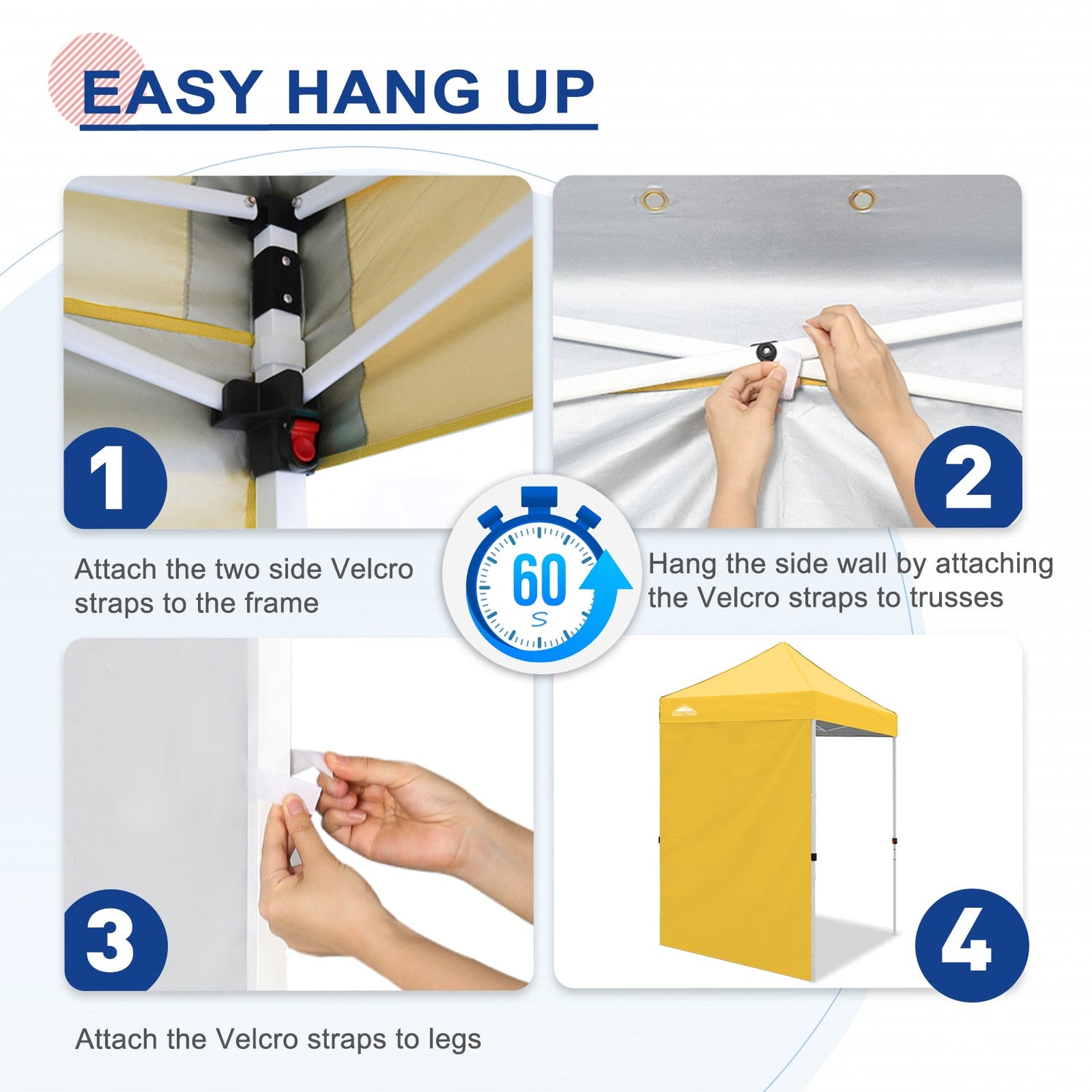 Easy Setup: Easily secure the sunwall to the canopy eaves trusses using the Velcro tab straps on the top edge of the wall, and 8 Velcro tab straps along its sides to secure around the legs of a canopy frame.