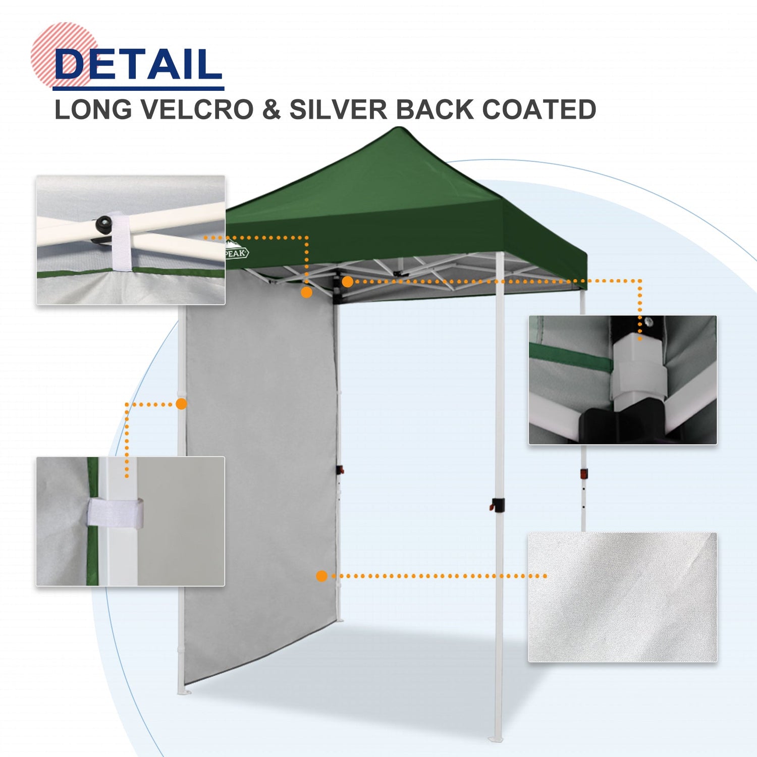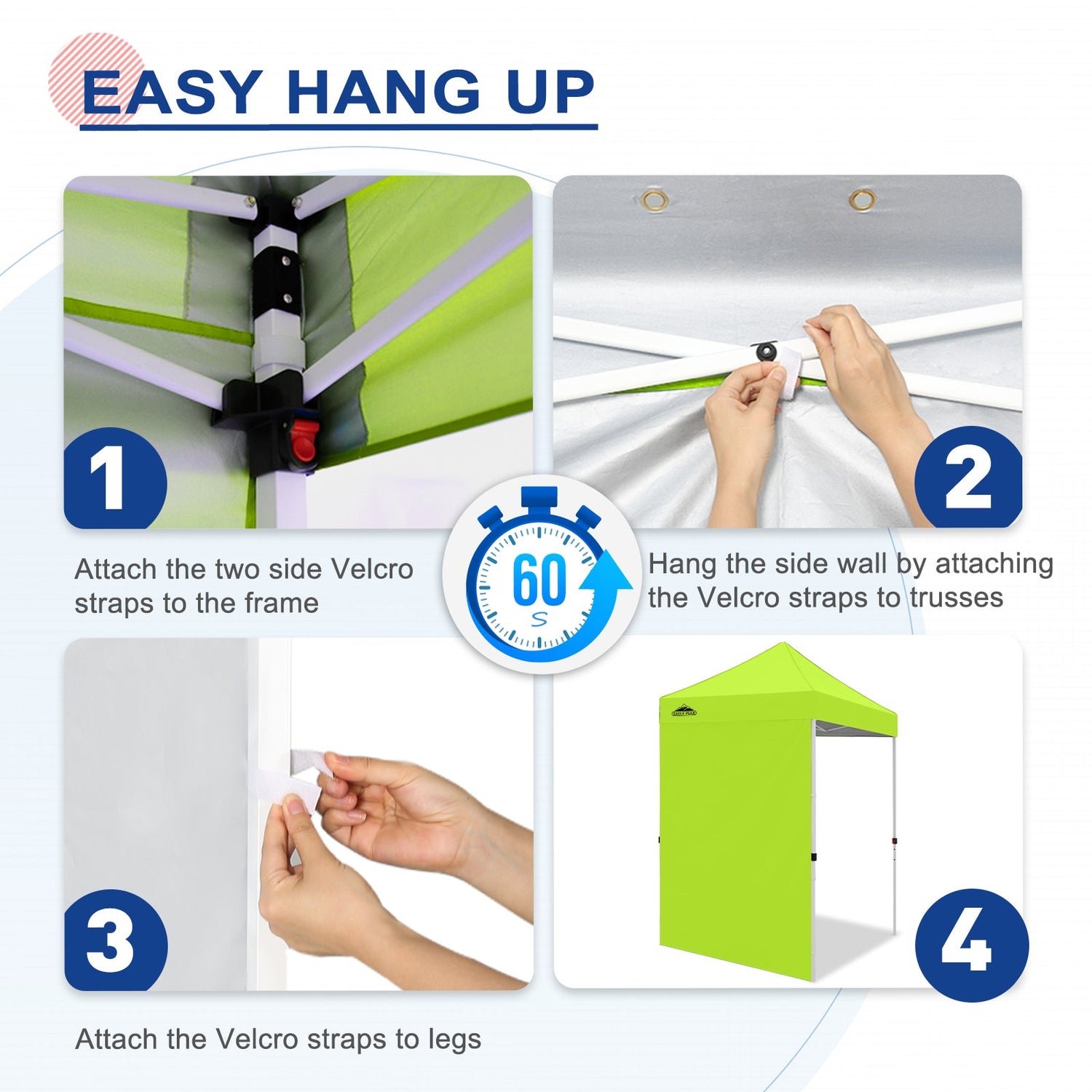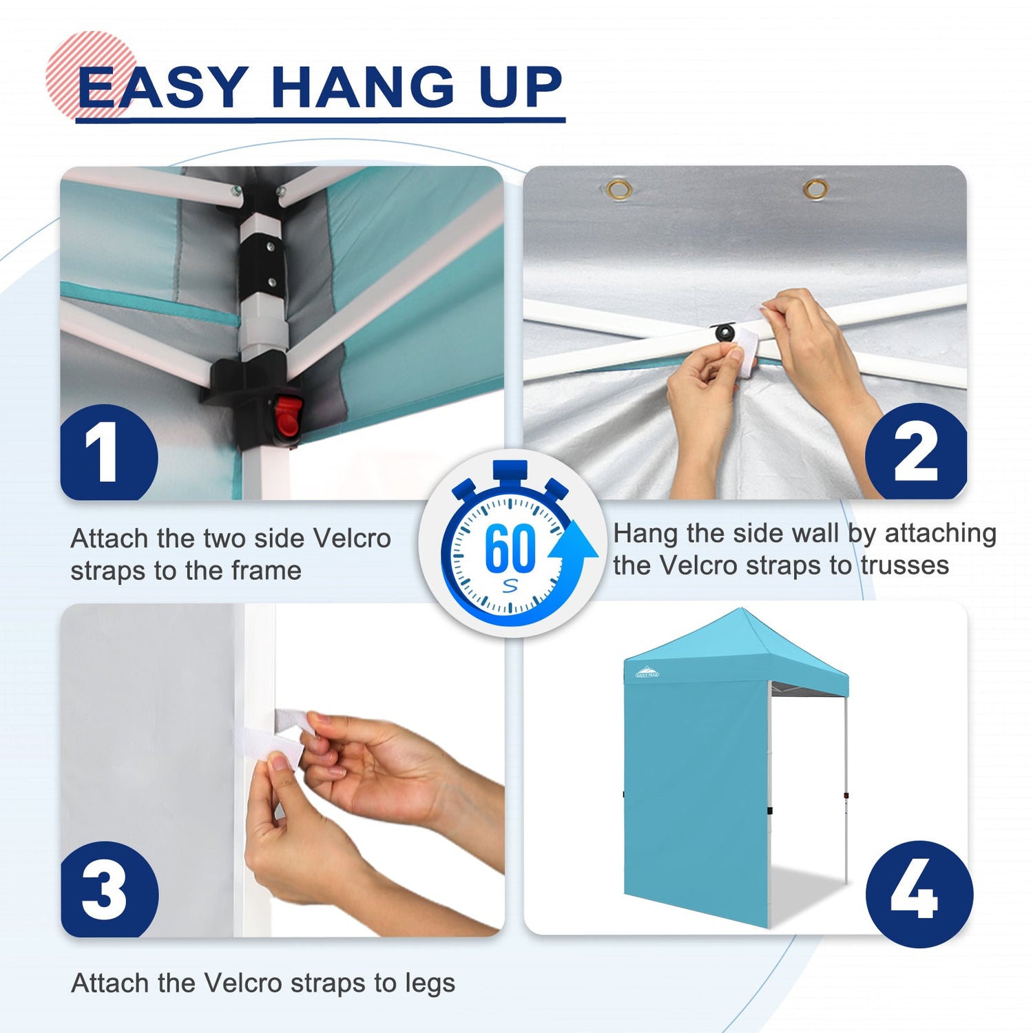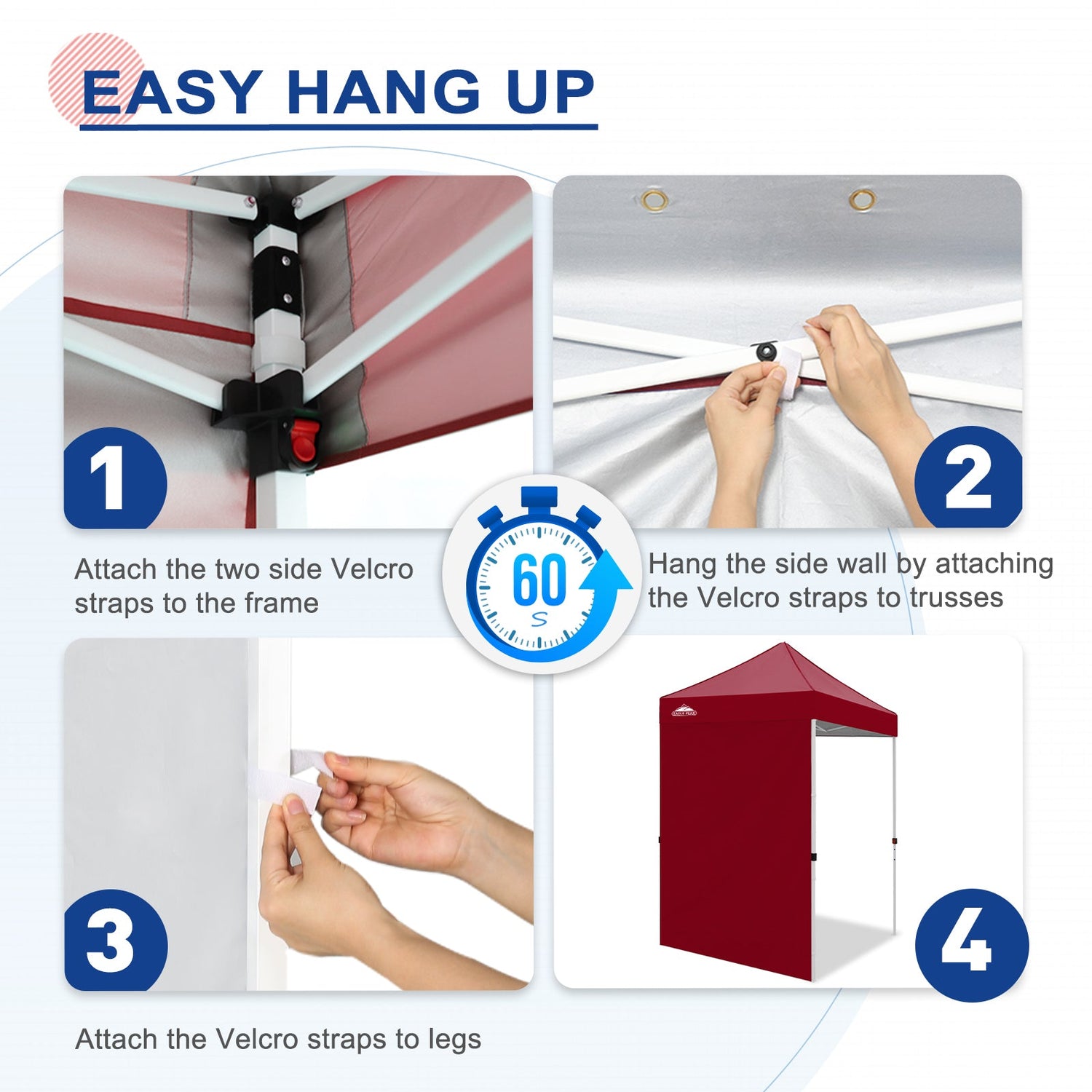 Easy Setup: Easily secure the sunwall to the canopy eaves trusses using the Velcro tab straps on the top edge of the wall, and 8 Velcro tab straps along its sides to secure around the legs of a canopy frame.
