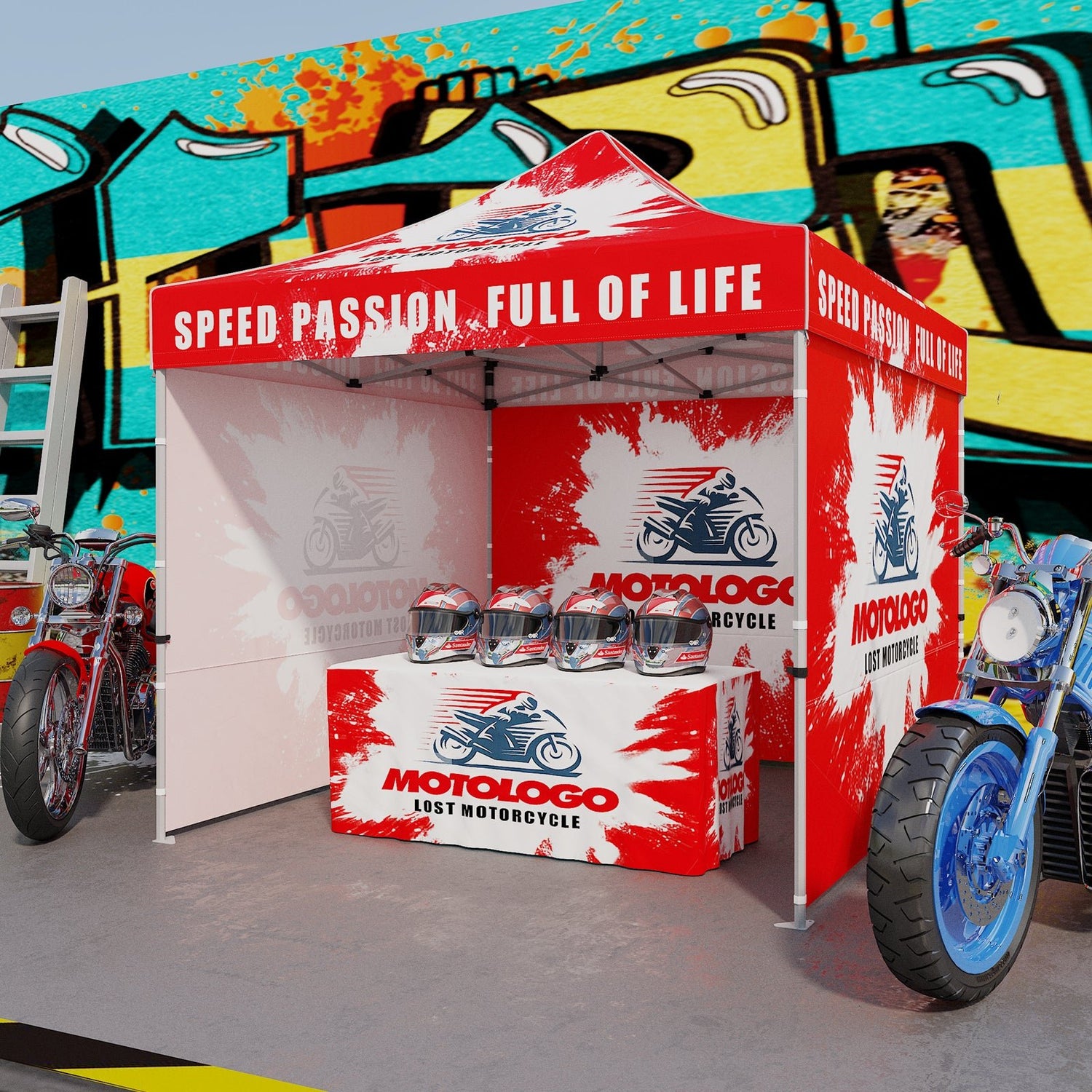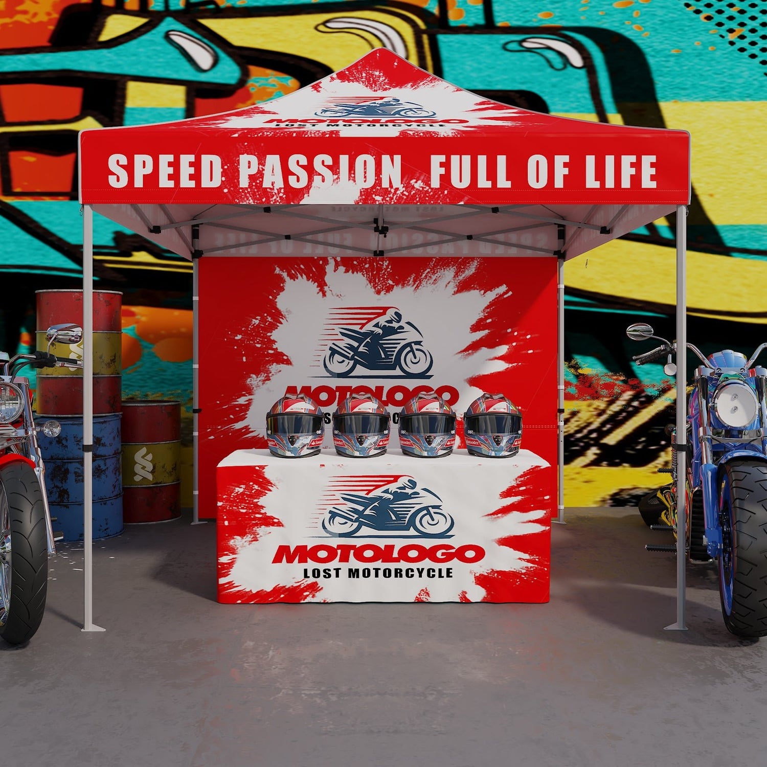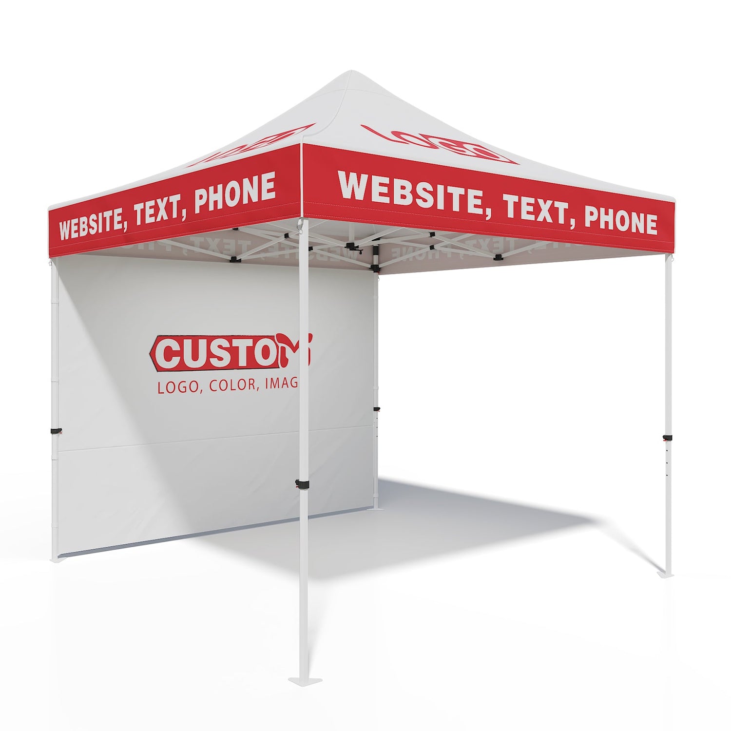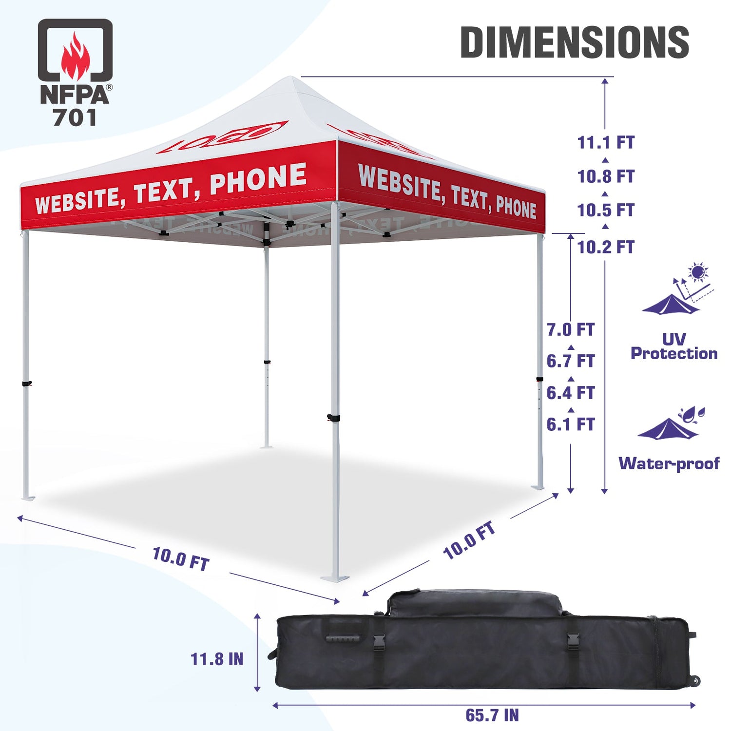 CUSTOM PRINTING: Your logo and design can be printed with 100% coverage on all outer surfaces of the canopy top, and wall panels. Complimentary products such as table covers, flags, and other accessories can also be ordered separately to promote your company and brand.