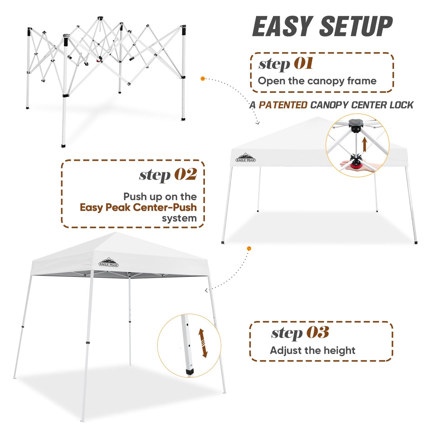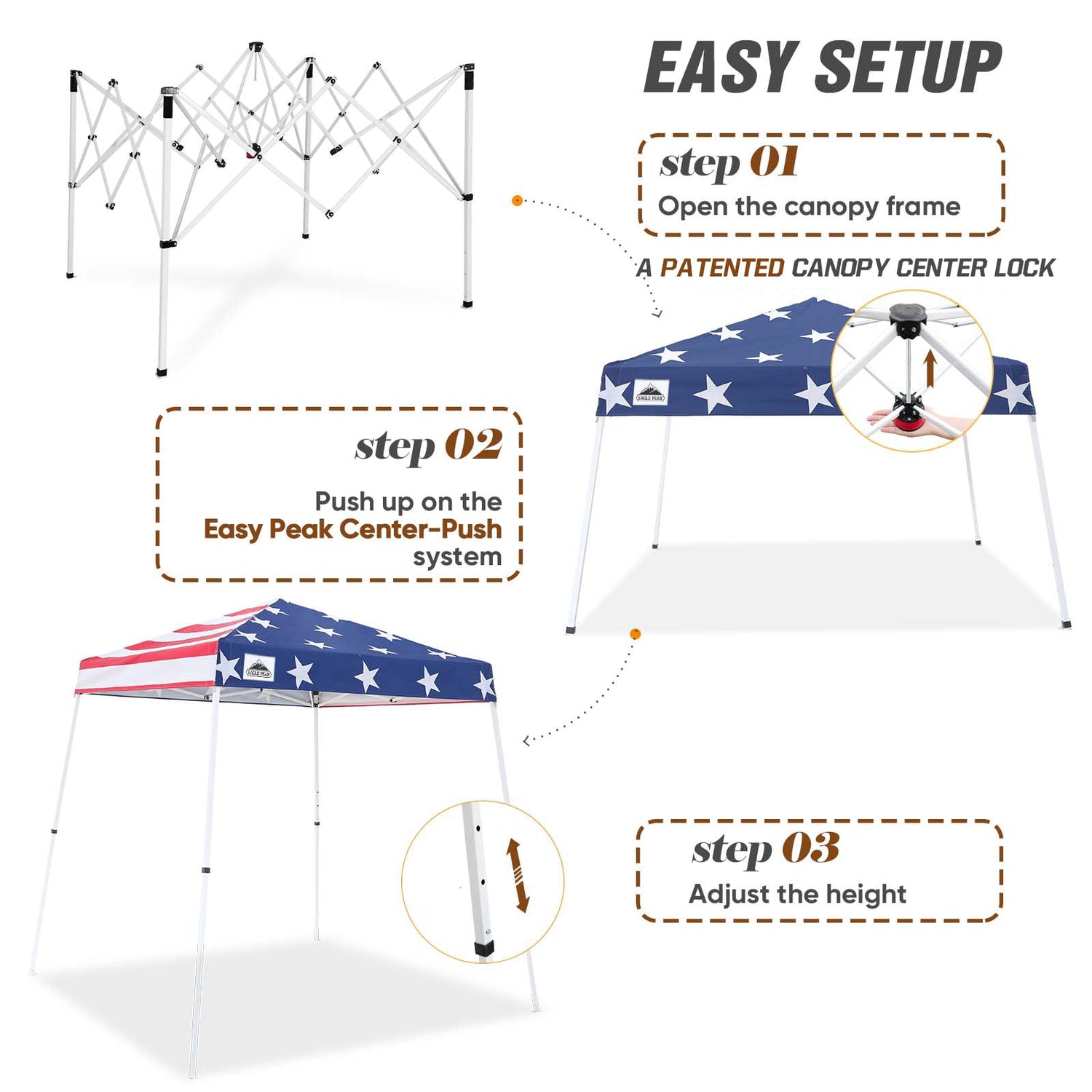 EASY SETUP: This easy setup pop up canopy tent features the Peak Push system, a patented canopy center lock. The portable canopy requires no tools and easily opens and closes from the center in seconds. Its unique canopy tent center lock enables a quick, one person setup, letting you maximize outdoor time with minimal effort.