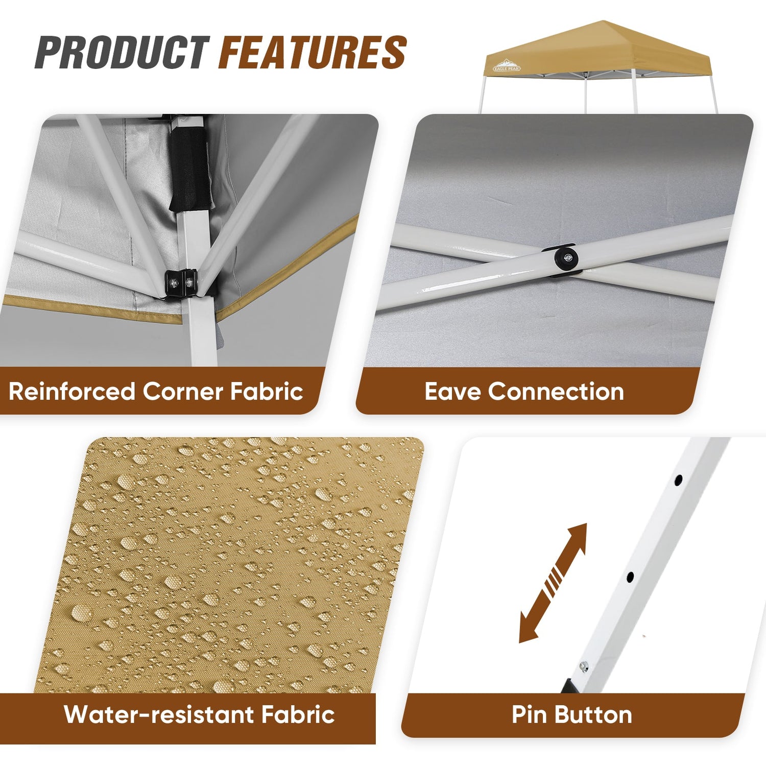 EASILY ADJUSTABLE: The leg height has three settings to quickly adjust the canopy height and angle to maximize shade throughout the day. 36 square feet of shade, large enough for 5 people. (Slant leg design is 8'x8' at base and 6'x6' at the top).