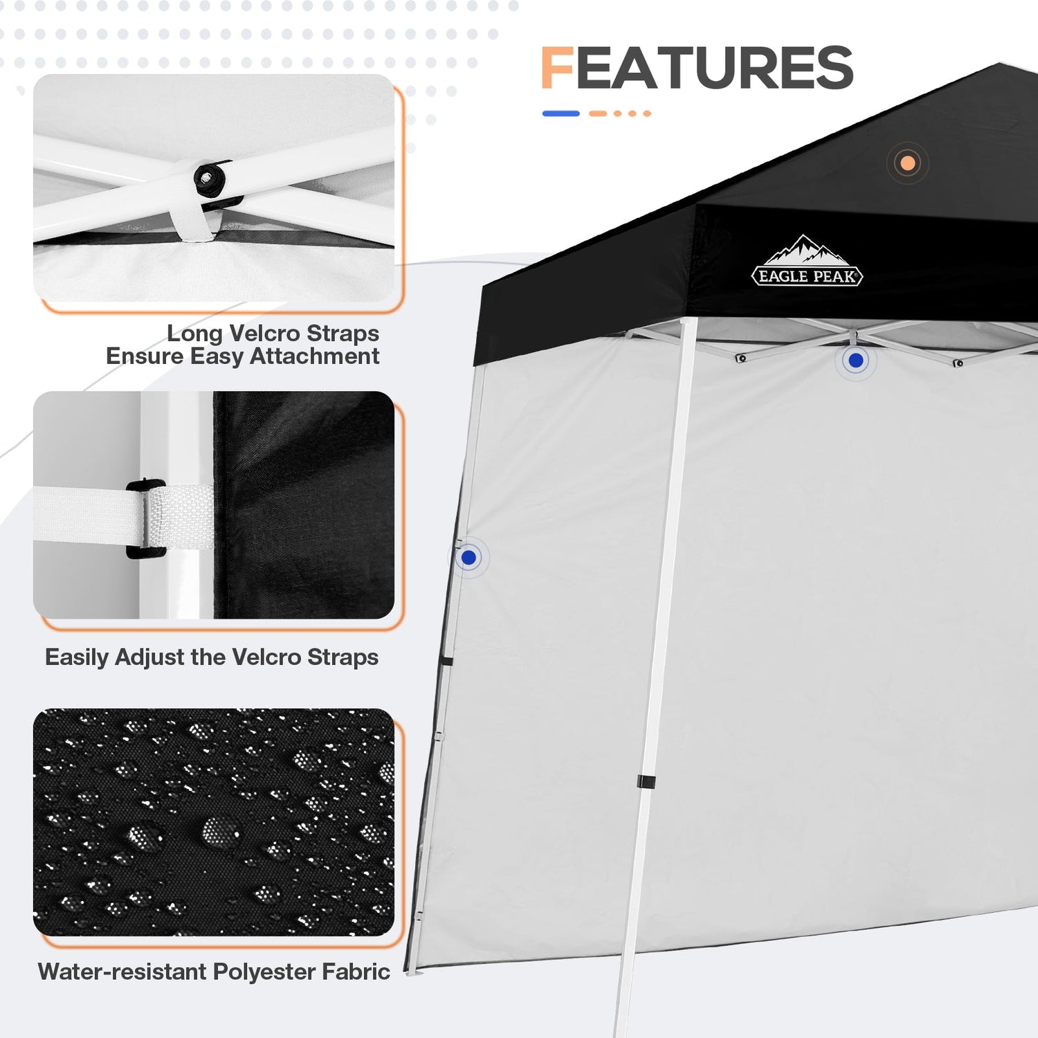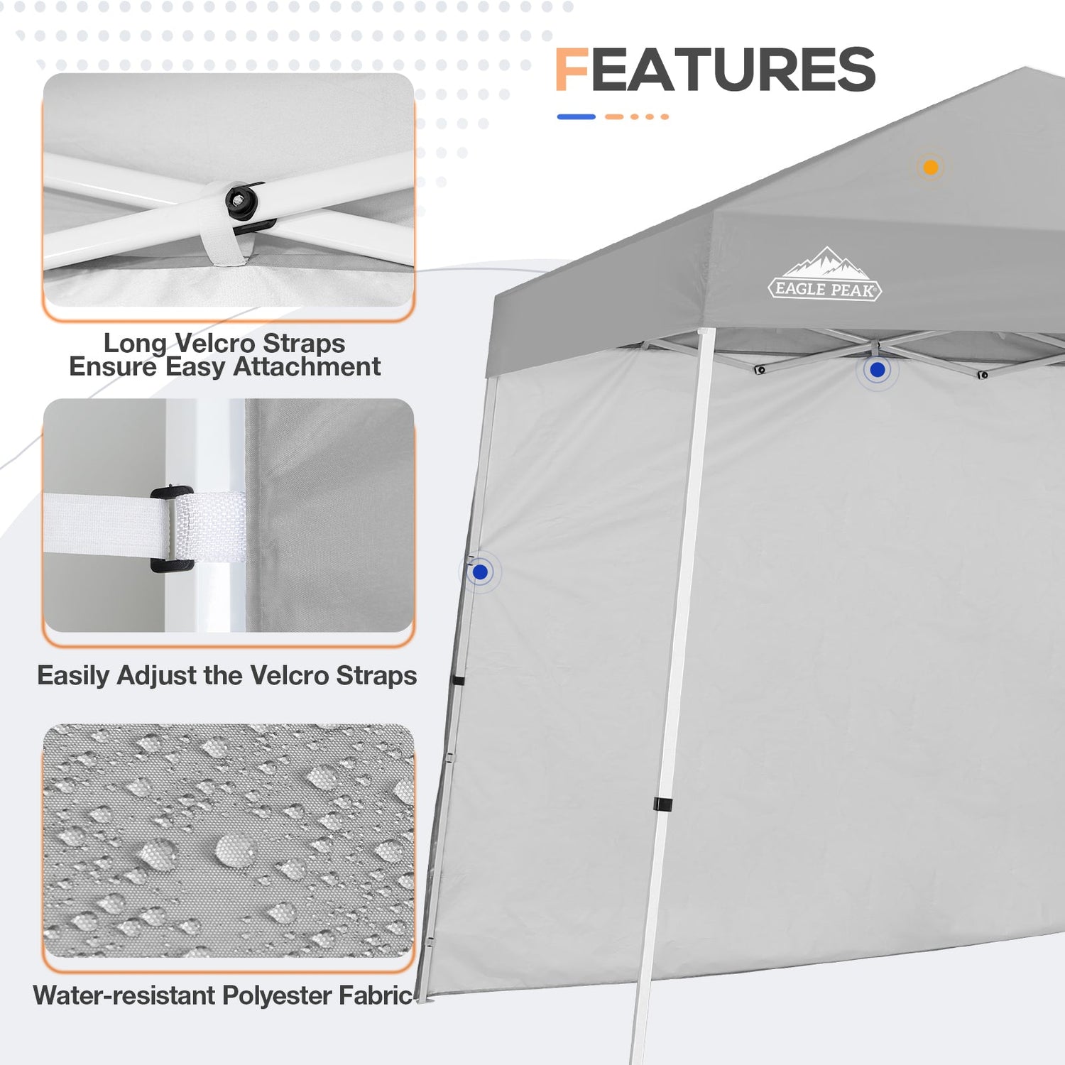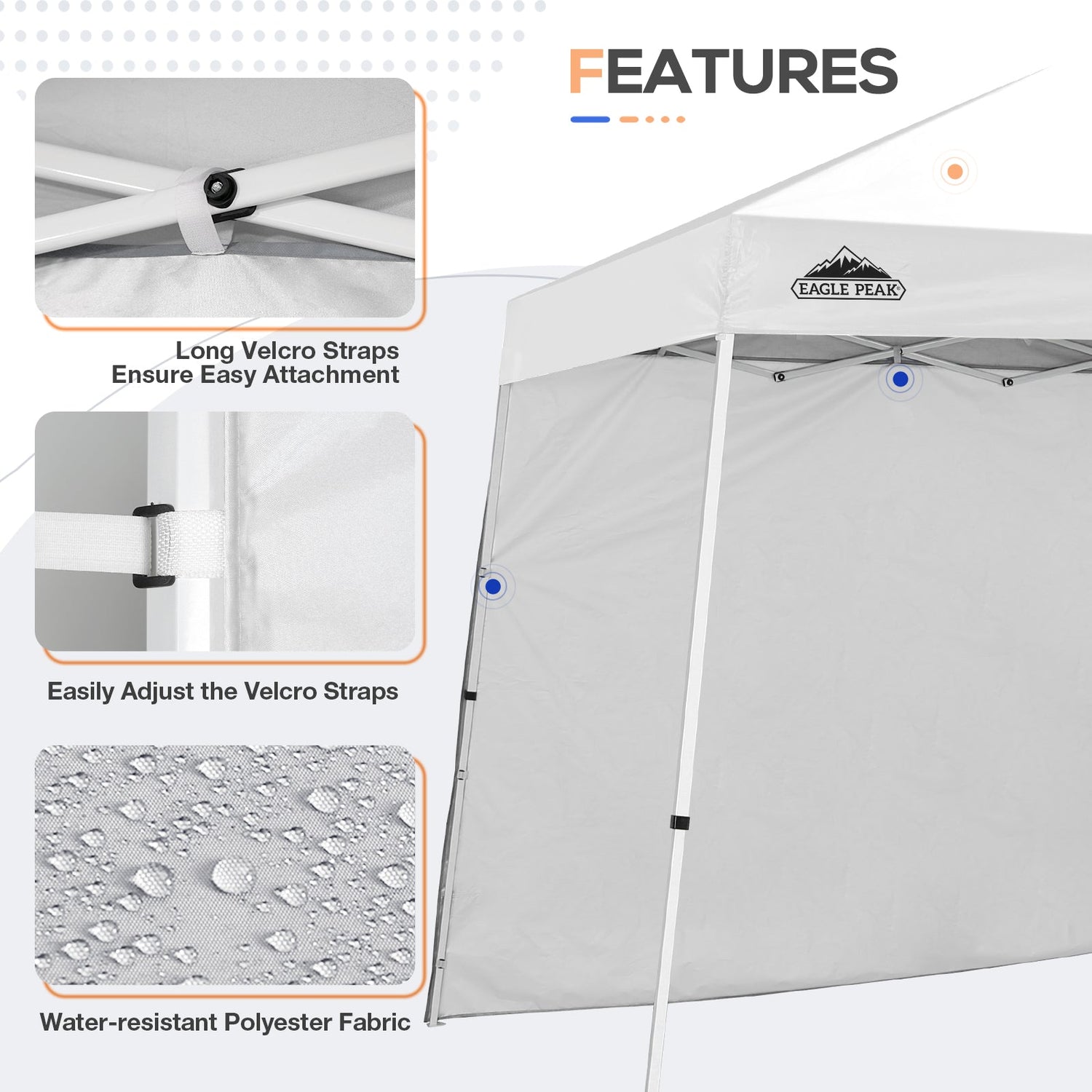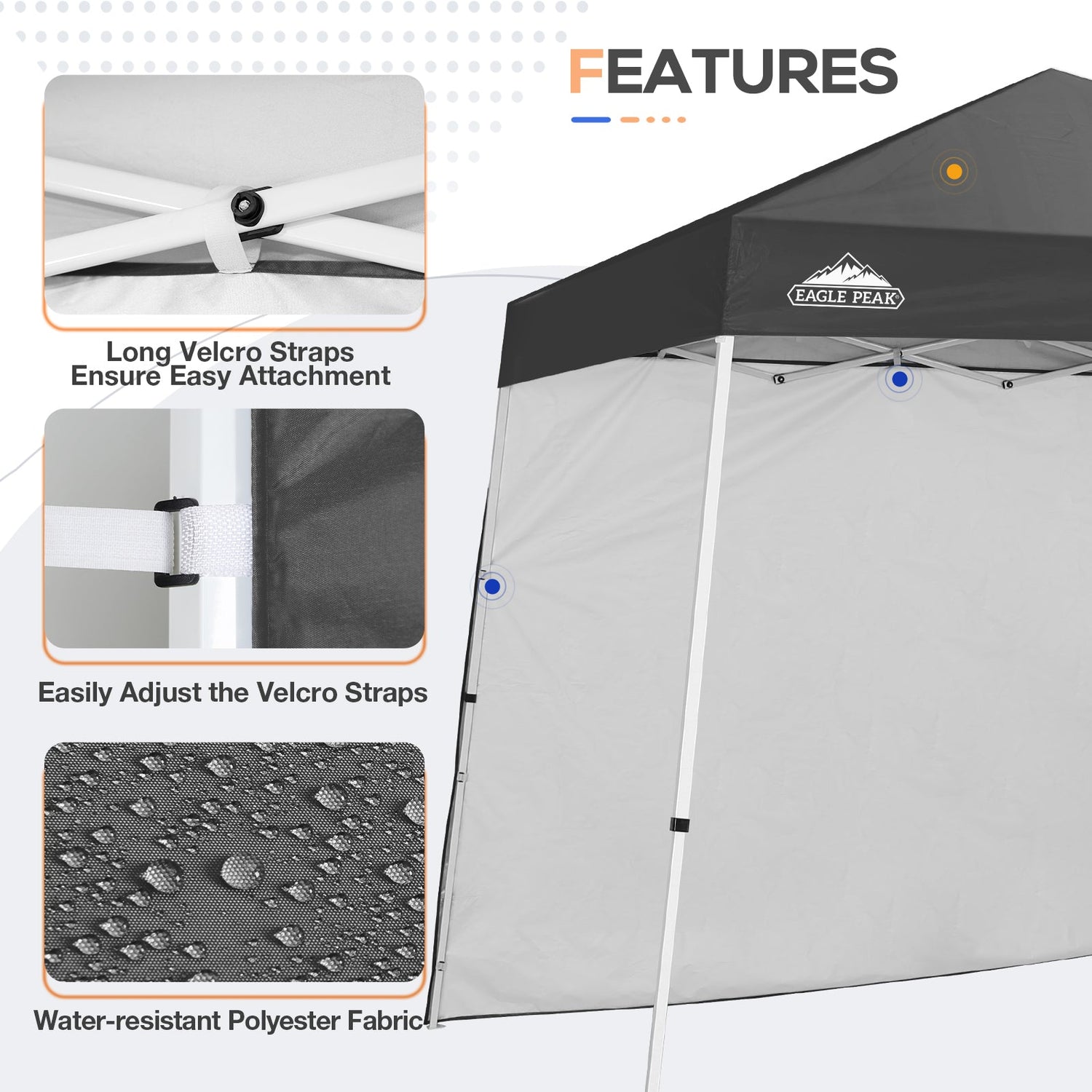 Fit For: This Eagle Peak sunwall measures 95'' top x 114'' bottom x 79'' H, fits for the EAGLE PEAK slant leg canopy 10x10. One sidewall is for one side of the 10x10 instant pop up canopy.